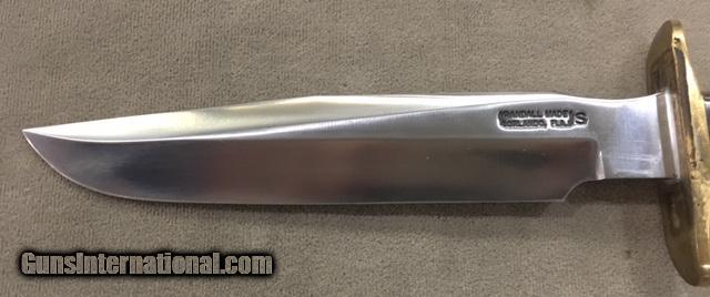 Description: From an Operation Iraqi Freedom vet comes this nice Randall Model 16 SP1 Fighter, with factory engraving on the blade as photos show. Knife was special ordered with as close to OD Micarta handles as could be had at the time, with finger grooves. The 7 inch stainless blade is made from 1/4 inch stock and is perfect and is unsharpened since leaving the factory. Brass cross guard has some verdigris from storage in the sheath which will easily remove with no ill effects but we shall let the buyer do his own cleaning. We do not know what OPERATION BOOMERANG is or was, but that is what the original owner was doing in Iraq, and we are led to believe it was classified situation at the time he was there. SOLD |