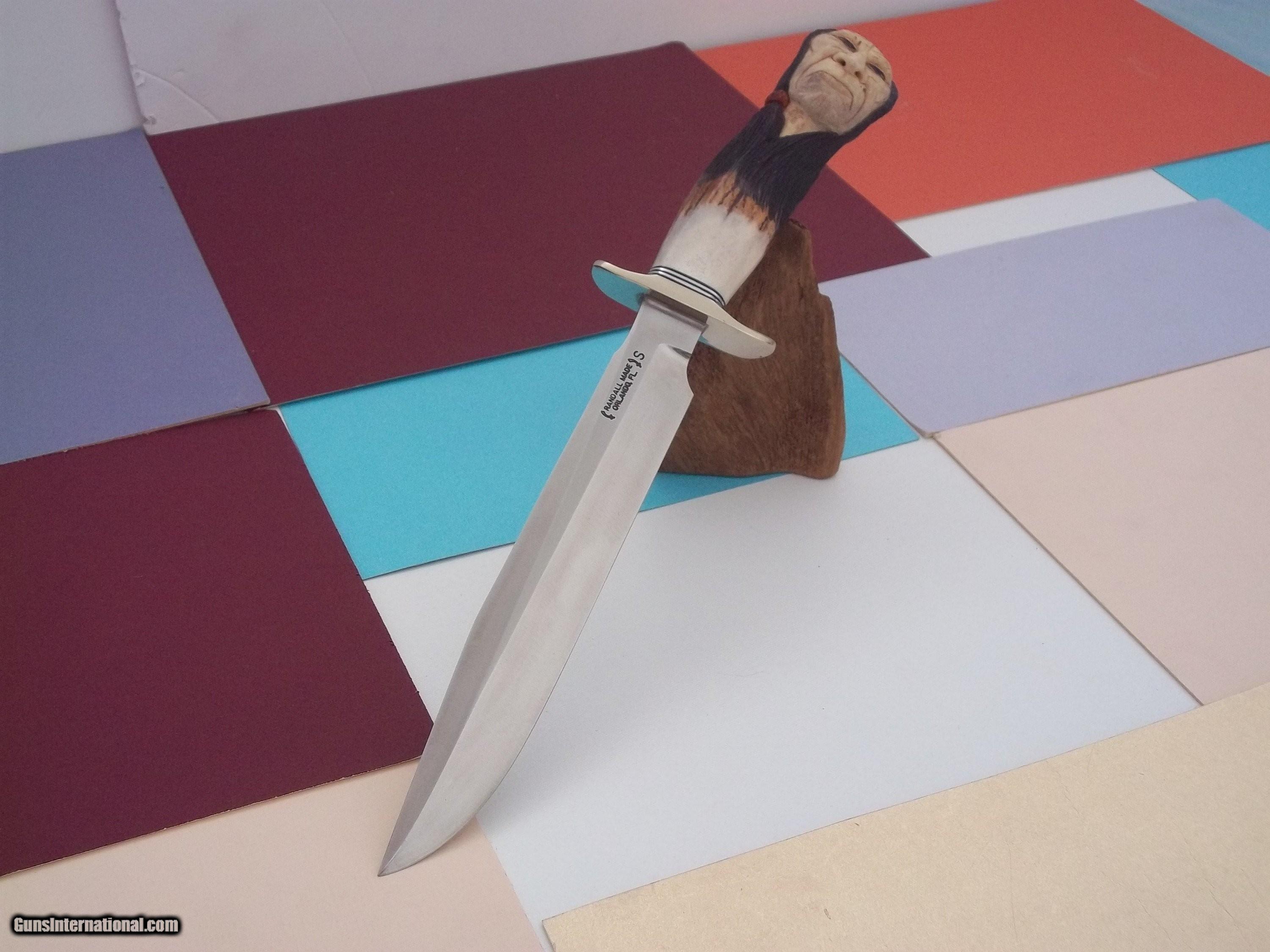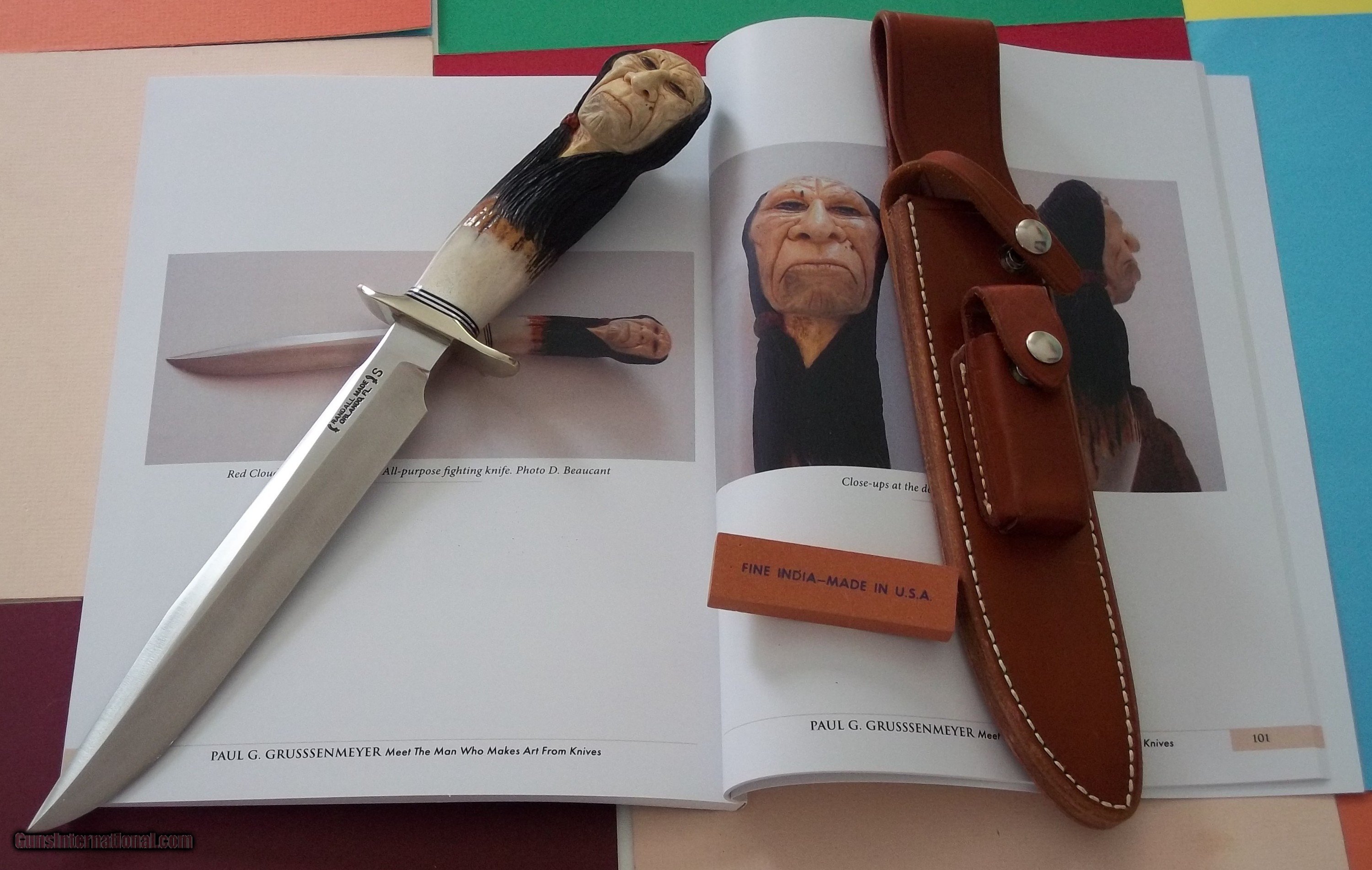 Description: Exceptional and stunning Randall model # 1-8" All-Purpose Fighting Knife, stainless steel blade, German silver double guard with matching German silver and black spacers, extra large and exquisite carving of Indian Chief "RED CLOUD" in the selected India Sambar stag handle by Paul G. Grussenmeyer with dental composite resin, hand painted eyes, original brown leather scabbard with sharpening stone. The surface area of the carving is twice as large as the carving of a Randall Bear Bowie titled "JEDEDIAH" carved by Grussenmeyer which got sold on htissite. See photo # 6 that denotes a large "G" for Grussenmeyer as all the carved knives he did are signed that way. This model is one of the flawless Model # 1 I've ever seen or own-as all the Randall knives that were made for Paul G. Grussenmeyer denotes the most beautiful blade, general appearance in workmanship knowing that they will be carved by this exceptional and very talented artist. Sold "AS IS." All sales are final. Free shipping USPS with insurance tracking # and signature required. 1993 production. Please note that I do not engage in any type of trade. Thank you for looking. Incidentally this is the second most expensive carved Randall ever done by Grussenmeyer, as the highest embellished model was a Randall Bear Bowie with a Timber wolf carving. This is the oly left Randall Made Knives I have for sale to date. NOTE: Paul G. Grussenmeyer Meet The Man Who Makes Art From Knives Soft Cover Book of Only 24 Units Luxury Collector's Edition is included in the sale, as the most comprehensive work on Paul G. Grussenmeyer. Jam-packed with over 177 never-before-seen photographs in full color, and inside information on the life and times of Grussenmeyer. Just released in a (8.5"x 11") in a soft cover format. This is a new 120-page special limited numbered luxury "Collector's Edition" of only 24 units. Price of $250.00 includes USPS shipping with tracking number and signature required. There will be no reprint. If interested order (s) are being kindly accepted. There are 20 different Randall Made Knives shown in the catalog out of 25 which were ordered thru the Randall shop over a period of four years, Grussenmeyer still has one model left and the remaining four can be seen in the Randall Museum, in Orlando.. Thank you for looking. Price: $4,495.00 Contact Seller |