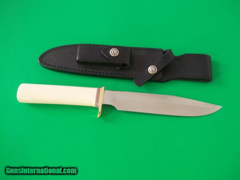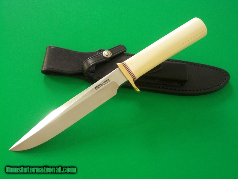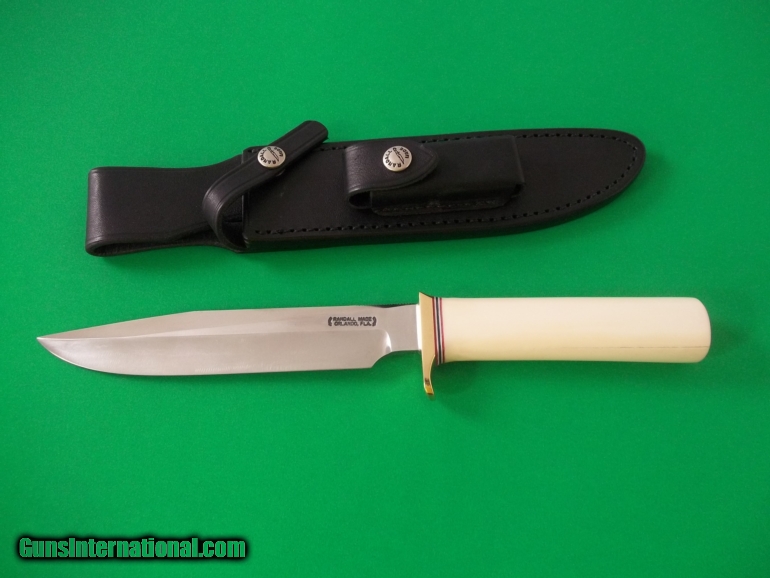 Description: Randall model # 5-7" carbon tool steel blade " Camp and Trail Knife," ivory handle ( slight crack at bottom which does not affect its value ) rare square flat single brass guard, black leather scabbard. This is an astonishing high-grade museum piece of the highest quality-stunning knife from the Randall shop ( ivory is no longer made by the shop since May 2014). You'll be hard pressed to encounter such fine specimen of a Randall Made Knife, with an handle of such extreme beauty, appearance and visual look. The very best out there. Made in 1990. Note : I do not engage in any sort of trading-please do not ask. Thank you for looking. Free shipping within the Unites States only. Thank you for looking. SOLD |