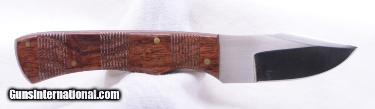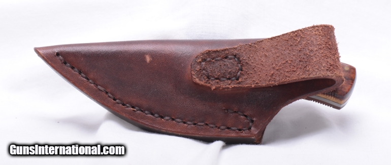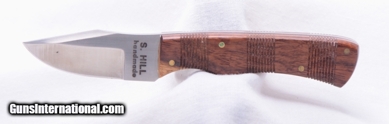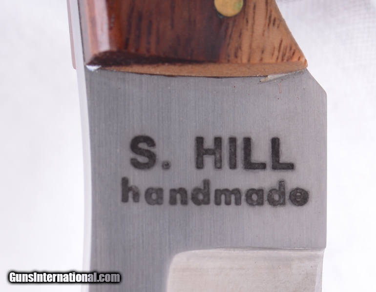 Description: S HILL custom made knife. Very small fixed blade. 5 1/2" overall, 2 1/4" overall blade length with 1 1/2" edged. Wood grips. Overall excellent. Great small game knife. SOLD |