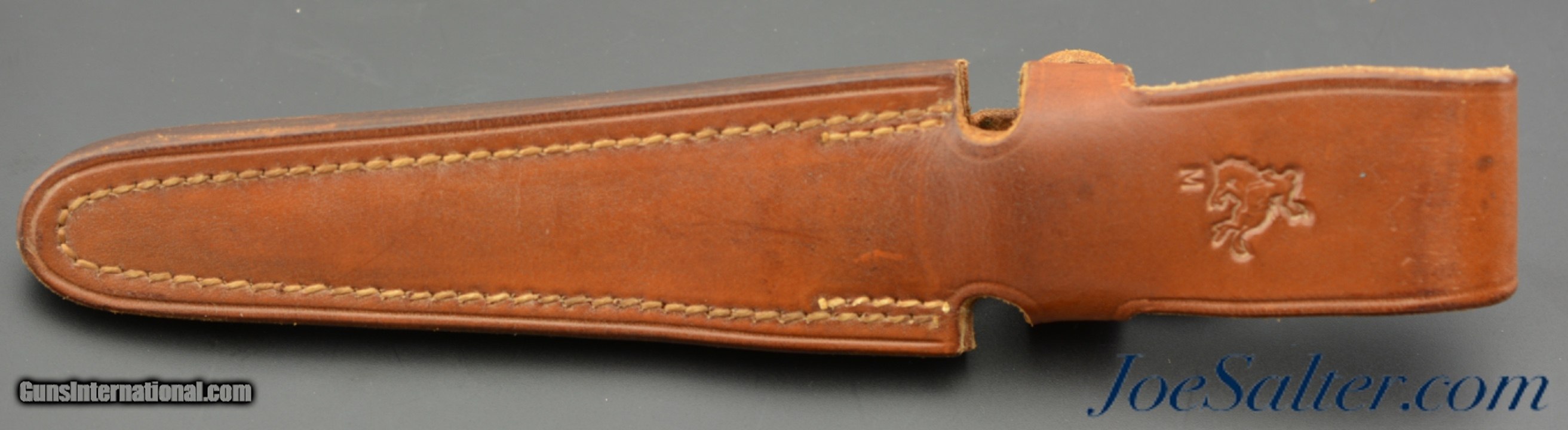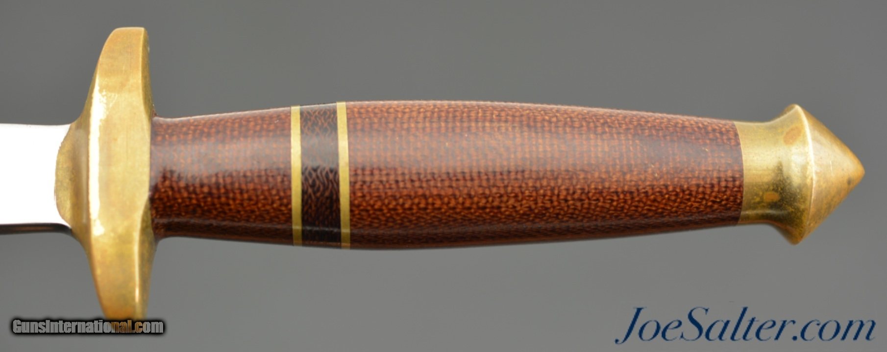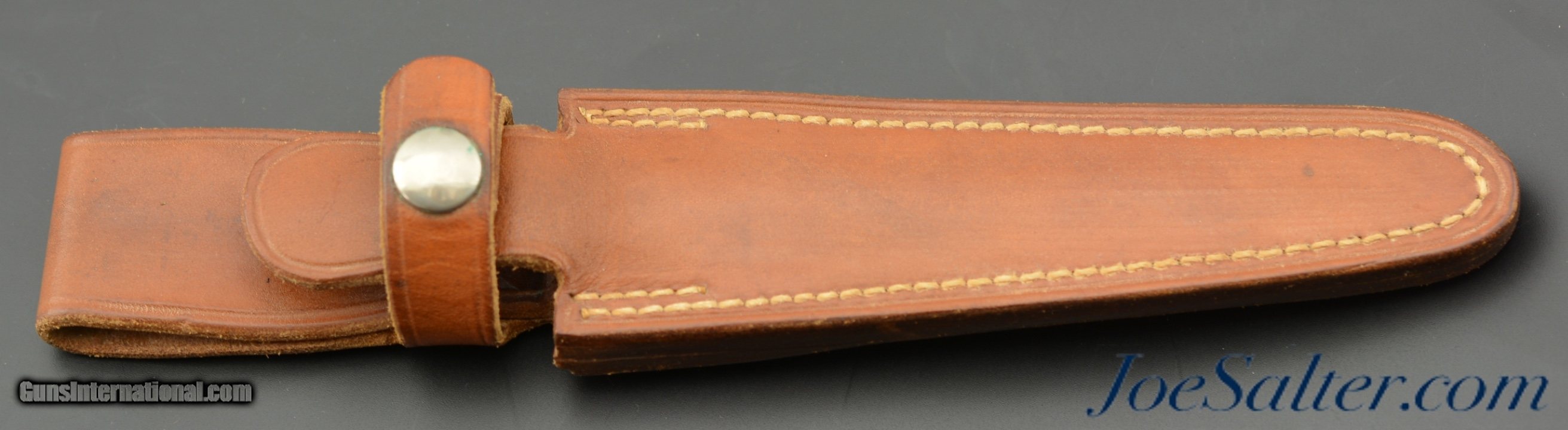 Description: John Nelson Cooper made his first knife in 1924 and made knives professionally in Virginia Beach CA, Burbank CA, and Lufkin TX. He was a prolific maker who often made over 100 knives per month and used a patented welding/brazing technique to attach the hilt and butt cap. John Nelson Cooper passed away in 1987. This is a 5 1/2" blade of carbon steel, mirror polish, 10 3/8" overall length with double brass guard and point end butt cap, brownish red micarta handle with brass and brown micarta spacers. The blade is in excellent factory edged condition with almost no blemishes. This comes with an original, excellent condition tan sheath with tight stitching and minimal signs of use with light verdigris on snap. It has been said that J. N. Cooper made one of the finest quality knives in American knife making history. SOLD |