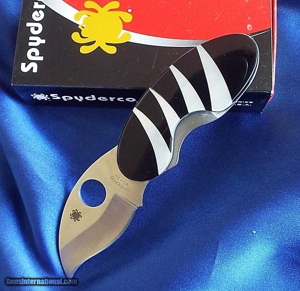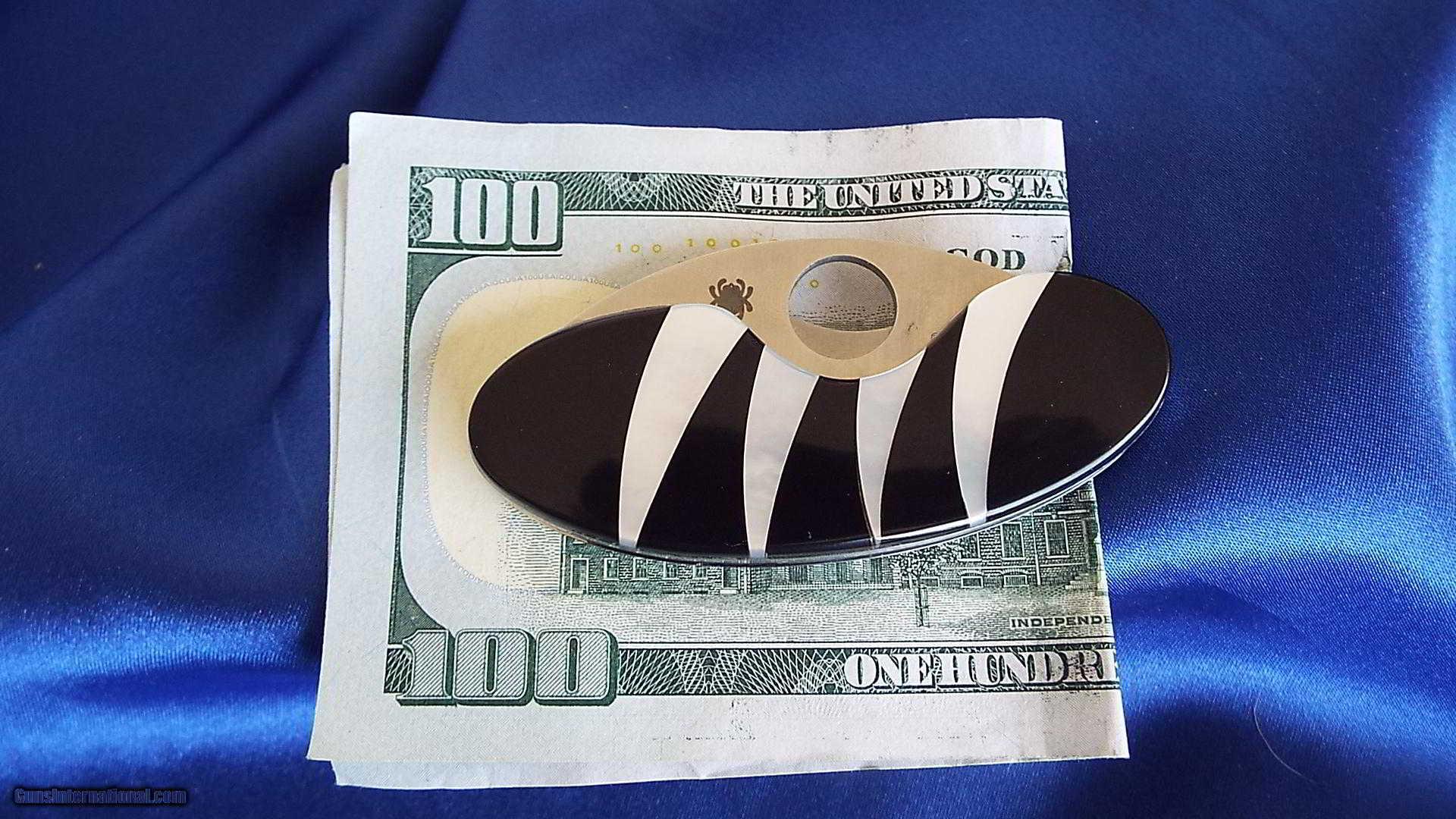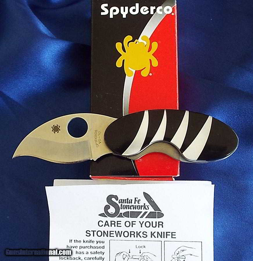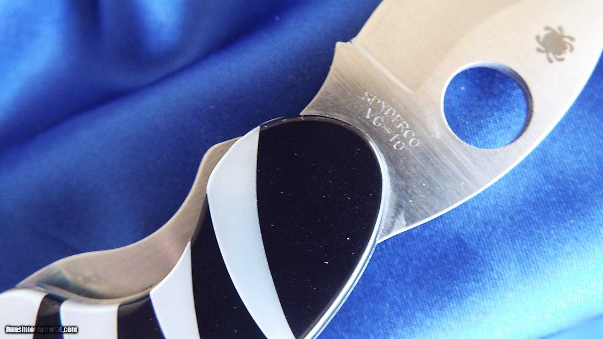 Description: FOR SALE:** BRAND NEW IN THE BOX** BEAUTIFUL COLABORATION OF SPYDERCO & SANTA FE STONEWORKS. THE PRACTICAL SPYDERCO SMOOTH BLADE CRICKET KNIFE, WHICH CAN ALSO DOUBLE AS A MONEY CLIP, ($100 bill is NOT included) IS EMBELISHED WITH SANTA FE STONEWORKS MOTHER OF PEARL & BLACK JET "SHARK TOOTH DESIGN" (PICTURES DON'T DUE IT JUSTICE) POLISHED FIT & FINISH IS STUNNING!! THIS LINER LOCK KNIFE IS VG-10 STEEL, MADE IN SEKI CITY, JAPAN. GREAT GIFT OR EVERY DAY CARRY. STONE WORK DESIGN IS ON THE TOP SIDE ONLY, AS THE BACK HAS BELT/MONEY CLIP.. $7 SHIPPING PRIORITY MAIL LOWER 48 ONLY. THANKS FOR LOOKING!! SOLD |