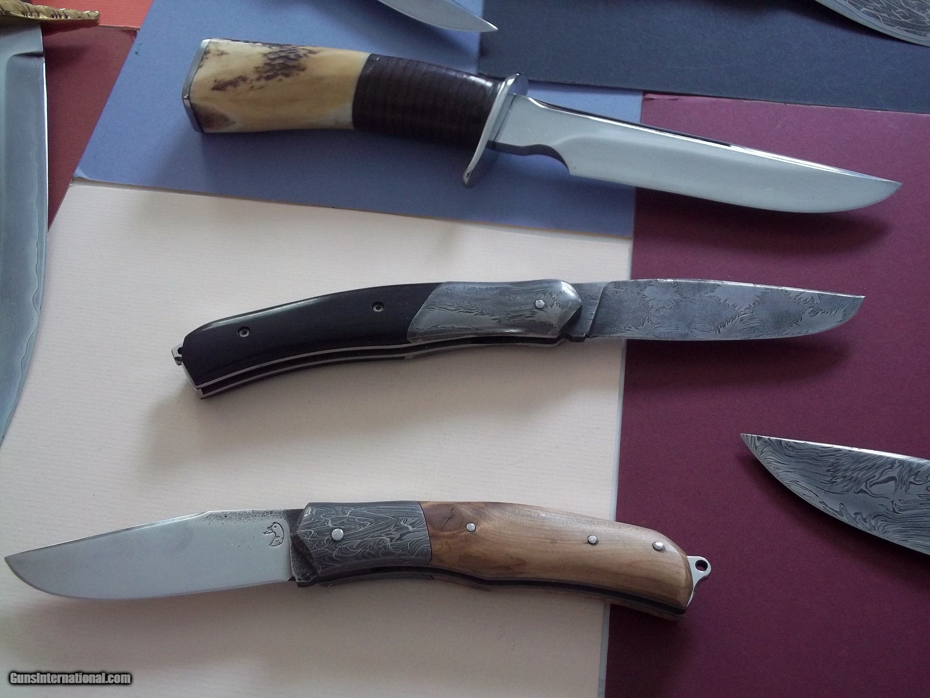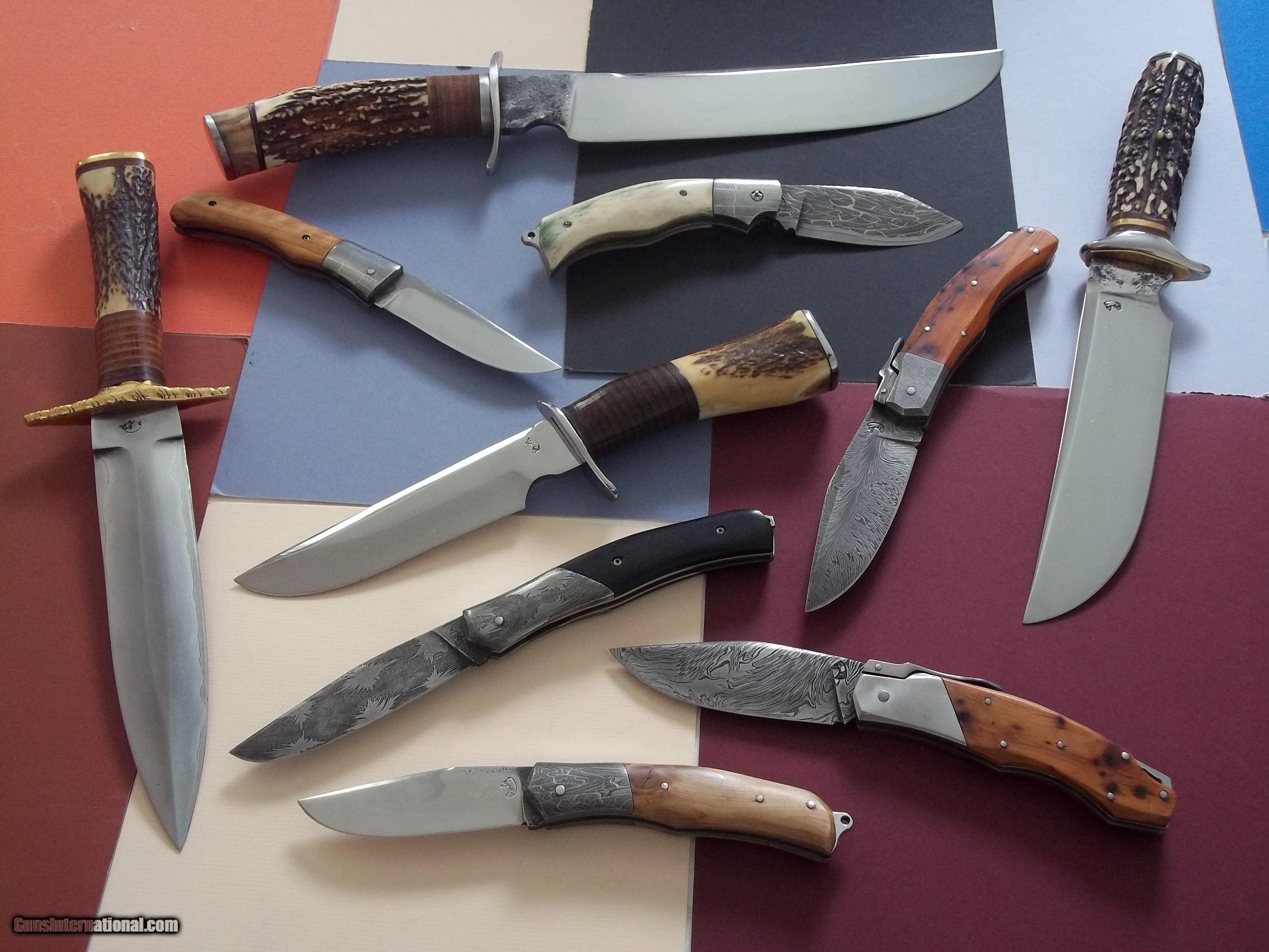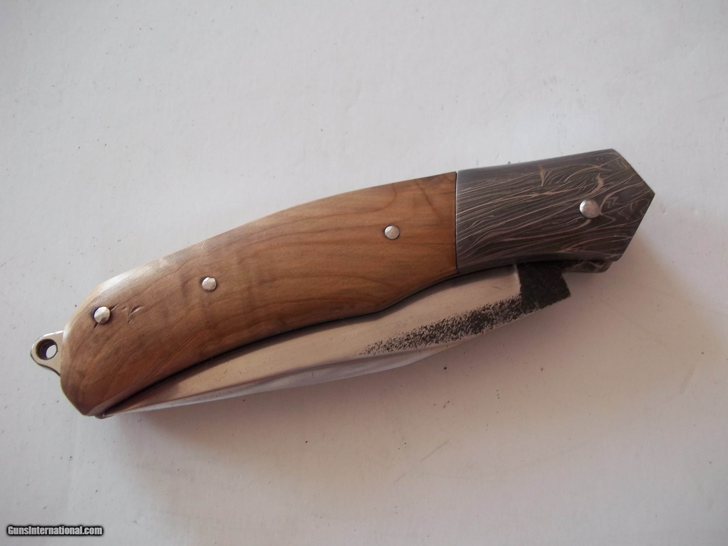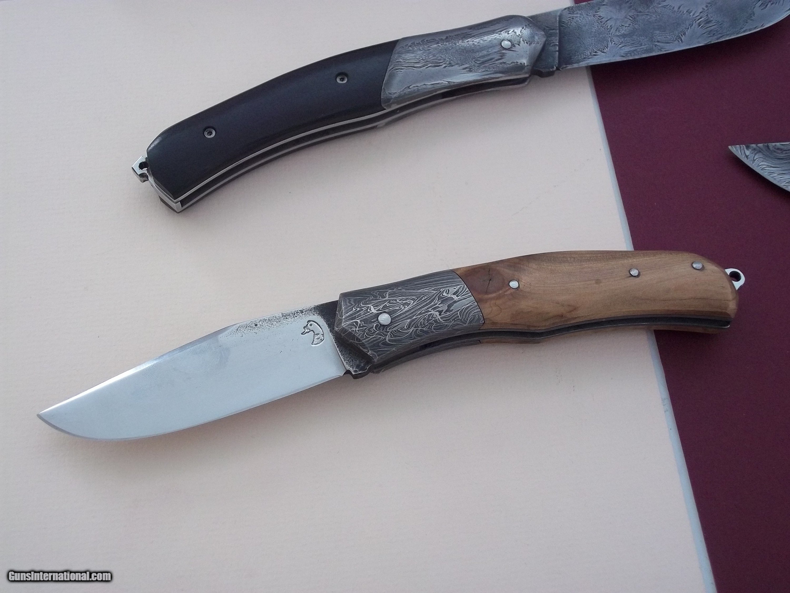 This unique collection of hunting-camp-bushcraft-dagger-oriented knives manifests its unity with different handles, choice of steel including Damascus blades , Damscus bolsters, choice of local and scarce wood ,stag, etc...... Free shipping UPS with tracking #, delivery and signature confirmation. No trade. No international shipping. All knives sales "AS IS" and are final. NOTE: No US knifemakers are able to make a opening/closing system called "Palanquille" on any shown folders as it is typically a French system that dates back to the 16th Century.