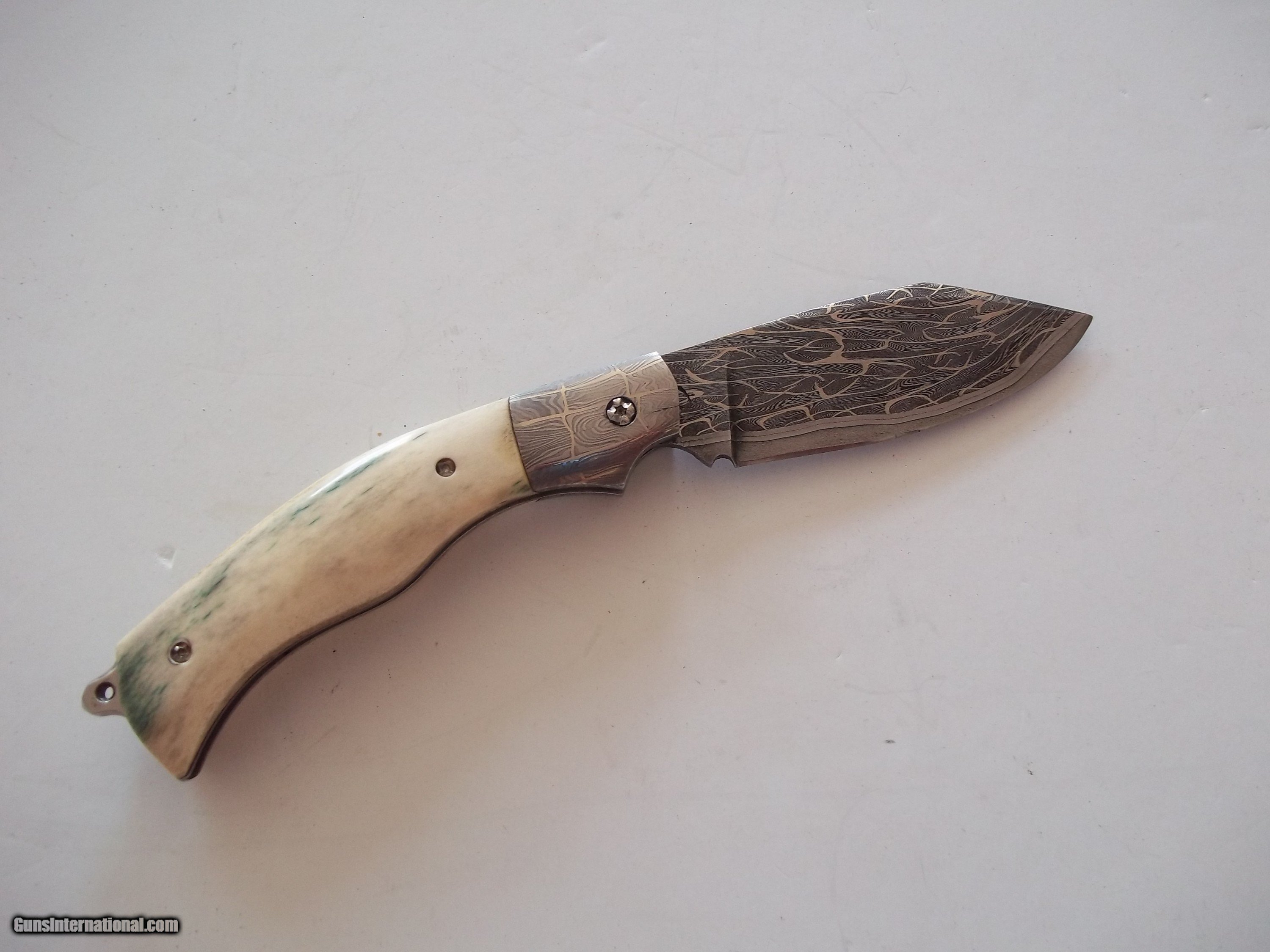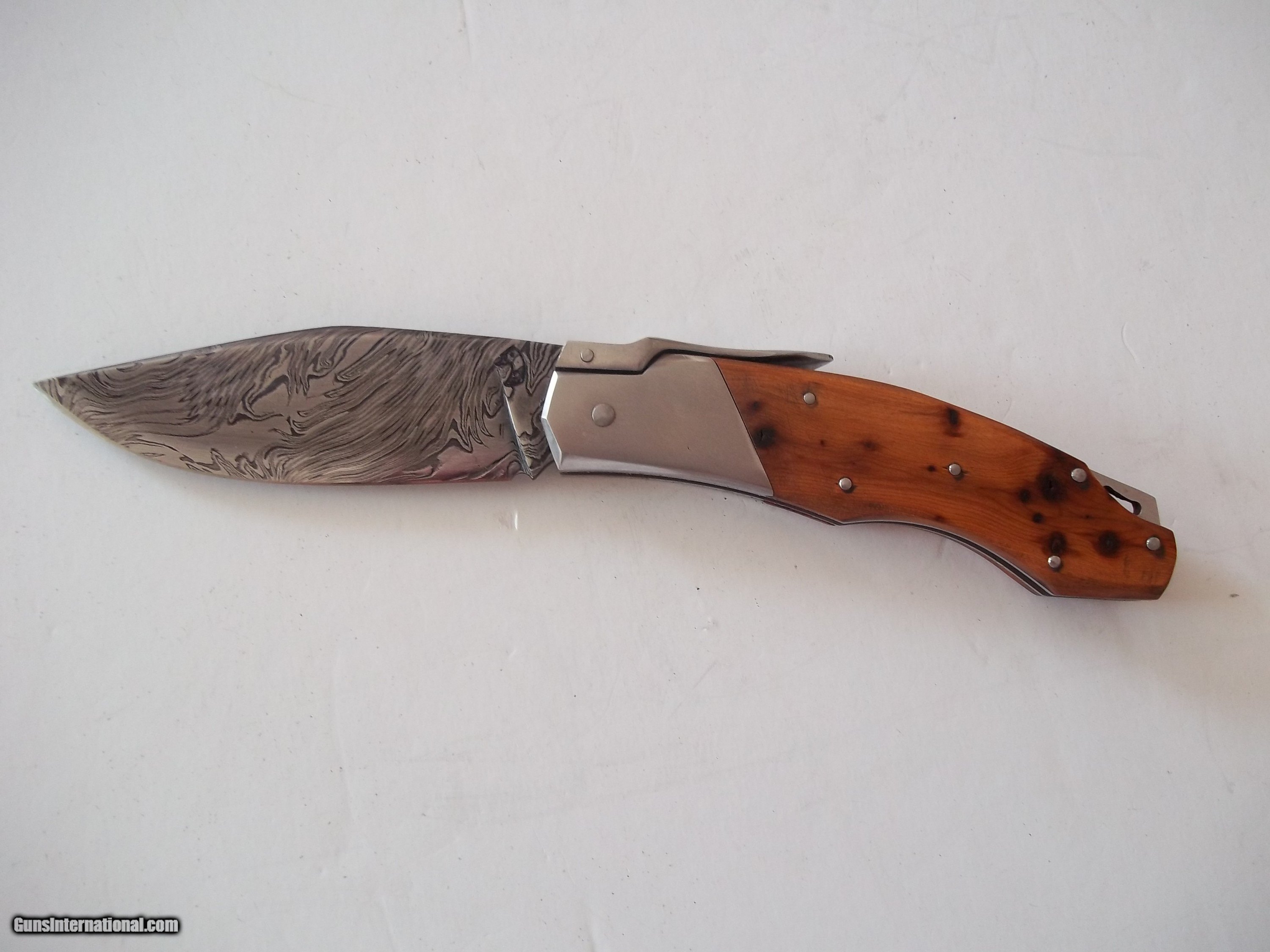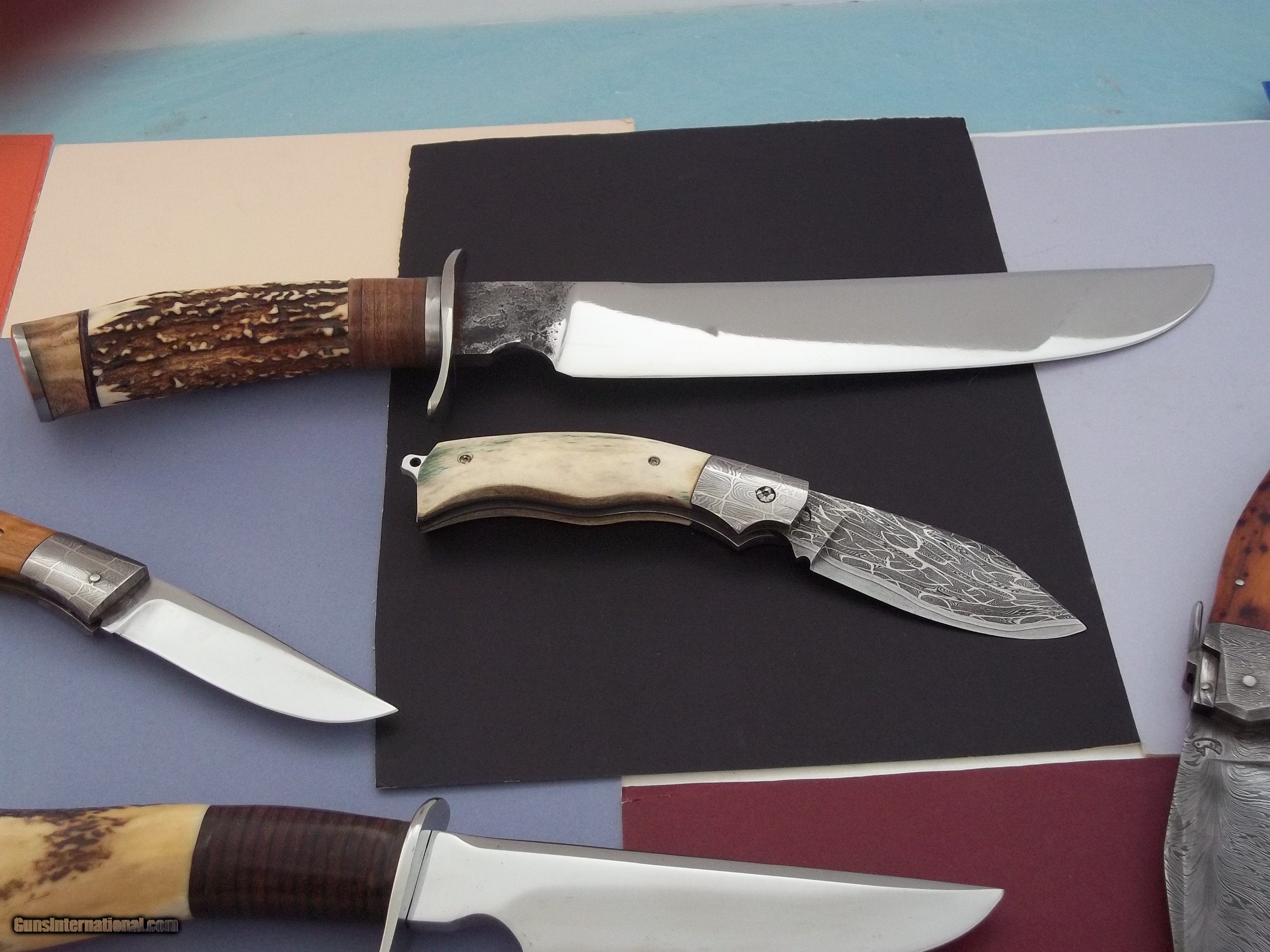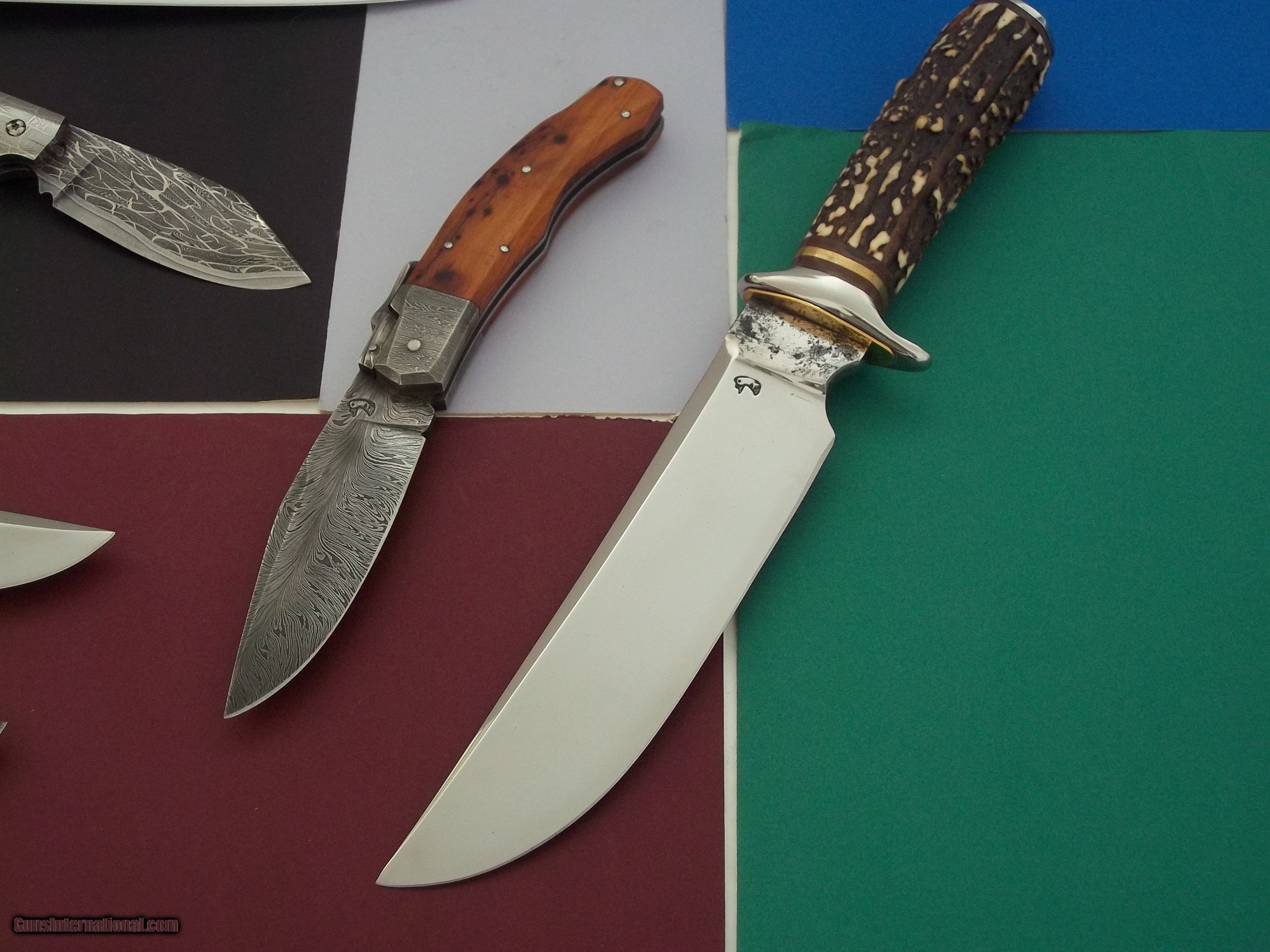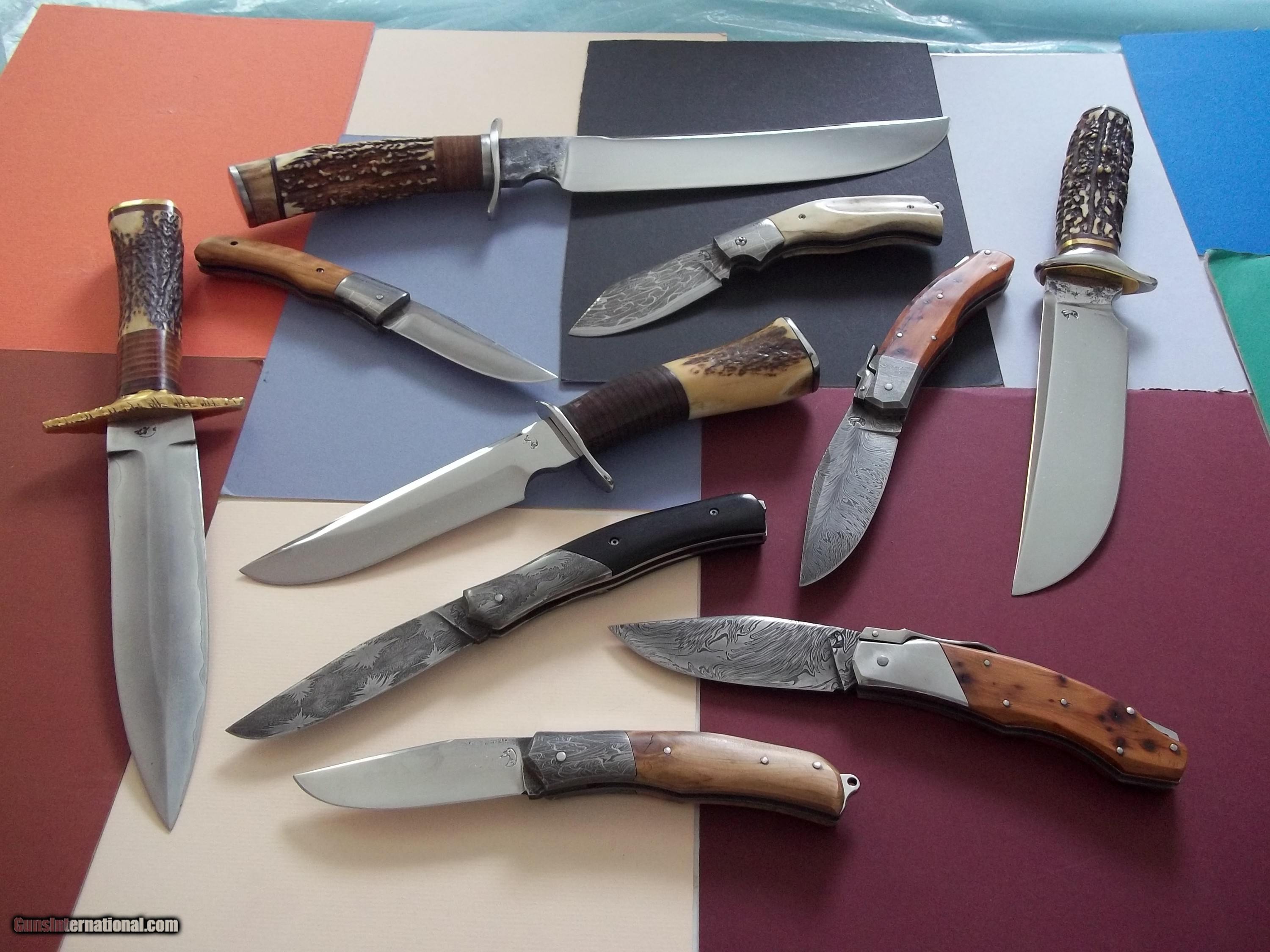 This unique collection of hunting-camp-bushcraft-dagger-oriented knives manifests its unity with different handles, choice of steel including Damascus blades , Damscus bolsters, choice of local and scarce wood ,stag, etc...... Free shipping UPS with tracking #, delivery and signature confirmation. No trade. No international shipping. All knives sales "AS IS" and are final. NOTE: No US knifemakers are able to make a opening/closing system called "Palanquille" on any shown folders as it is typically a French system that dates back to the 16th Century.