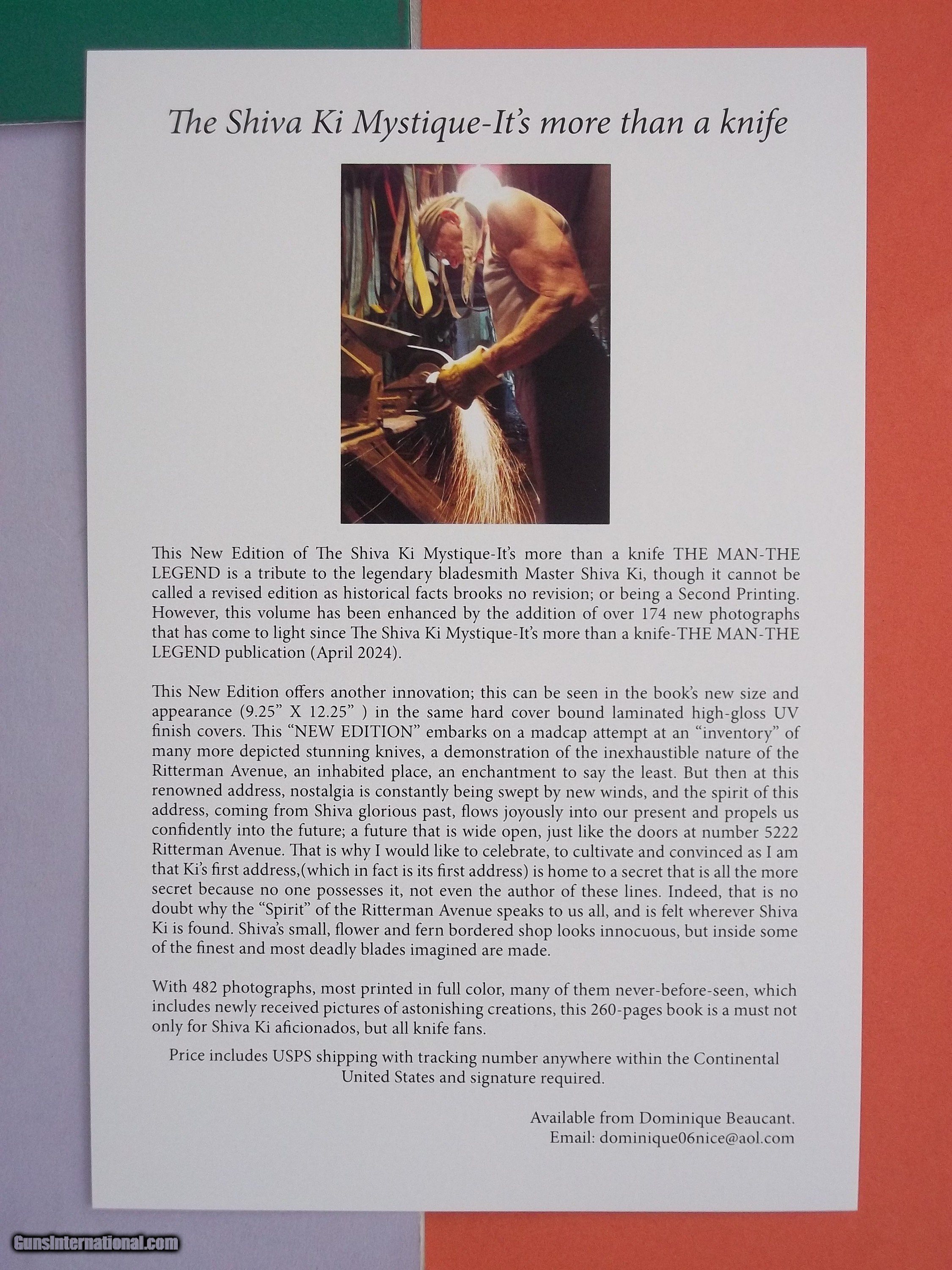Description: Photo # 5 denotes the New Edition at the left and the "first" book at the right! While photo # 6 denotes the spine's thickness in the New Edition (1-3/8") versus 5/8" for the "first" book ! Photos # 7 and # 8 are the advertising postcard that comes with each book. Just released in September 2024 is this "New Edition" of only twelve copies printed globally book on Shiva Ki. It is a tribute to a legendary bladesmith; documenting his illustrious career. Jam-packed with never-before-seen photographs and inside information on the life and times of Shiva Ki, this book is a must not only for fans of Shiva Ki, but all knife fans. This work offers another innovation; this can be seen in the new book's size and appearance (9-1/2"" x 12-3/8"") format. Avid collectors can purchase a copy by messaging from this listing. Shipping via USPS with signature required is included in the shown price within the United States only. An item of cultural and historical significance. Sold as a work-of-art high gloss hard covers coffee table book. . NOTE: When ordering, please advise if you wish to have your copy personalized and signed, otherwise book will bear no signature or autograph. Since it comes in its original shrink wrap from the printer, the book's serial number will still need to be written by hand in two places. Some facts about the New Edition: 260 pages versus 205 for the "first" work 484 photos versus 308 174 new photographs of knives 9" X 12" full size inside pages versus 8-7/8" X 11-1/8" 9.50" X 12.40" Hardbound case book laminated high gloss UV covers versus 9-1/4" X 11-3/8" Back cover denotes a completely new photograph Hard cover laminated high-gloss UV pages Only 12 copies will be printed-Books serial number will be written by hand with two signatures ( Main title's page and the following page to protect authenticity as no numbers can be altered). Please confirm if you would like to reserve a copy. You can have the same book's number as the one you received,(for those who bought the book from this site). Book weighs 4.8 Lbs. SOLD |