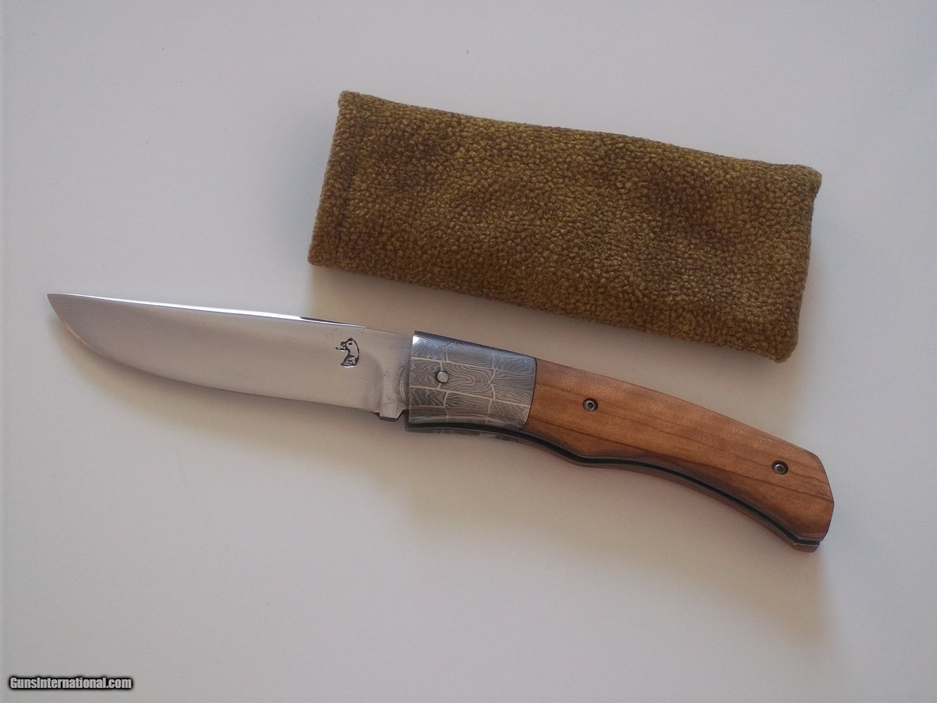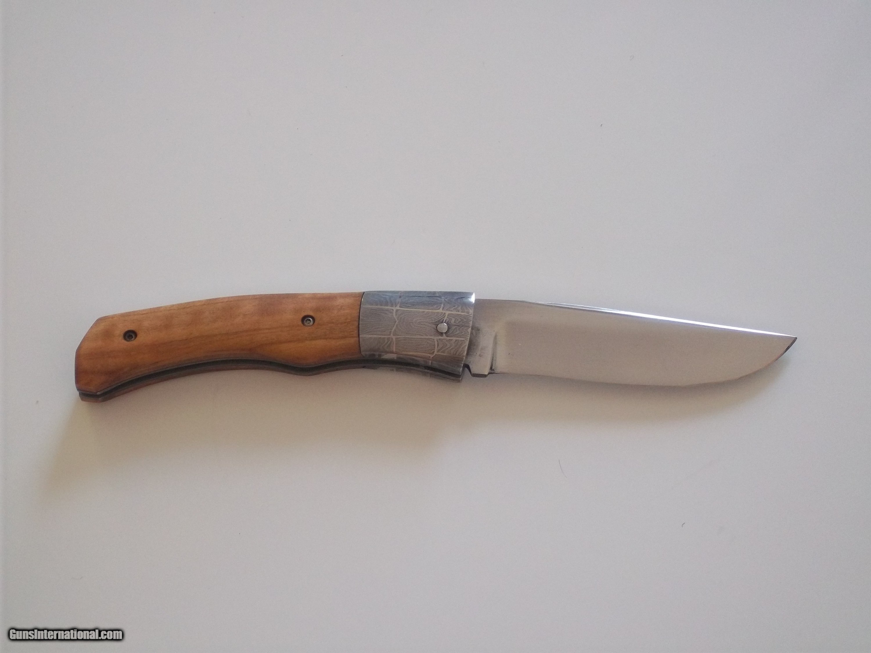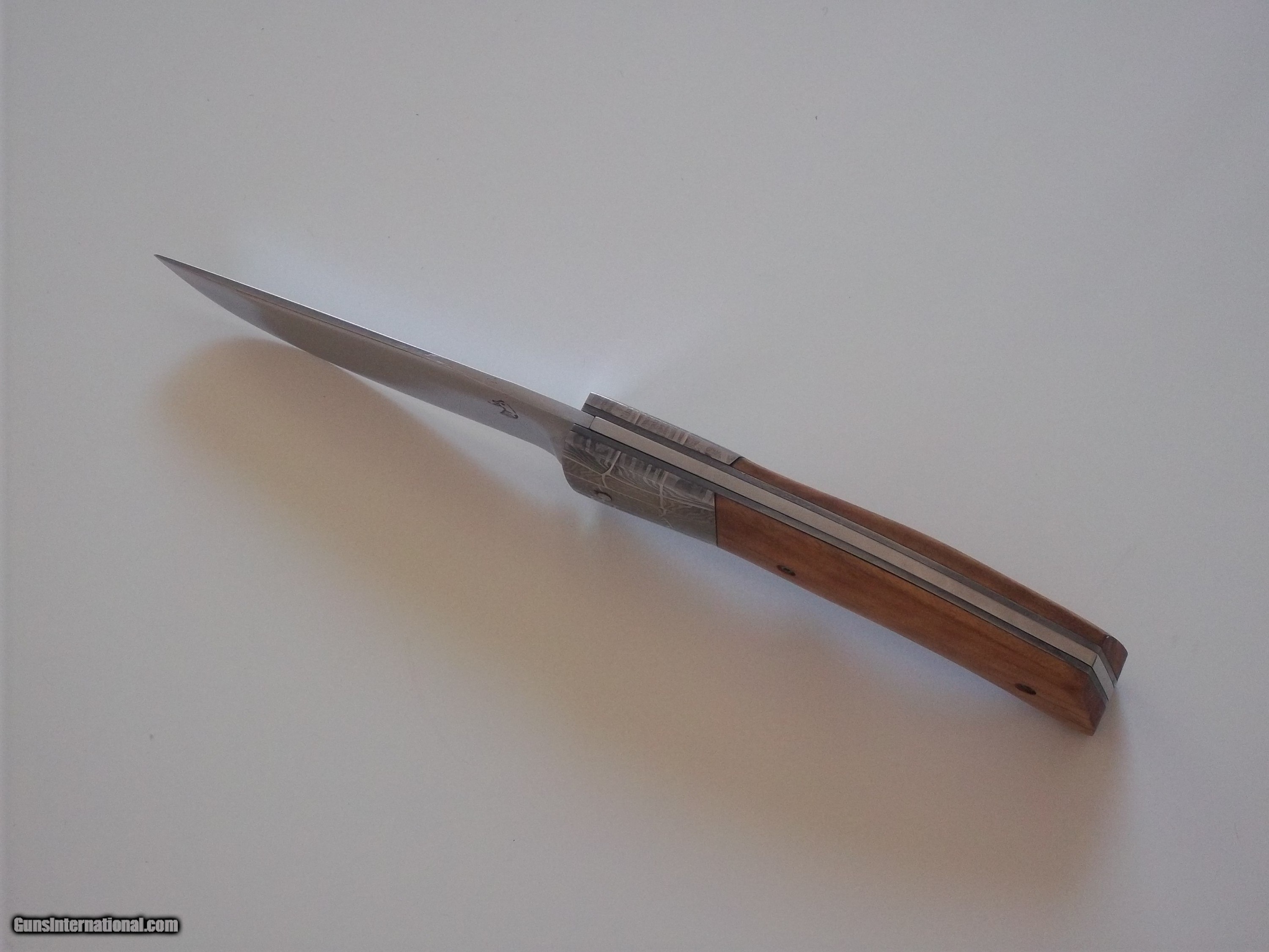 Description: Thierry Le Sénécal model "Sabinou" with a 4" carbon steel blade, Mosaic Damascus bolsters, olive wood scales, no sheath. Free shipping USPS with tracking # and signature required. SOLD |