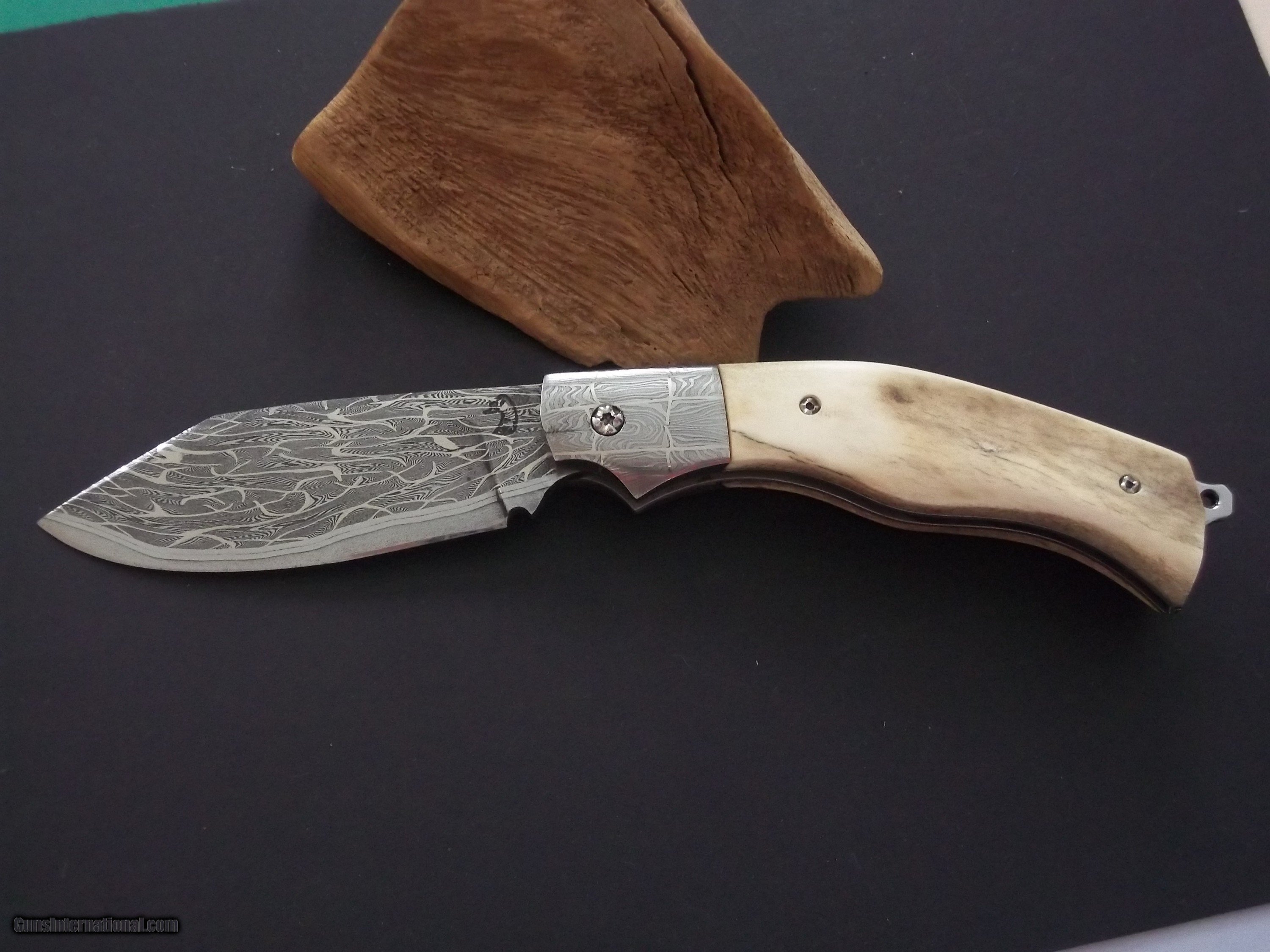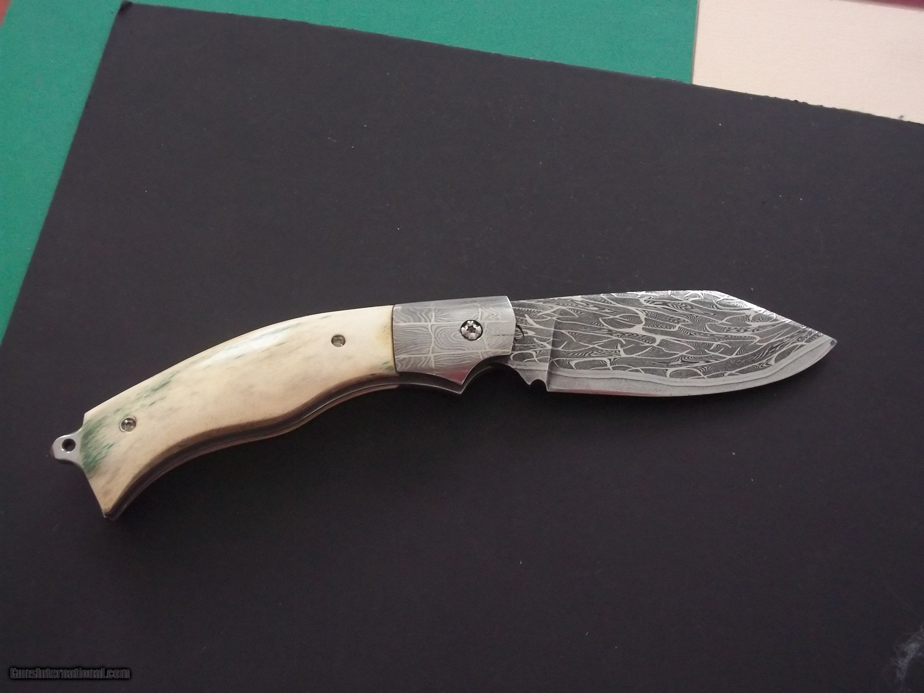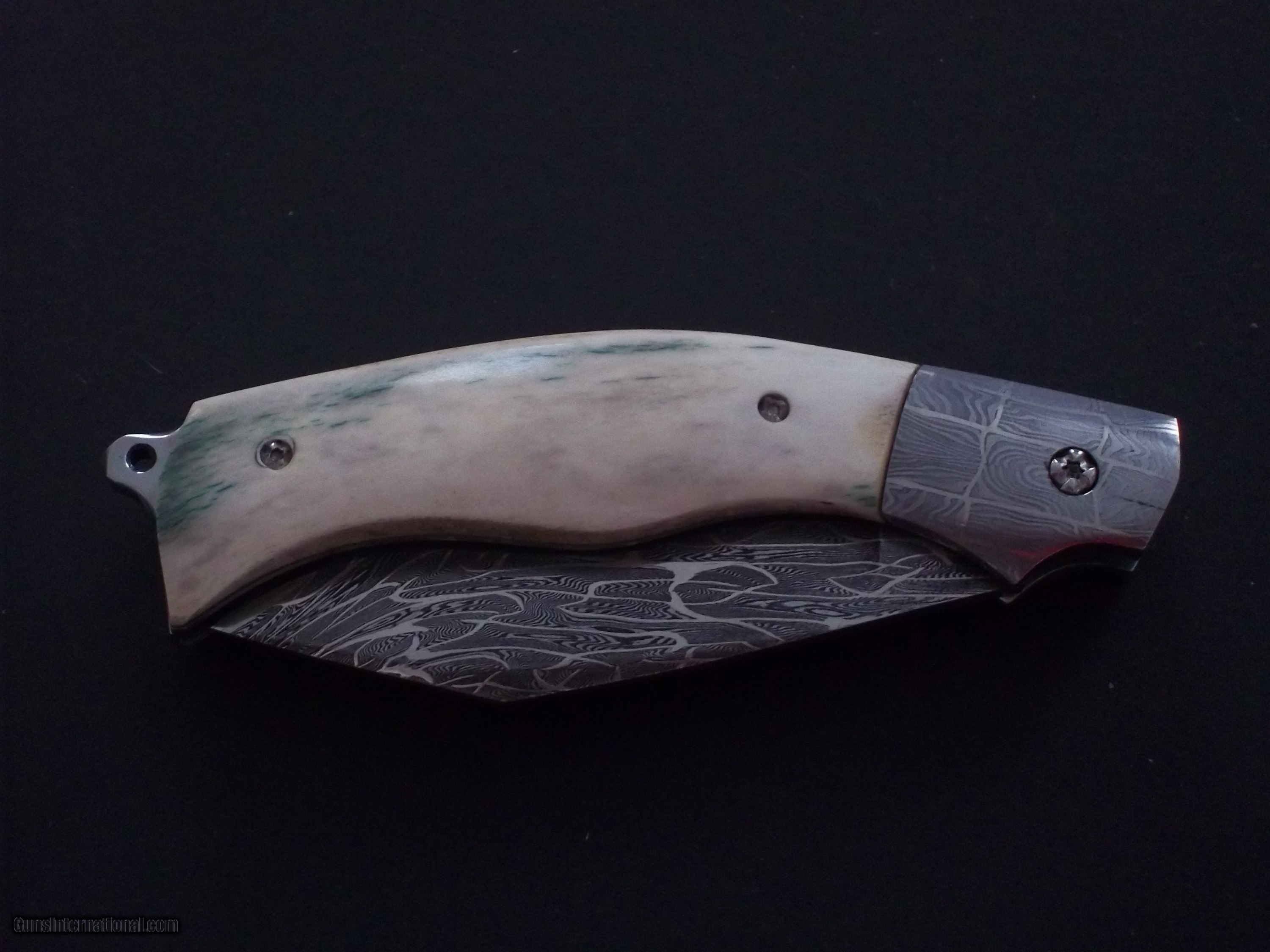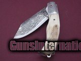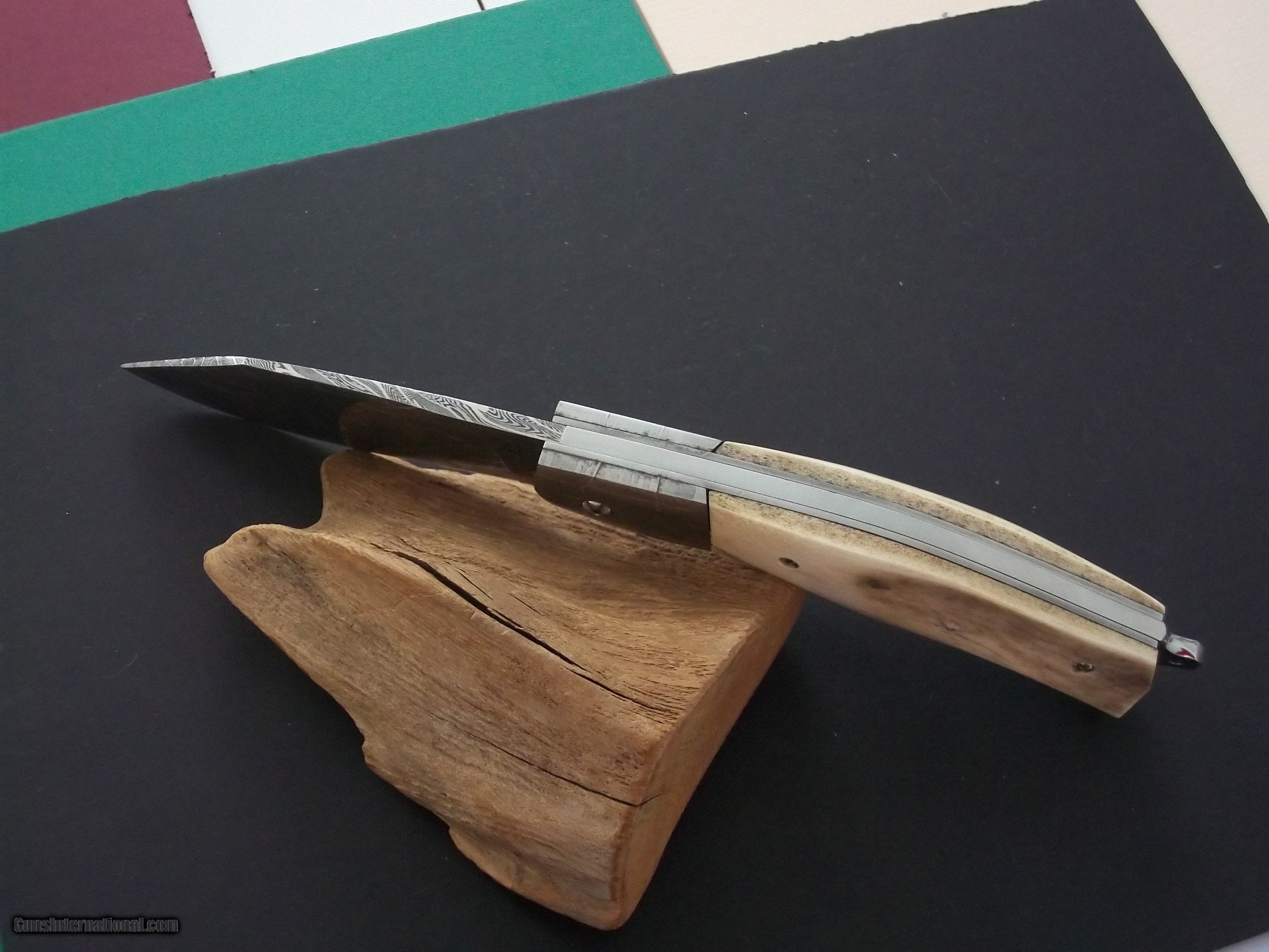 Description: The Sea Skimmer by Thierry Le Sénécal, France, is fitted with an elongated bolster and a mosaic Damascus steel 1.2842, 15n20 and nickel blade. Its reported cutting edge is in 100C6 steel and the receiver and the plate are in Z20C13 steel. 4mm blade thickness with 80mm cutting edge. For a total length of 220mm. "The Sea Skimmer" folder, offers a rear back pump system, 3-7/8" Mosaic Damascus blade and Damascus bolsters, reindeer antler scales handle with natural bark left on one side, and a glass breaker hook, the maker does not makes sheath but offer a doube-sided inside velvet-lined protective pouch. In all I have 10 knives from this amazing French maker for sale:see picture # 6 and # 7 Top knife clockwise: Hunting model, Thunderbird or "Oiseau Tonnerre," Medieval hunting dagger, Thunderbird, Sabinou, The Sea Skimmer, Bob's Camp Knife small version, Ristigouche 1760 Explosion Damascus "palanquille" system dating back to France's 18th century, Ristigouche 1760 Feather Damascus, "palanquille " system, no U.S. smiths makes this type of opening/closing system, Bob's Large camp knife. NOTE: All these knives can be seen on Gunsinternational in another account as I have 140 knives for sale! No trade please. Buyer pays shipping. SOLD |