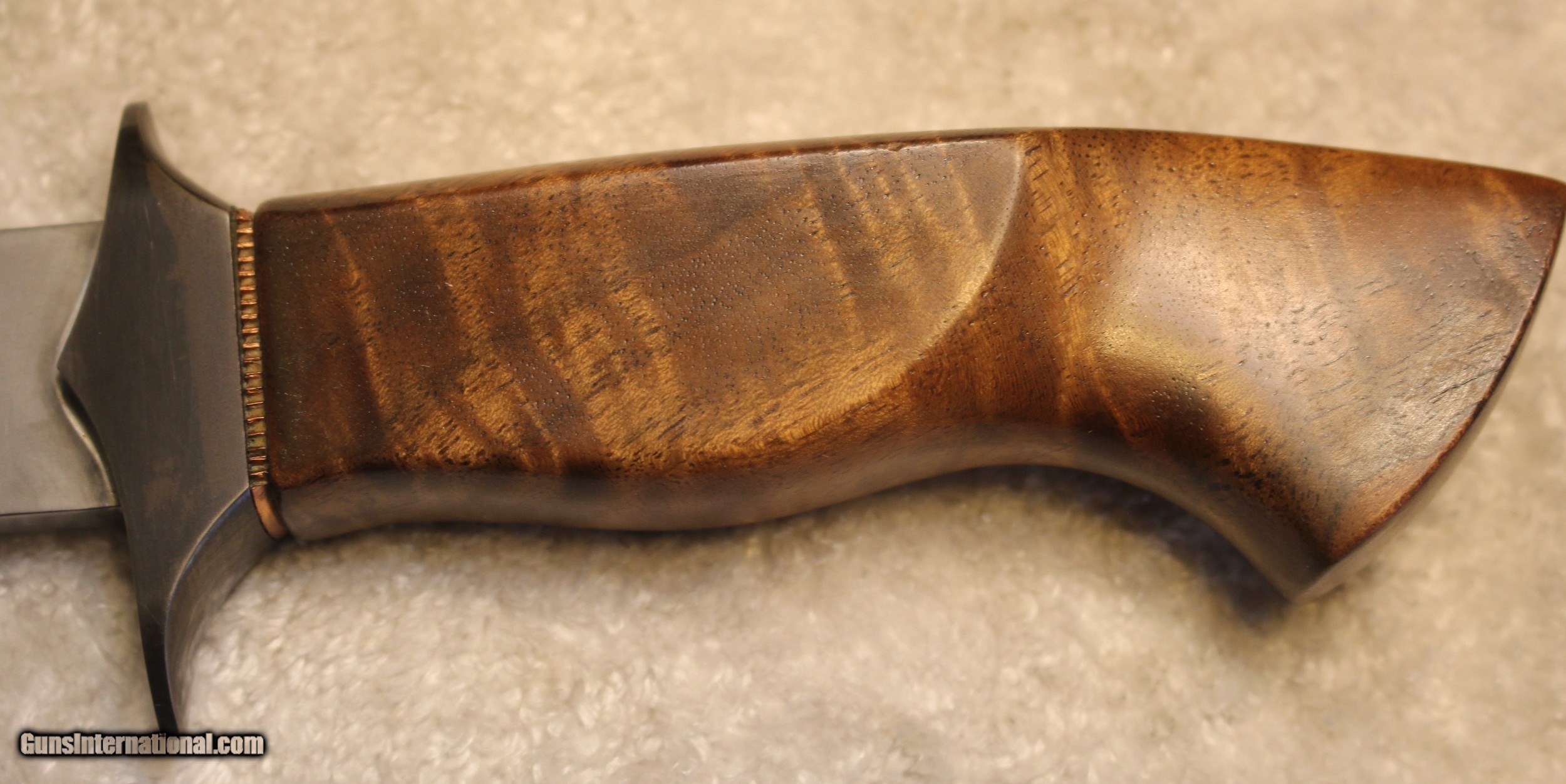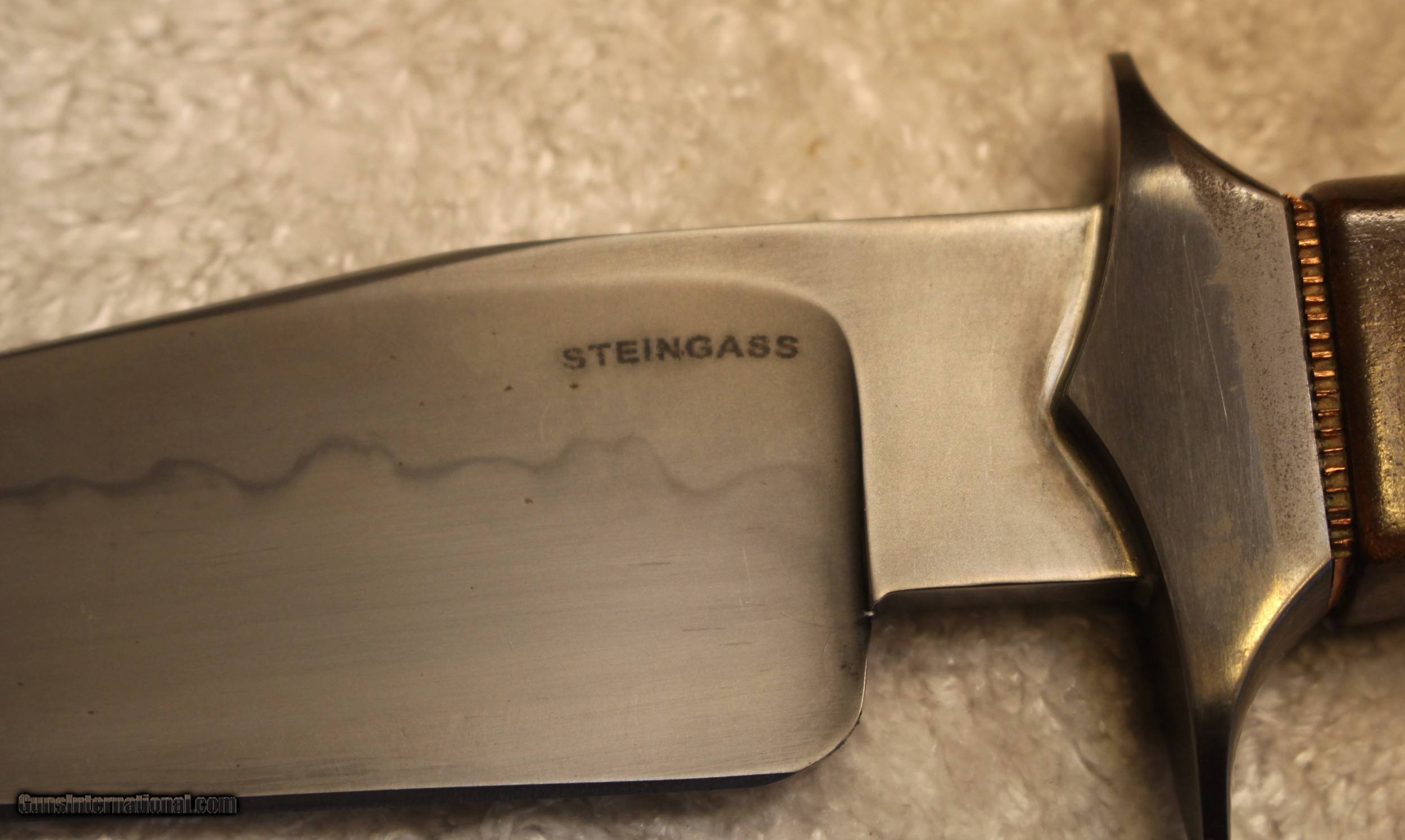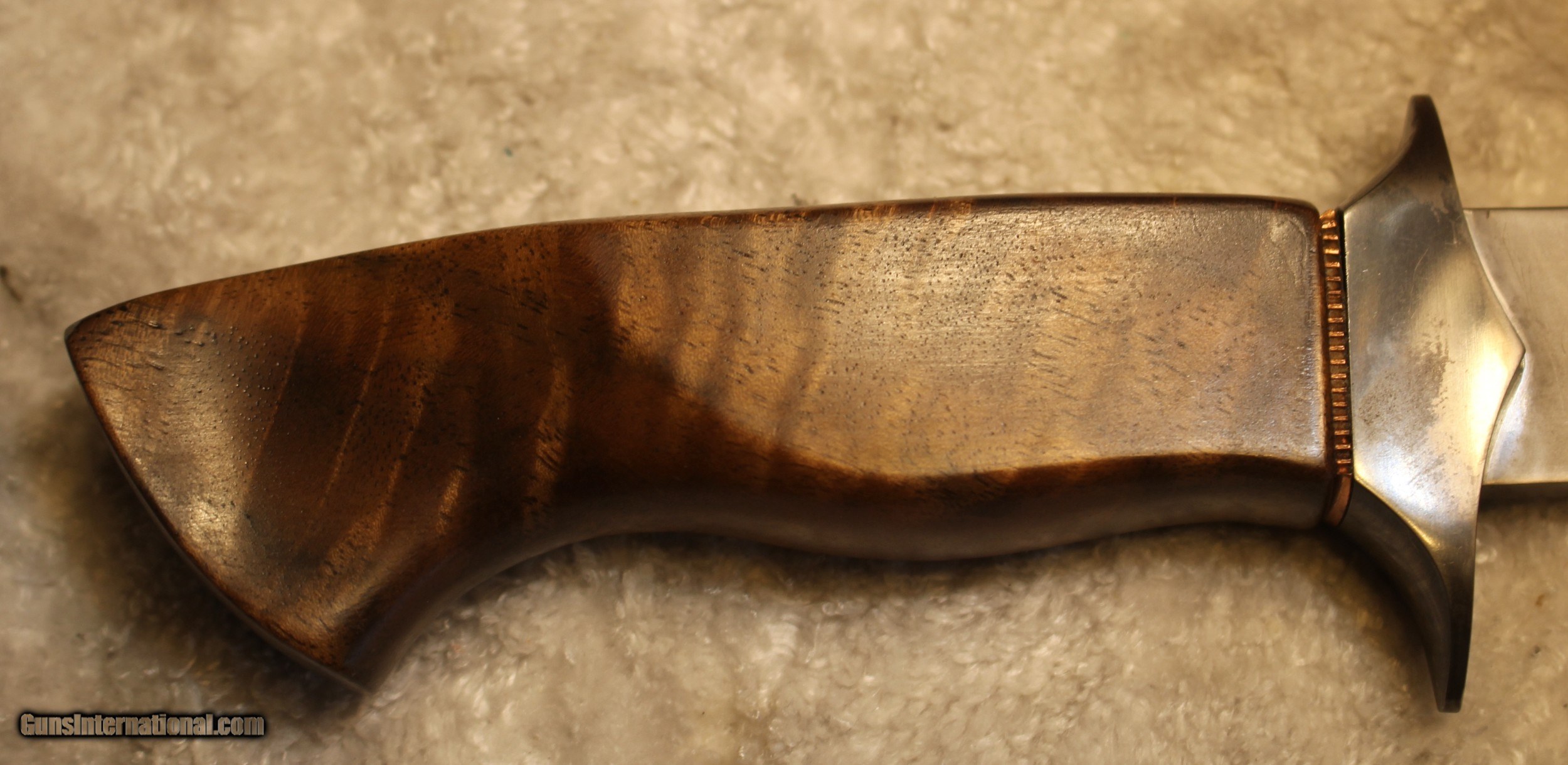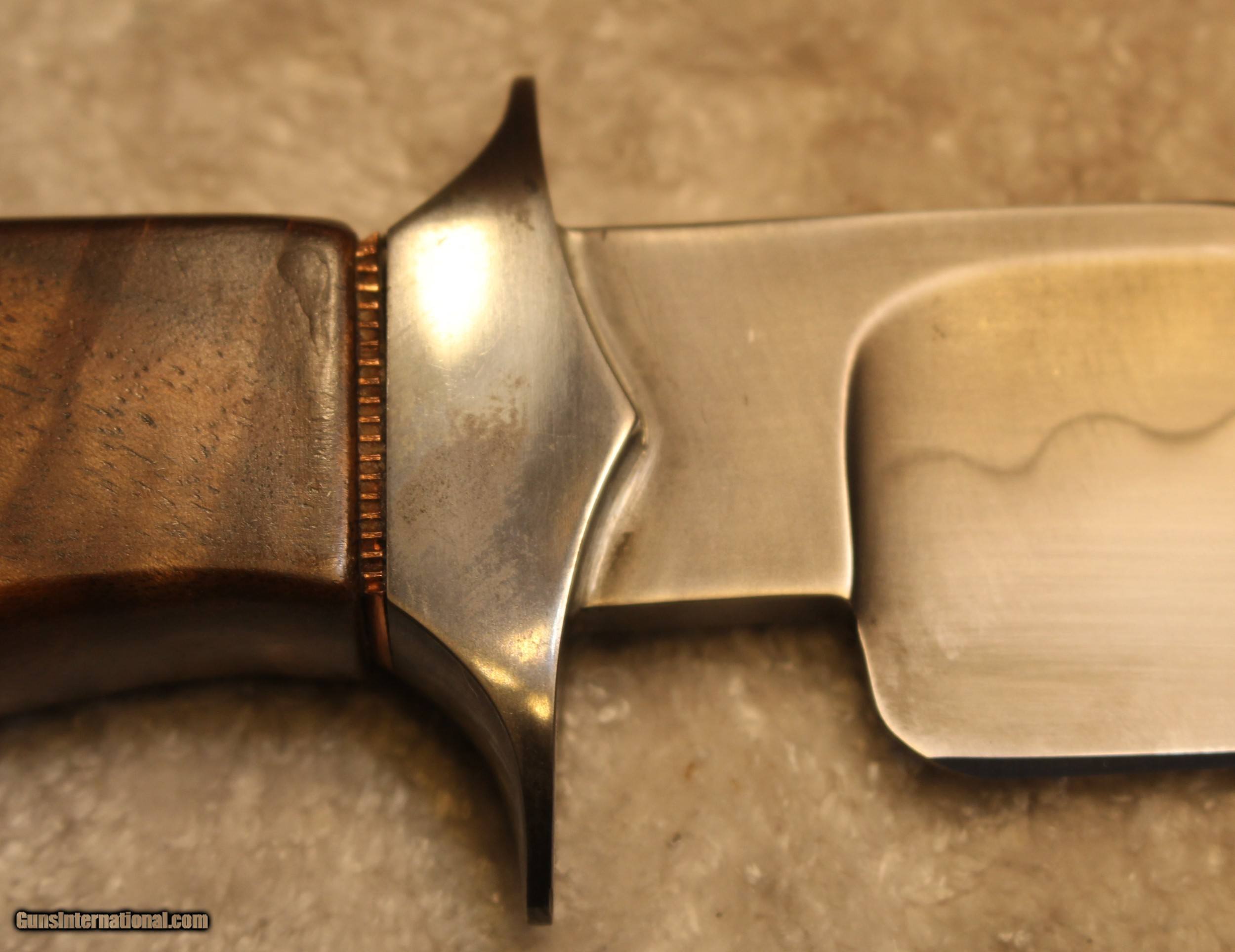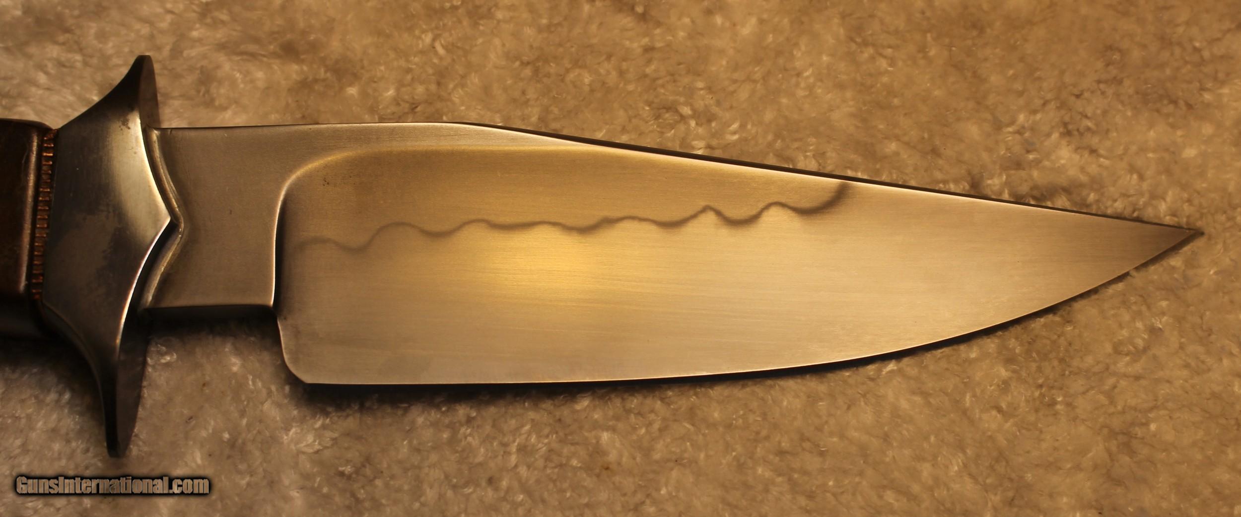 Description: Timothy K or TK Steingass Takedown Bowie with Sheath There is only the knife and the sheath you see in the pictures When taking tthe pictures there is corrosion on the guard. The pictures show it clearly. Look at Pictures 20 through 25. Hence the knife has been discounted for the corrosion Copied the below from the original add describing the knife........................ Timothy K or TK Steingass vest bowie in W-2/Fiddleback Claro Walnut. Intense fiddleback figure in the Claro Walnut - all pores filled with seven hand rubbed coats of Truoil. The handle has an heirloom fit where it meets the coined copper spacer. This is a VERY light bowie in spite of the double guard - the blade is both hollow ground with a radical distal taper while the spine is rounded. Neutral balance is under in the center of the guard where it should be. The handle is sculptured for a fit that melts into the hand. The hollow ground blade was hand rubbed to 1200 grit, etched and polished to reveal a vivid hamon. The horizontal sheath can be worn right hip or right cross draw. The 4140 double guard is blued - the solder joint is perfectly executed with no pinholes. The tang extends 3/4 of the way into the handle and is set with G/flex marine grade epoxy. .240" W-2 stock HT to Rc 60-61 10 1/2" OAL 5 1/2" Hollow ground blade Vivid hamon Exhibition grade Fiddleback Claro Walnut Truoil finish Coined copper spacer Blued/soldered double guard Rounded spine RH horizontal carry sheath End of copy from the original ad describing the knife NOTE: Look close at the pictures as the item you see is the one you get. As is means AS IS so There is NO, Refund. This came from the estate of an FFL/SOT Gun Smith, Gun Store that is out of business. The estate was an avid collector. This is from the collection or was inventory of 100 plus straight and folders. There will be countless other listings from this inventory and other inventories. We are selling for the estate/store. This is NOT a liquidation. There are no lists and will be no lists. Please check our other listings for more items Please also check our Webpage and or Facebook page at P&T Partners Shipping is included. Shipping is NOT FREE. Just included for Priority Mail, Full Insurance and a Signature at the receiving end because of the amount. If you do NOT want a signature, please advise. You can let me know if NO signature due to your work schedule. Credit in any form, shape or manner add 3.5% and credit by PHONE only. Personal checks accepted, we do not hold until clear. Postal Money orders also accepted. If you are in Texas and purchasing from Texas you are subject to Texas State Sales Tax For those that are local, there is no Face To Face. On Line means On Line. Again if you are Local there is NO local pick up. We ship only SOLD |