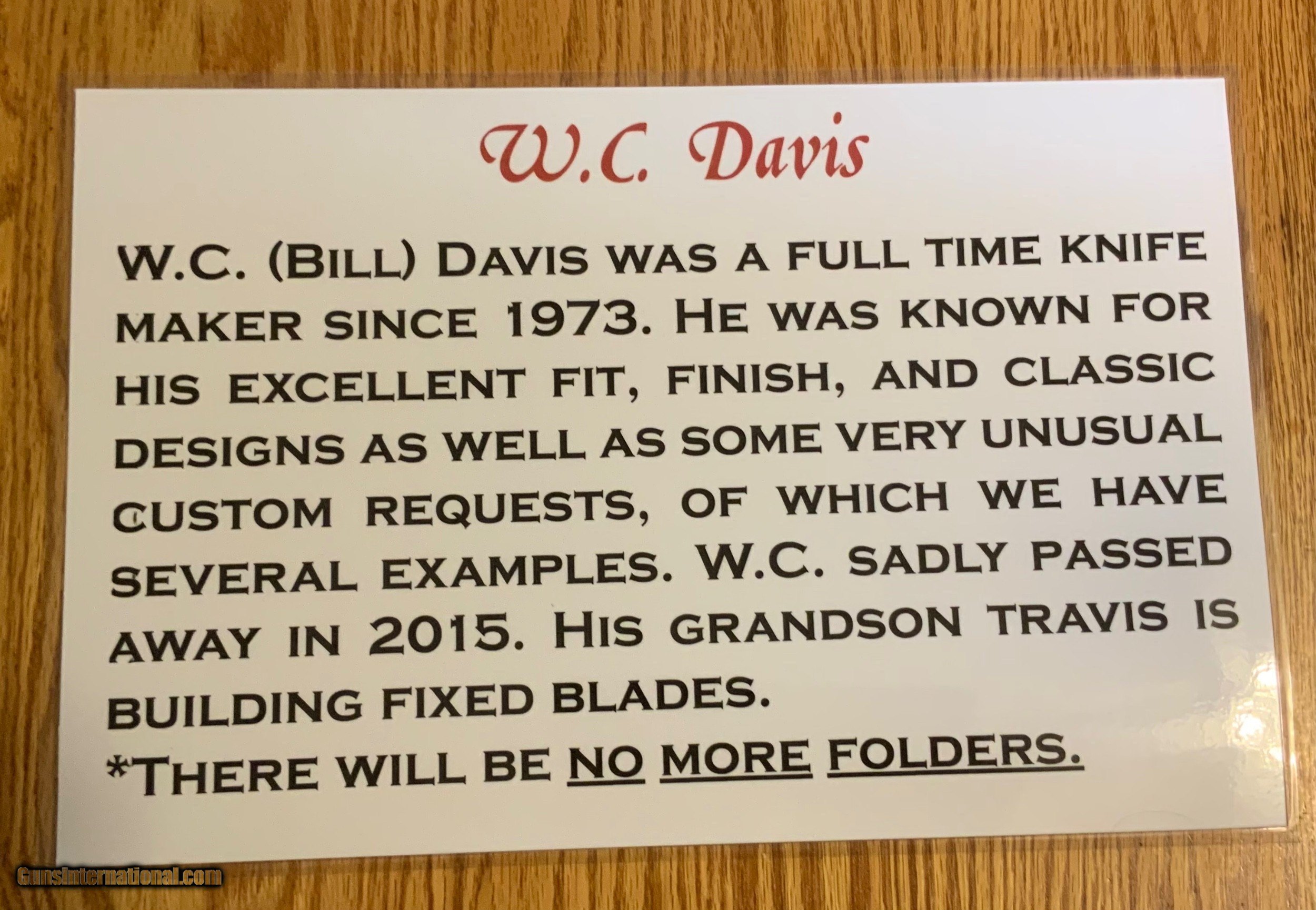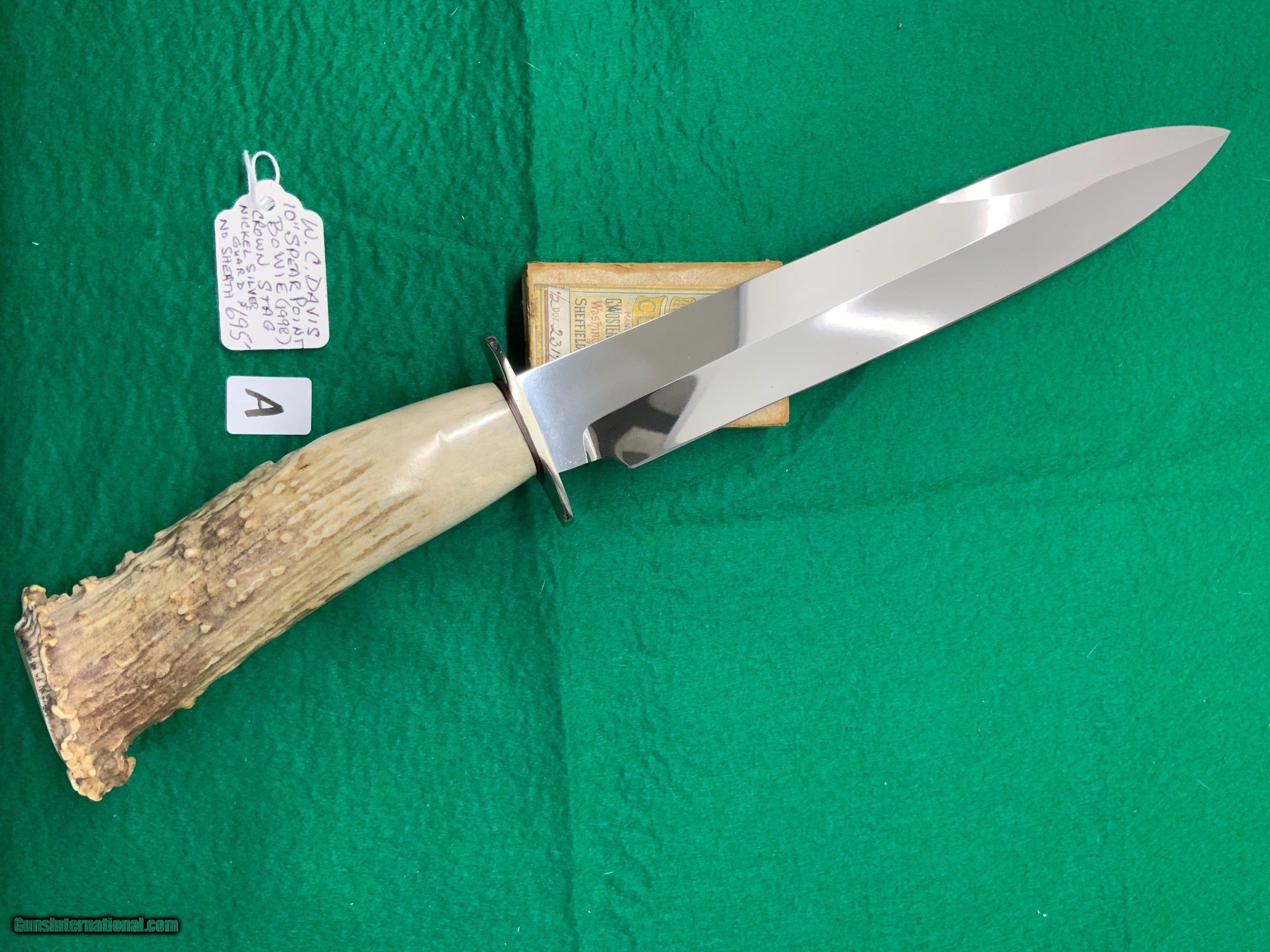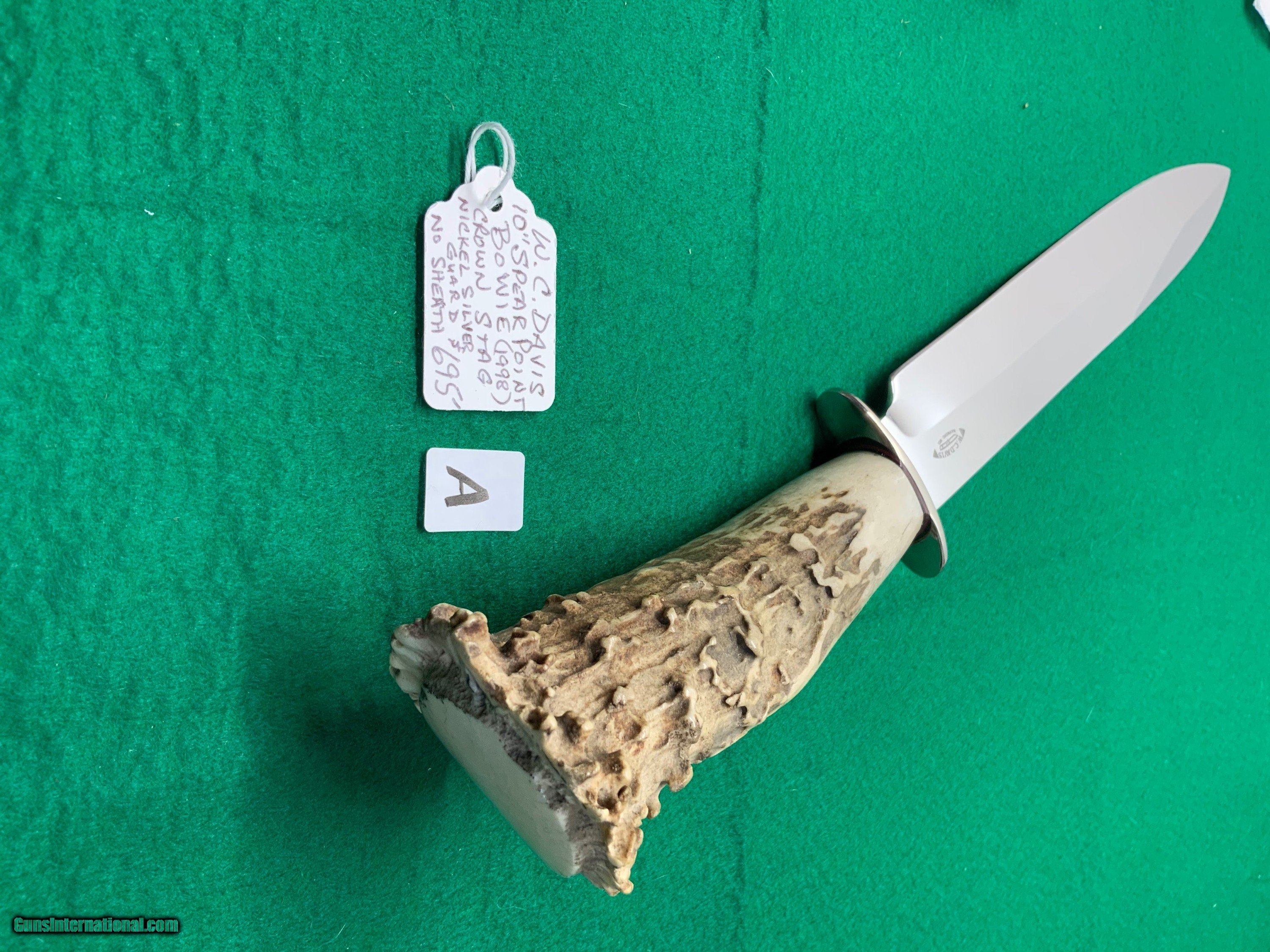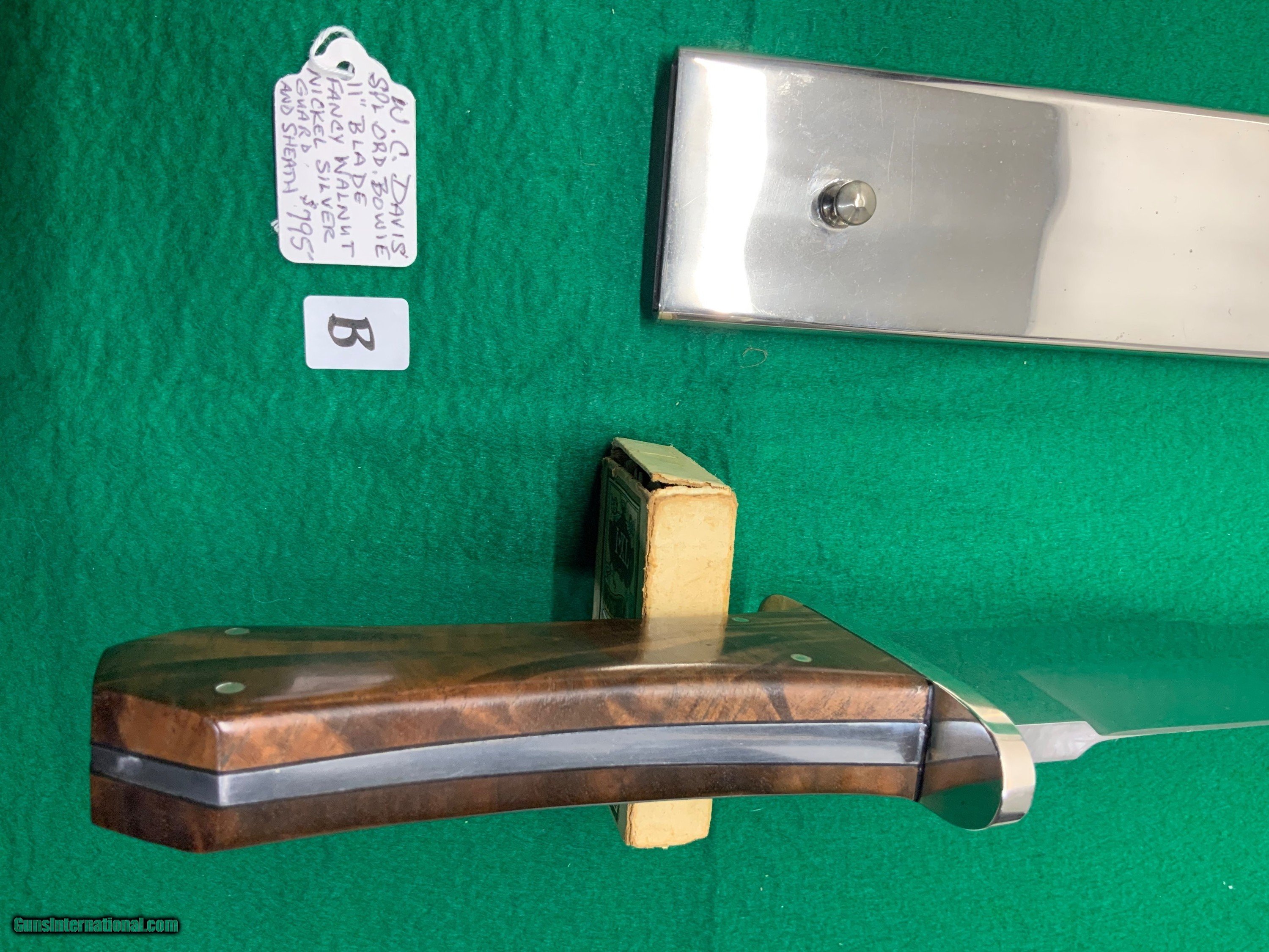 Description: W.C.Davis custom knives. A is a spear point Bowie-10'' blade - crown stag -nickel silver guard - made in 1998 - no sheath $ 695.00 B is a special order Bowie - 11'' blade - fancy walnut - nickel silver guard - nickel silver sheath! $ 795.00 Postal MO only. Include $25.00 for shipping and insurance. SOLD |