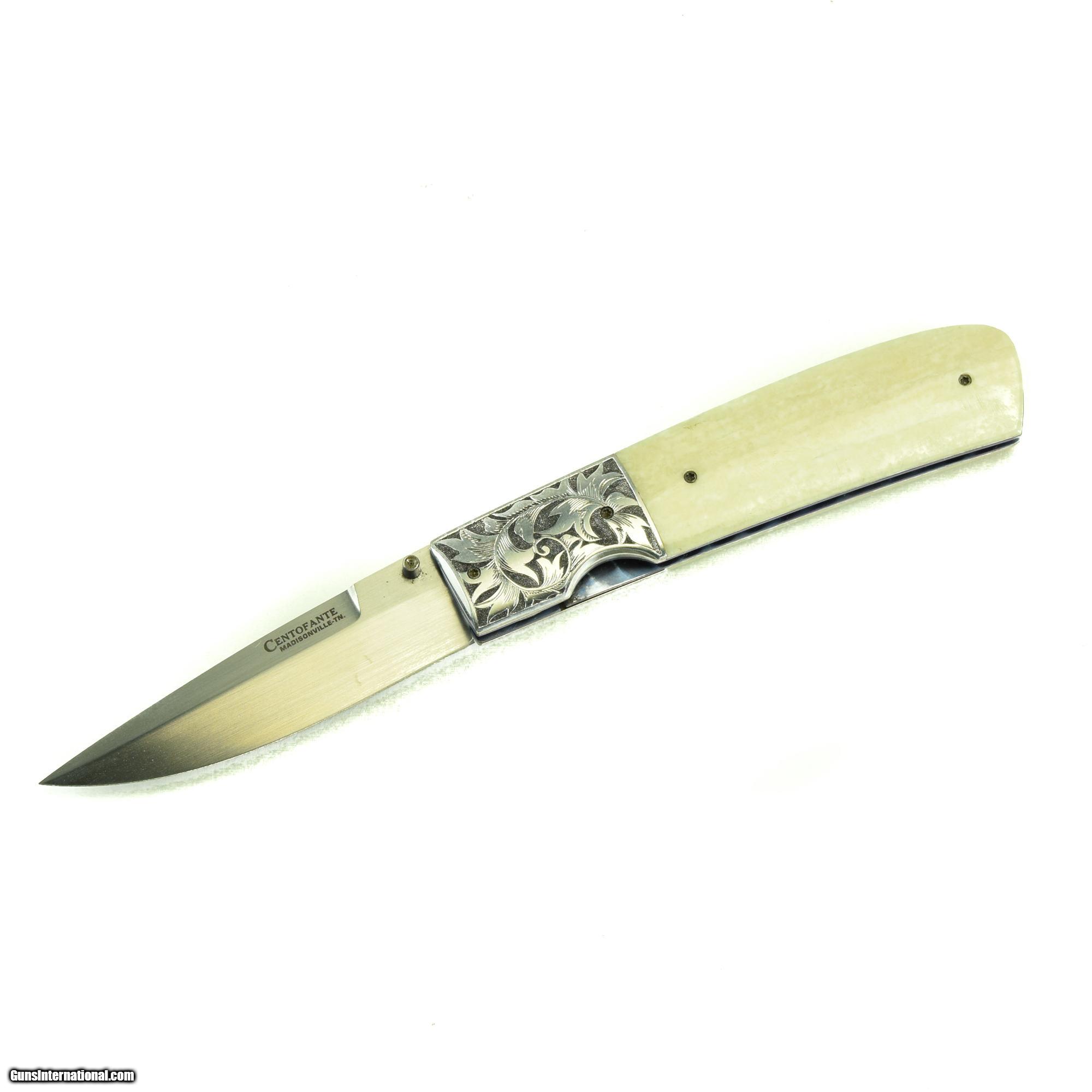 Description: Walrus ivory handled knife, custom made by Frank Centofante of Madisonville, TN. PERIOD: Contemporary ORIGIN: Madisonville, TN SIZE: 4 1/2" closed, 7 3/4" open SOLD |