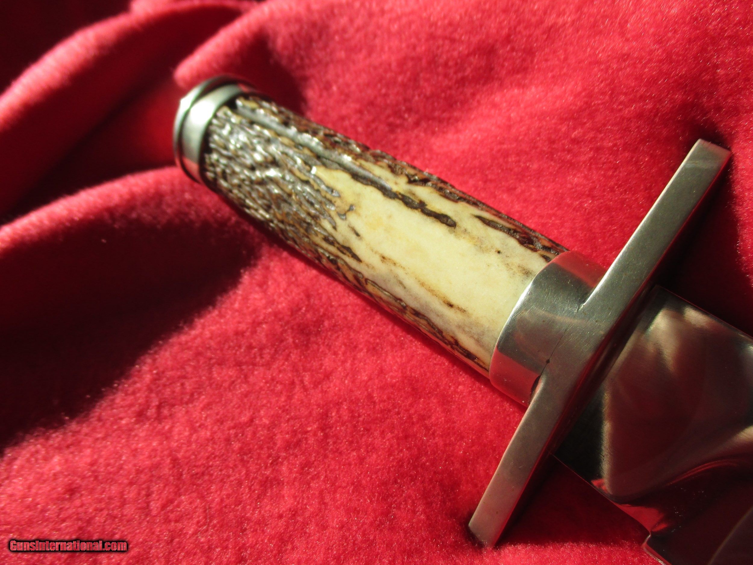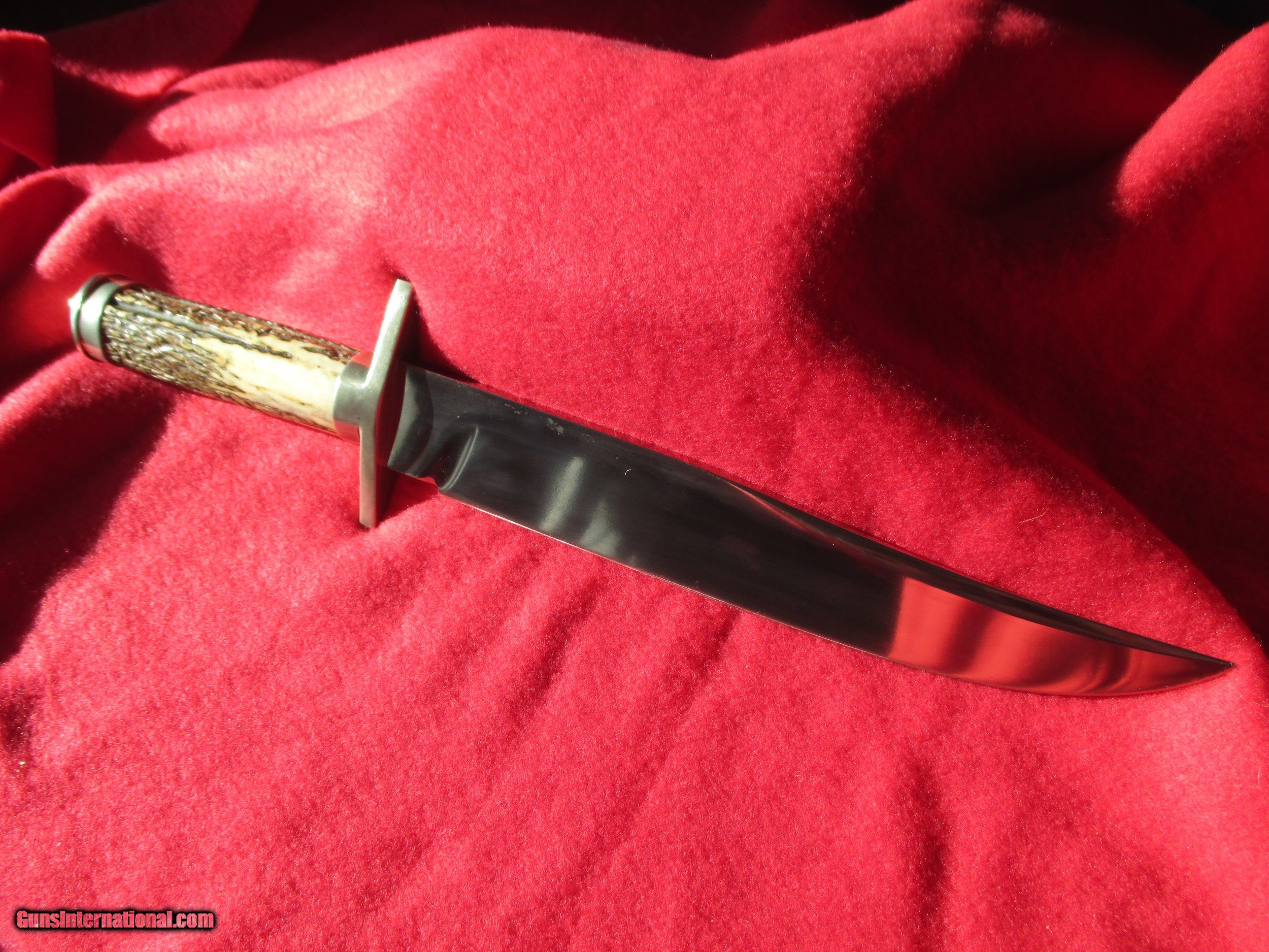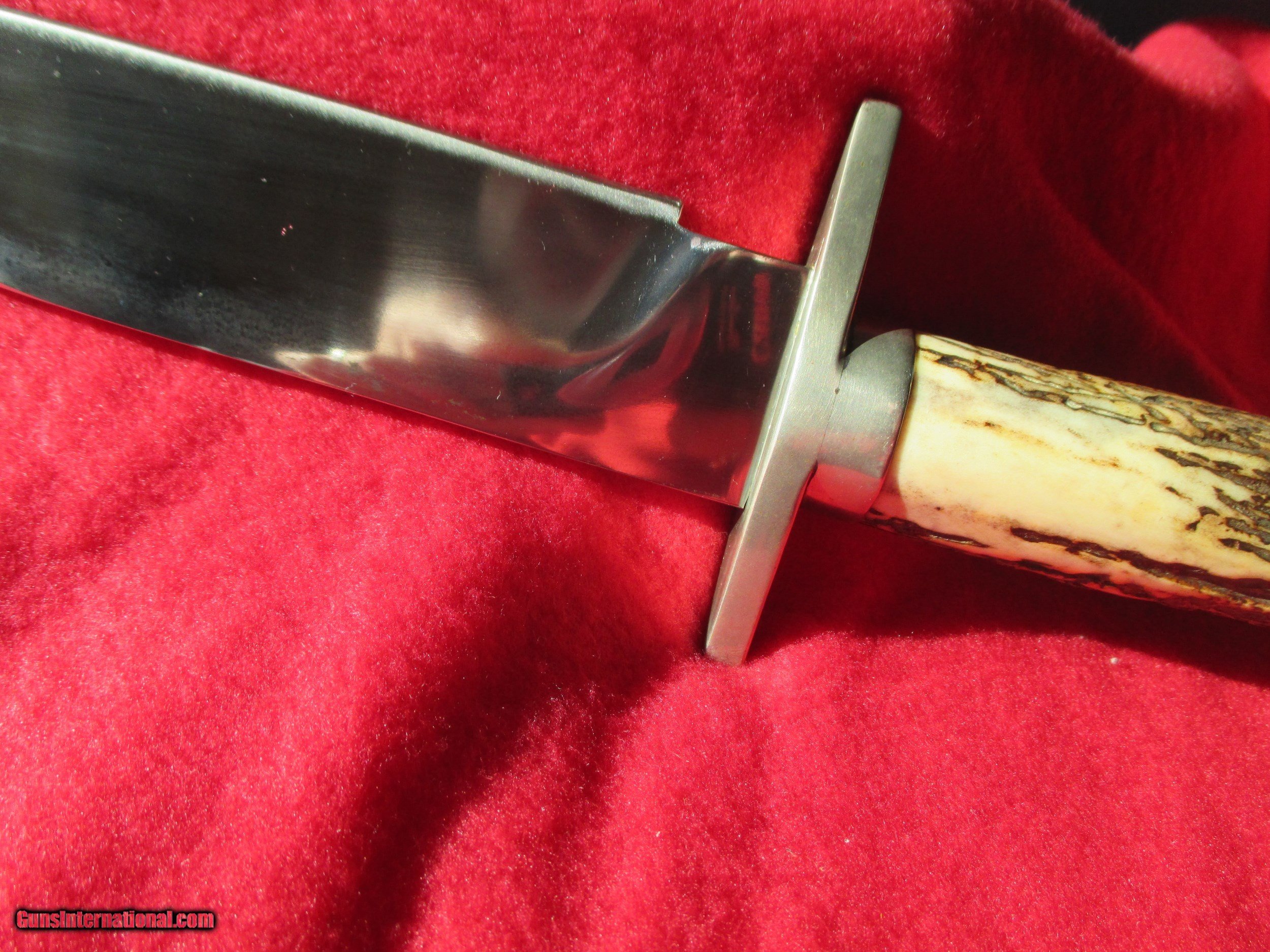 Description: Walter Kneubuhler Custom Bowie. Walter made knives from the mid 1950s to the early 1980s in Pioneer Ohio. Mr. Kneubuhler passed away June of 1982. This Bowie is 14 5/8 inches in length with a blade that is 1/4 inch thick and 9 3/4 inchs long. It's a magnificent knife with German silver fittings and weighs with case over 1 pound and nine oz. Alan 810-922-4279 please call or email between 10 am and 7 pm est. SOLD |