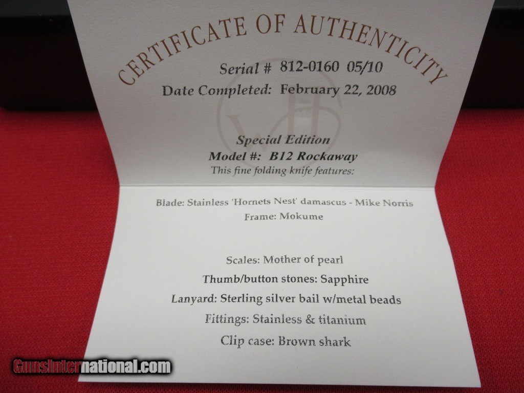 Description: This is knife #5 of 10. It is in as new condition with the display case and certificate of authenticity. SOLD |