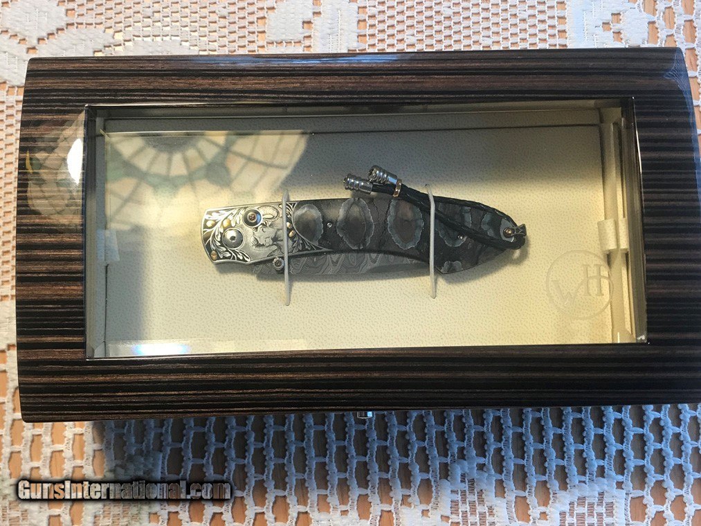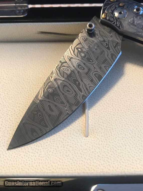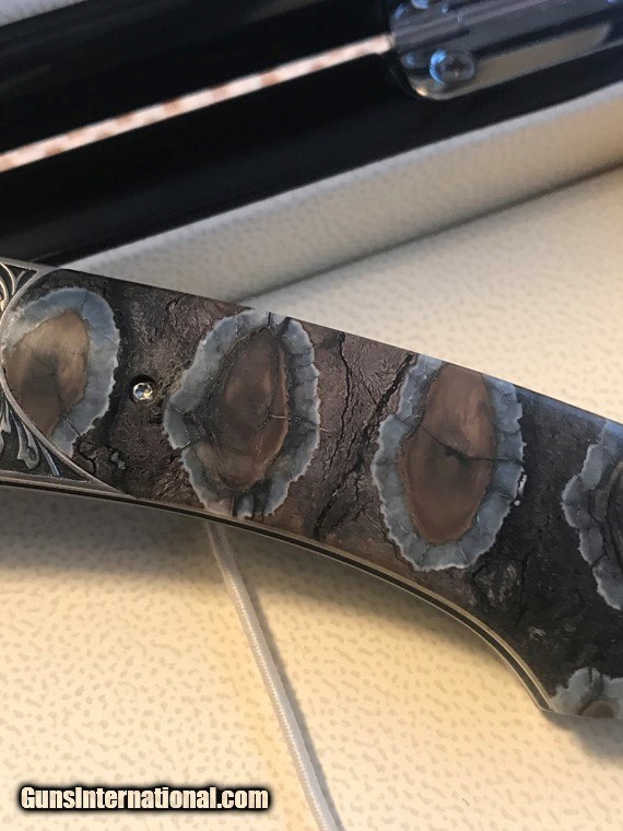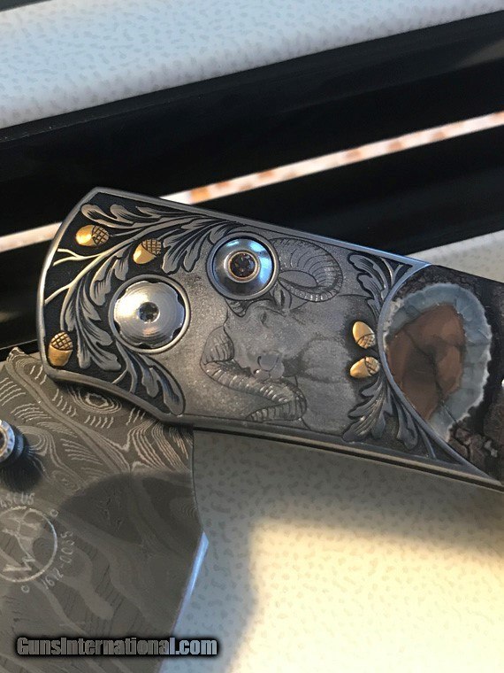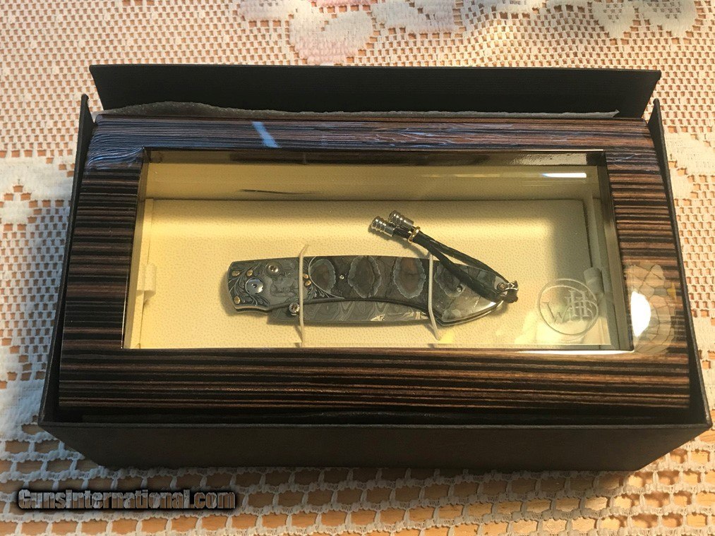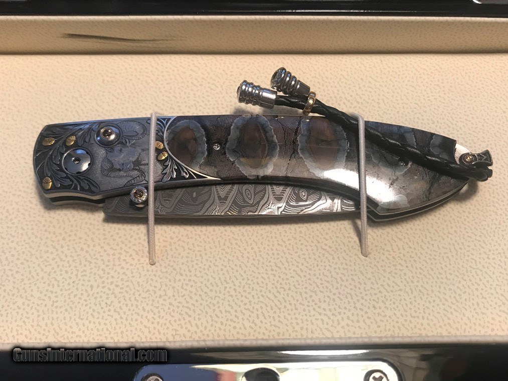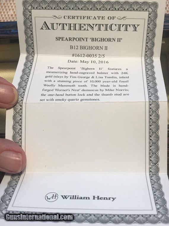 Description: The Spearpoint ‘Bighorn II’ features a mesmerizing hand-engraved bolster with 24K gold inlays by Tim George & Lisa Tomlin, inlaid with a stunning piece of 10,000 year-old fossil Woolly Mammoth tooth. The blade is hand-forged 'Hornet's Nest' damascus by Mike Norris; the one-hand button lock and the thumb stud are set with smoky quartz gemstones. A remarkable design that gives you an instrument with a full-size secure grip, and a versatile deep-belly blade, the Spearpoint epitomizes William Henry’s core philosophy – that superlative function deserves to be elevated to superlative art. The ‘Bighorn II’ features some of the most exotic materials, artistry and forged metals that are the hallmark of William Henry's collections; a timeless heirloom to be proudly worn and used for a lifetime before being handed-down to another generation. Features & Specs Blade 3.06" (77.7mm) Handle 4.13" (104.9.5mm) Overall open 7.19" (182.6mm) Handle 4.13" (104.9.5mm) Overall open 7.19" (182.6mm) SOLD |