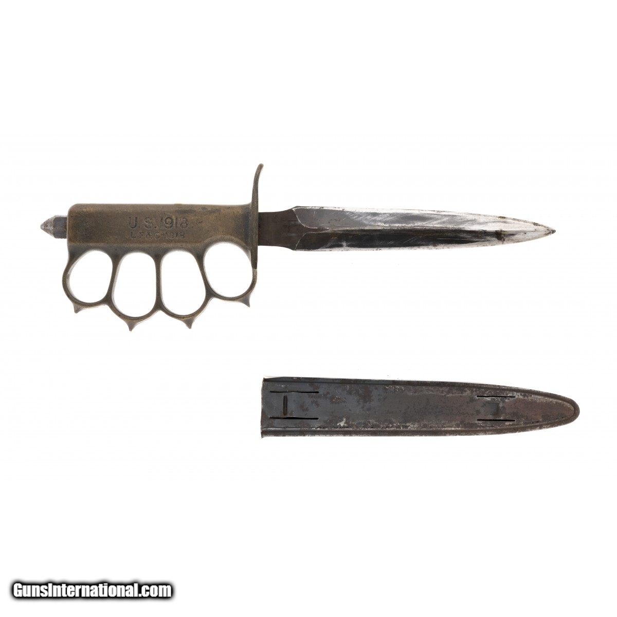 1918 Trench Knife by L.F. & C. Blade has been sharpened. Scabbard is marked ""L.F.&C. 1918"". Good overall condition.