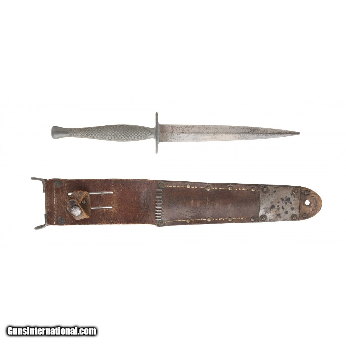 Scarce WWII fighting knife. Blade is beginning to turn a gray patina. Scabbard is good with a pin up carved on front. Hard to find.