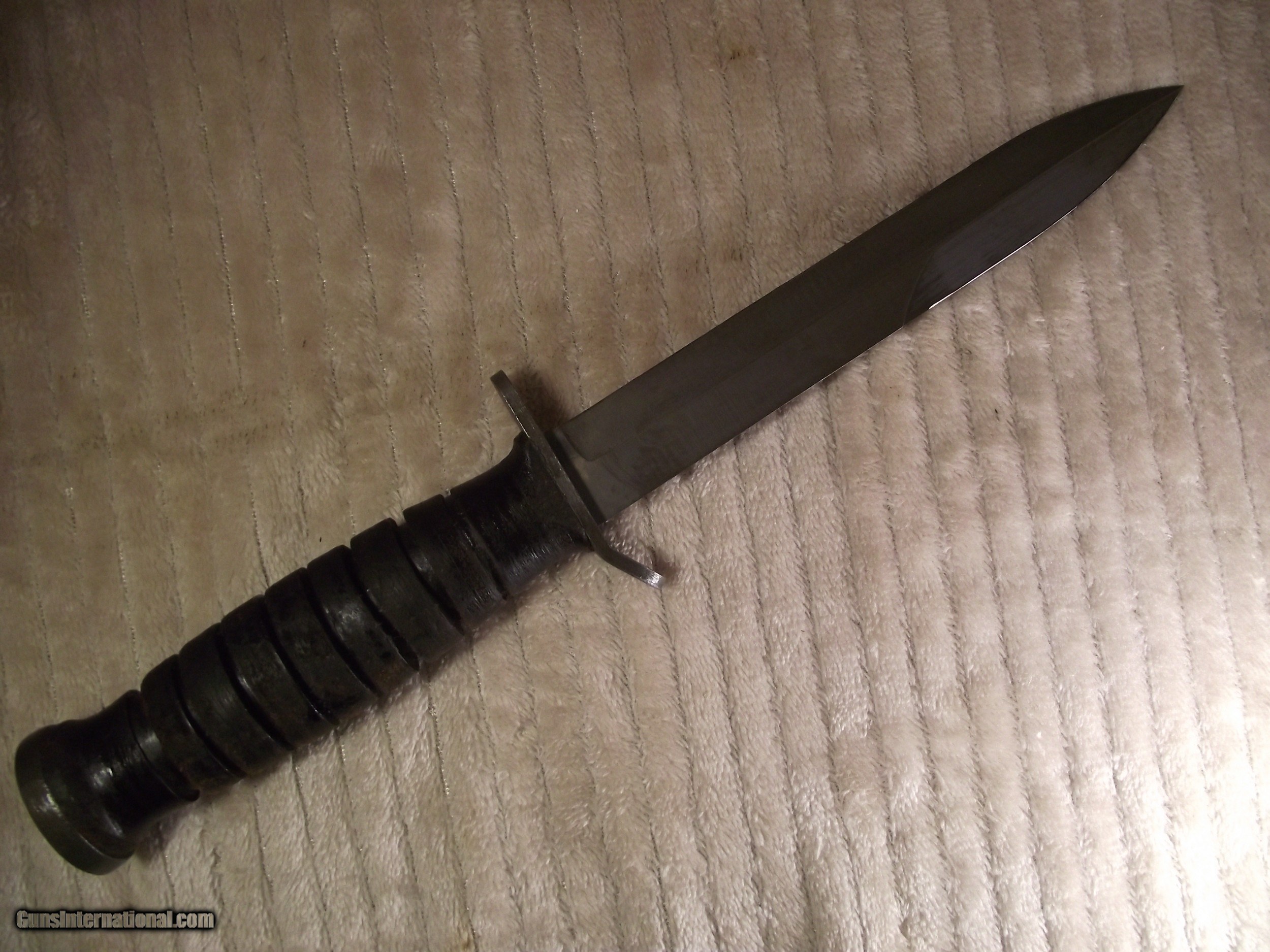 Description: This U.S. M3 Fighting Knife manufactured by IMPERIAL from early WWII is in pristine condition. The blade has no patina, rust, or stains and has only been factory sharpened, which is hard to see evidence of. The spine (straight top edge) of the blade has no damage. You can still see the original machining marks on the blade which measures 6 13/16" from the bolster (hand guard) to the tip. The point (tip) of the blade is needle sharp and perfectly shaped. The full leather layered handle has crisp void edges and shows what I call fuzzing in areas where the leather's grain runs opposed to the finish trim. The leather is quite supple and can provide a full purchase for maximum grip. The pummel (butt end) of the tang (metal spar under the handle) is not damaged and sports the pronounced flaming bomb cartouche mark. The proof that this fighting knife is the real deal is the staking or peening of the end of the tang rod that holds the whole thing together. Take a close look at the picture of the pommel and you see the sun's rays marking on the end of the tang and a little on the pummel. The Original M6 Leather Scabbard was manufactured in 1943 by L&C (Lyons & Coulson Leather Company) and inspected by FJA (Brigadier General Frank J Atwood) at the U.S. Arsenal. The scabbard (sheeth) is the only part of the set that shows minimal wear. There is absolutely no corrosion on the metal parts and the handle strap snap still secures tightly. This M3 Fighting Knife and M6 Leather Scabbard likely did not see any "battle action" during WWII. At most, it may have been used as a letter opener and very few at that. This is definitely a piece of WWII history that you could be proud to add to your WWII militaria collection. Take a close look at the pictures and you will agree. If needed I have many more pictures I can email you. Thanks for looking. Accepted method of payment is USPS Money Order or pre-arranged means. I will fully insure and ship this set FREE within the 48 contiguos United States ! SOLD |