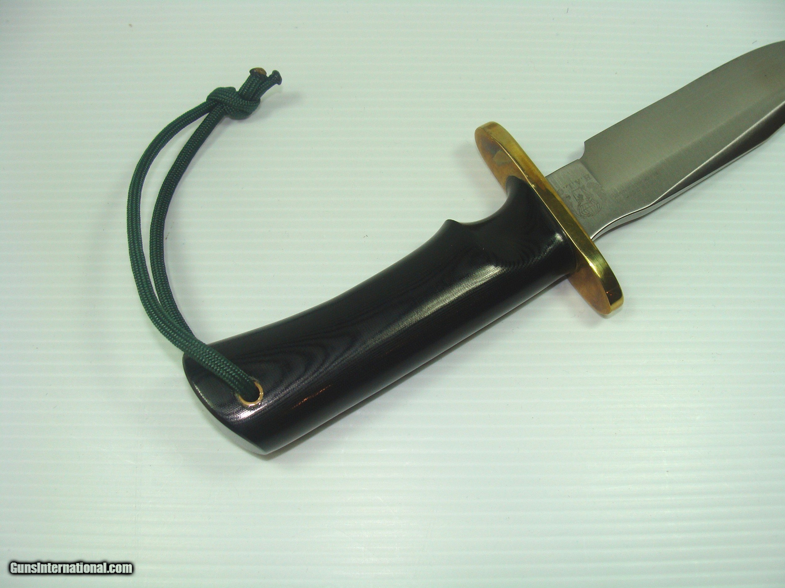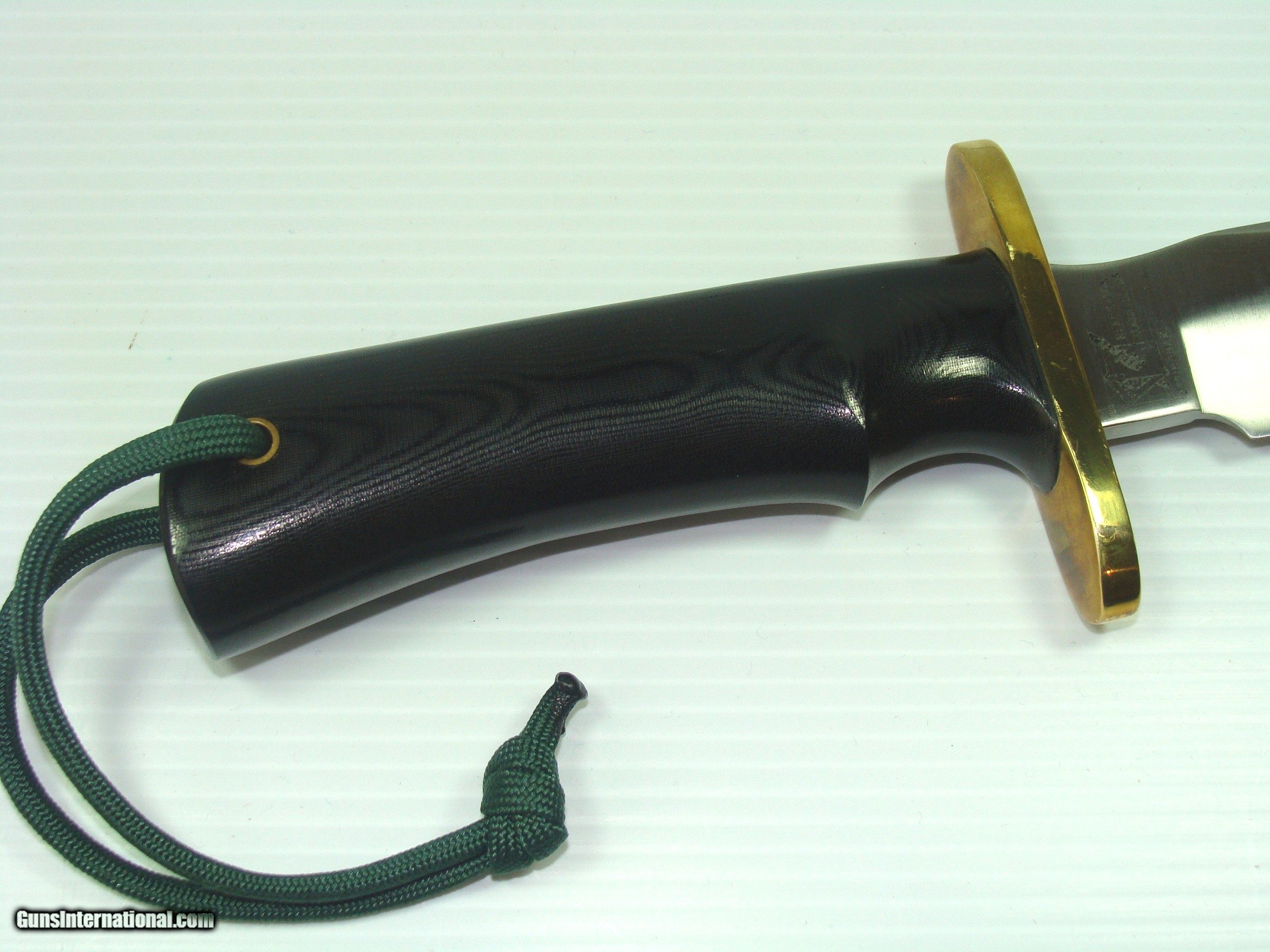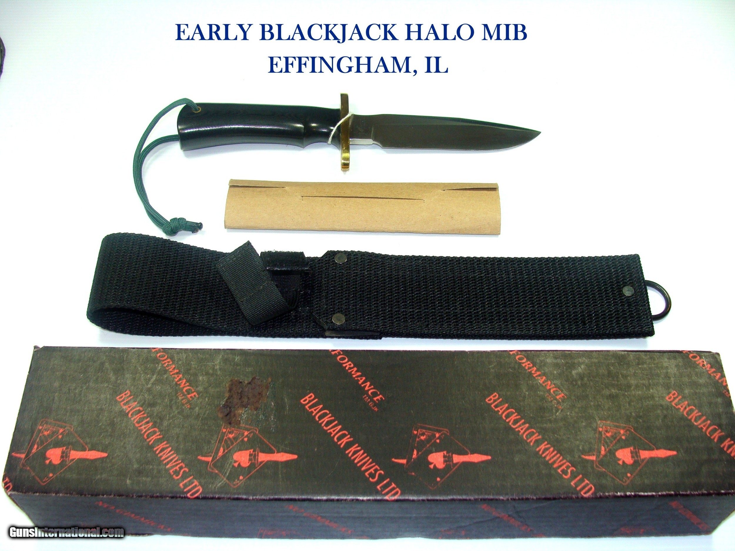 Description: SCARCE, PRE-BLACKJACK "HALO" ("EK COMMANDO KNIFE CO".) ABN. FIGHTING KNIFE (TRANSITIONAL MODEL) MIB! This superb knife remains in pristine mint condition. The 5 1/2" blade remains in pristine mint condition. There are NO scratches, scuffs, nor marks anywhere on the blade! A.G. Russell, who was a retailer for Black Jack logo knives, for only a short period of time, shows their BJ logo is present. The handles are superb swirl, Black Micarta. The brass guard has NOT been buffed, nor polished. Only it's attractive age toning is present. The lanyard hole is brass lined, and there is a paracord attached w/"burned" ends so they won't fray. It comes with a brown cardboard "blade protector", but I have attached one of my acid-free blade protectors as the factory one is from acid brown treated cardboard which over time will attack bright polish blades. There is a fabulous great heavy dutyscabbard w/John Ek sewed label on the back. The original box is in NM condition. Overall a pretty rare knife with only a "small" production run. MADE IN EFFINGHAM, IL. UNITED STATES! NOT IMPORTED! Note, very slight movement from crossguard, mentioned for accuracy. The knife is NOT "loose". The guard is soldered to the blade. Nothing can become loose. ~~~~~~~~~~~~~~~~~~~~~~~~~~~~~~~~~~~~~~~~~~~~~~~~~~~~~~~~~~~~~~~~~~~~~~~~~~~~~~~~~~~~~~~~~~~~~~~~~~~~~~~~~~~~~~~~~~~~~~~~~~~~~~~~~~~~~~~~~~~~~~~~~~~~~~~~~~~~~~~ If you have any questions regarding this, or any Allied Military Fighting Knife, please let me know. This has been my passion: collecting and dealing in HIGH CONDITION, Allied Military Fighting Knives 1941-1975, incl. Randall Model's 1 & 2 1950-1975, & Gerber Mk.2 Fighting Knives 1967-1975. I personally guarantee the authenticity of any knife that I sell. My grading is accurate and conservative. These military artifacts are sold as historical and collectible items only. The items are warranted to be as described and shown in the photographs. No guarantee or warranty is expressed or implied as to the usability of the items for its original purpose. The buyer certifies that he or she is of lawful age and is not prevented by any law from the purchase or possession of these items. The buyer is responsible for knowing, understanding and obeying all International, Federal, State and Local laws concerning the purchase and possession of these items. Thanks & Good Luck! SOLD |