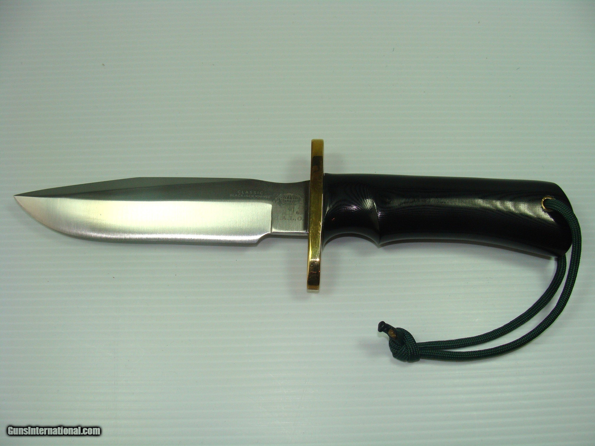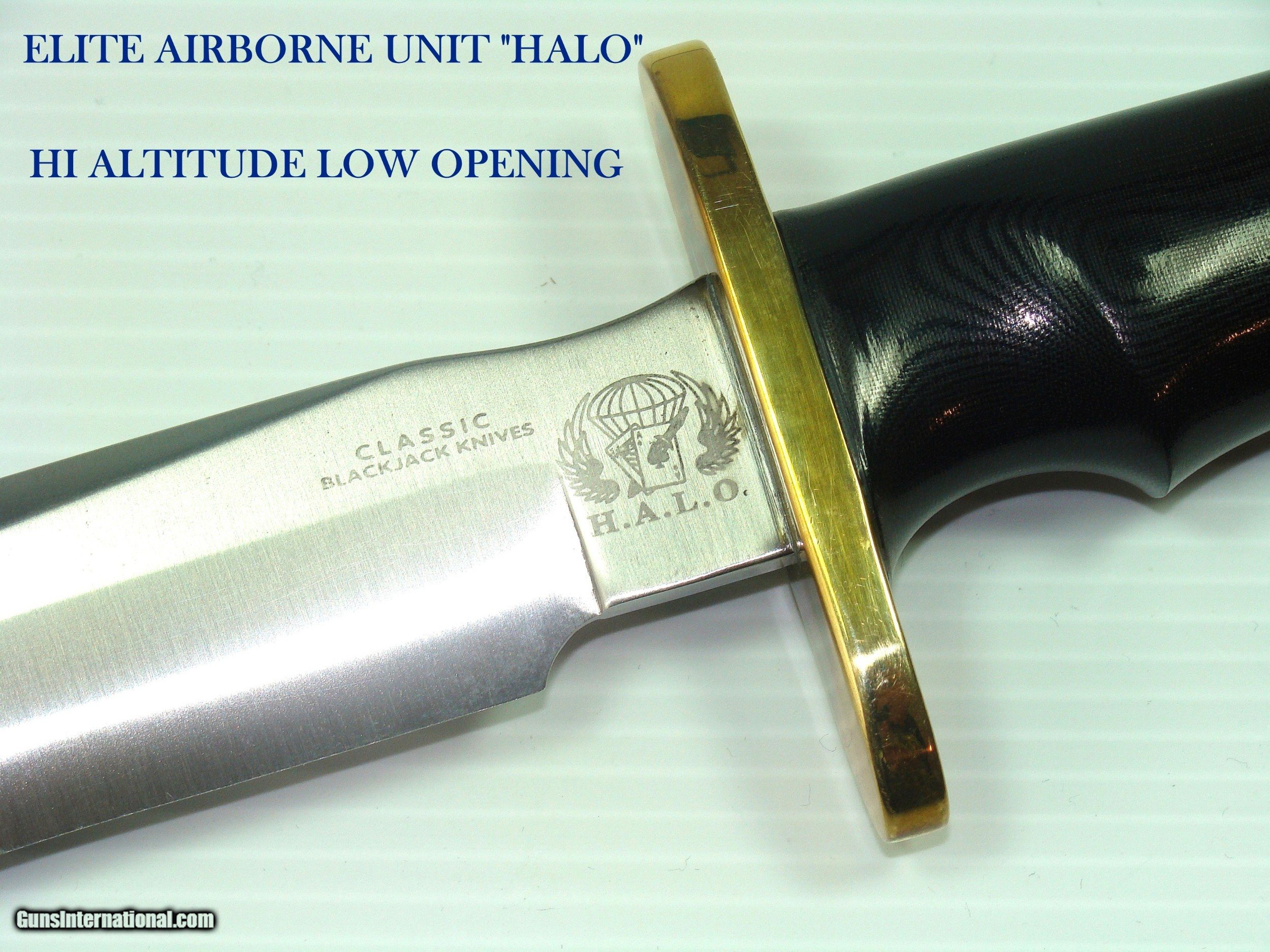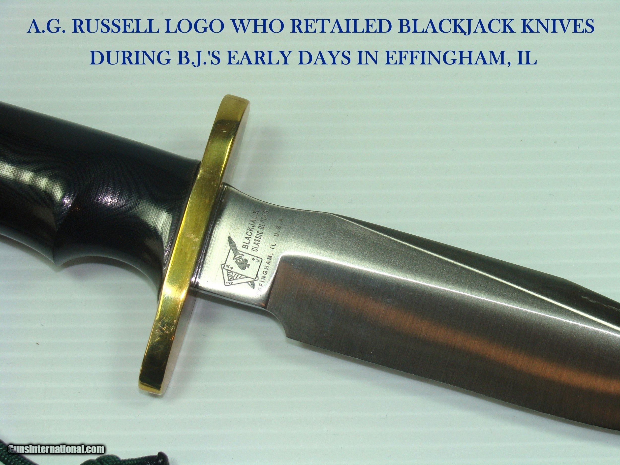 Description: SCARCE, PRE-BLACKJACK "HALO" ("EK COMMANDO KNIFE CO".) ABN. FIGHTING KNIFE (TRANSITIONAL MODEL) MIB! This superb knife remains in pristine mint condition. The 5 1/2" blade remains in pristine mint condition. There are NO scratches, scuffs, nor marks anywhere on the blade! A.G. Russell, who was a retailer for Black Jack logo knives, for only a short period of time, shows their BJ logo is present. The handles are superb swirl, Black Micarta. The brass guard has NOT been buffed, nor polished. Only it's attractive age toning is present. The lanyard hole is brass lined, and there is a paracord attached w/"burned" ends so they won't fray. It comes with a brown cardboard "blade protector", but I have attached one of my acid-free blade protectors as the factory one is from acid brown treated cardboard which over time will attack bright polish blades. There is a fabulous great heavy dutyscabbard w/John Ek sewed label on the back. The original box is in NM condition. Overall a pretty rare knife with only a "small" production run. MADE IN EFFINGHAM, IL. UNITED STATES! NOT IMPORTED! Note, very slight movement from crossguard, mentioned for accuracy. The knife is NOT "loose". The guard is soldered to the blade. Nothing can become loose. ~~~~~~~~~~~~~~~~~~~~~~~~~~~~~~~~~~~~~~~~~~~~~~~~~~~~~~~~~~~~~~~~~~~~~~~~~~~~~~~~~~~~~~~~~~~~~~~~~~~~~~~~~~~~~~~~~~~~~~~~~~~~~~~~~~~~~~~~~~~~~~~~~~~~~~~~~~~~~~~ If you have any questions regarding this, or any Allied Military Fighting Knife, please let me know. This has been my passion: collecting and dealing in HIGH CONDITION, Allied Military Fighting Knives 1941-1975, incl. Randall Model's 1 & 2 1950-1975, & Gerber Mk.2 Fighting Knives 1967-1975. I personally guarantee the authenticity of any knife that I sell. My grading is accurate and conservative. These military artifacts are sold as historical and collectible items only. The items are warranted to be as described and shown in the photographs. No guarantee or warranty is expressed or implied as to the usability of the items for its original purpose. The buyer certifies that he or she is of lawful age and is not prevented by any law from the purchase or possession of these items. The buyer is responsible for knowing, understanding and obeying all International, Federal, State and Local laws concerning the purchase and possession of these items. Thanks & Good Luck! SOLD |