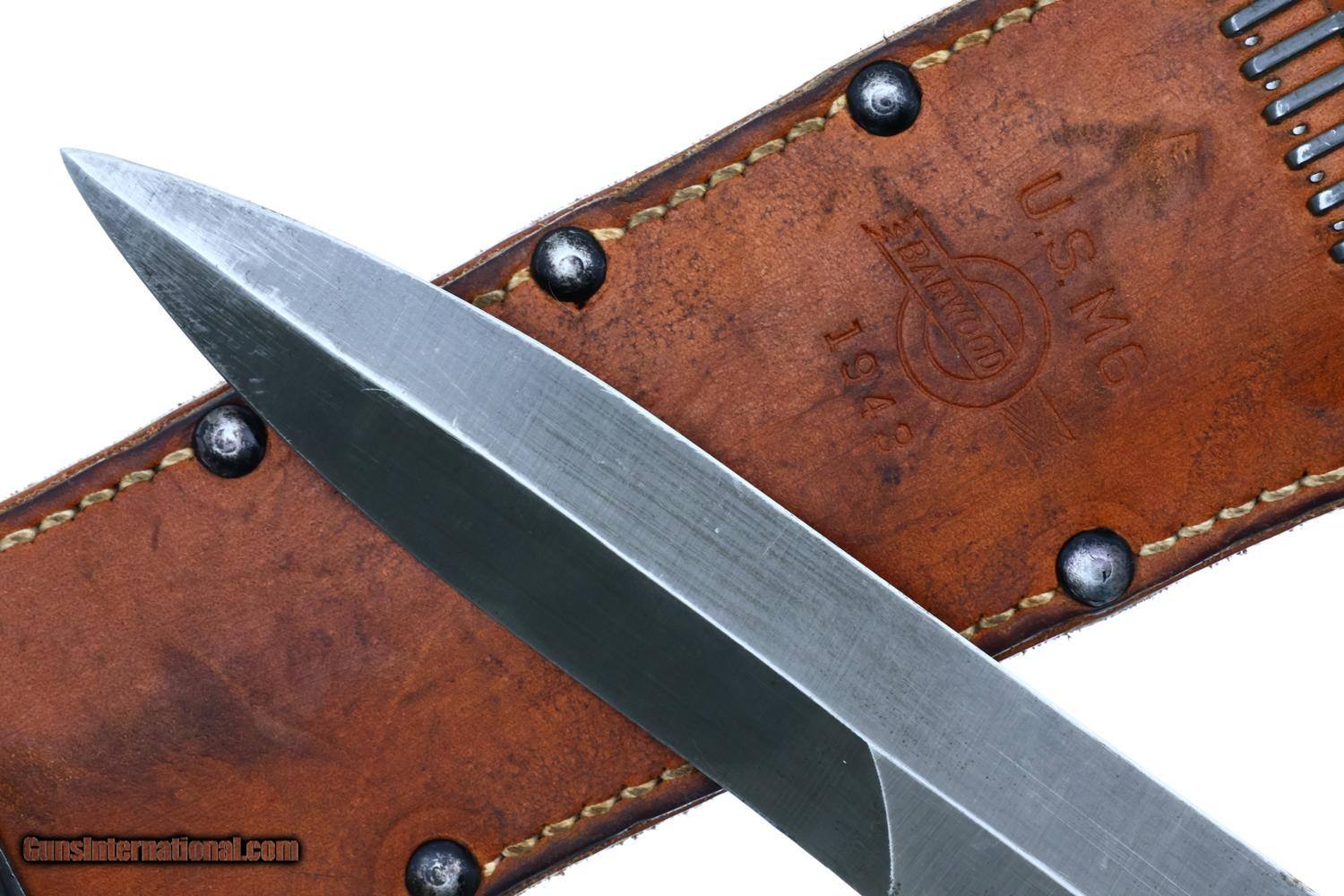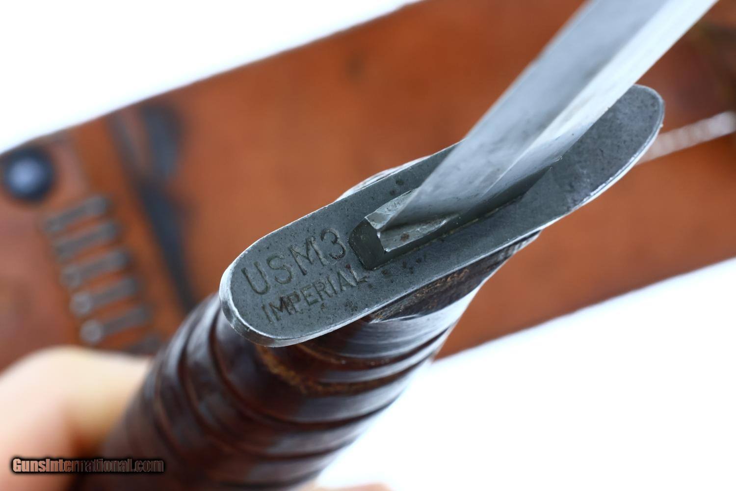 Standard configuration M3 fighting knife produced by Imperial from March 1943 to August 1944 with approximately 2,590,247 M3 manufactured, with 6.75" spear point blade with sharpened 3.5" secondary edge, steel cross guard with angular bend at one end to facilitate a thumb rest marked "US M3/IMPERIAL" and stacked leather washer handle shaped by turning on a lathe, then polished and lacquered. Flat oval pommel cap marked with ordnance flaming bomb proof. Complete with a brown leather sheath marked "U.S. M6 BARWOOD 1948" withbelt attachment, metal studs, and reinforced stitching along the edges secured with green cord binding at the base. The M3 was first issued to U.S. Army soldiers in March 1943 with priority given to elite units such as airborne troops and Army Rangers. In August 1944, the M3 was declared a limited standard ordnance item with supplies to be issued until exhausted, having been replaced by the M4 bayonet.