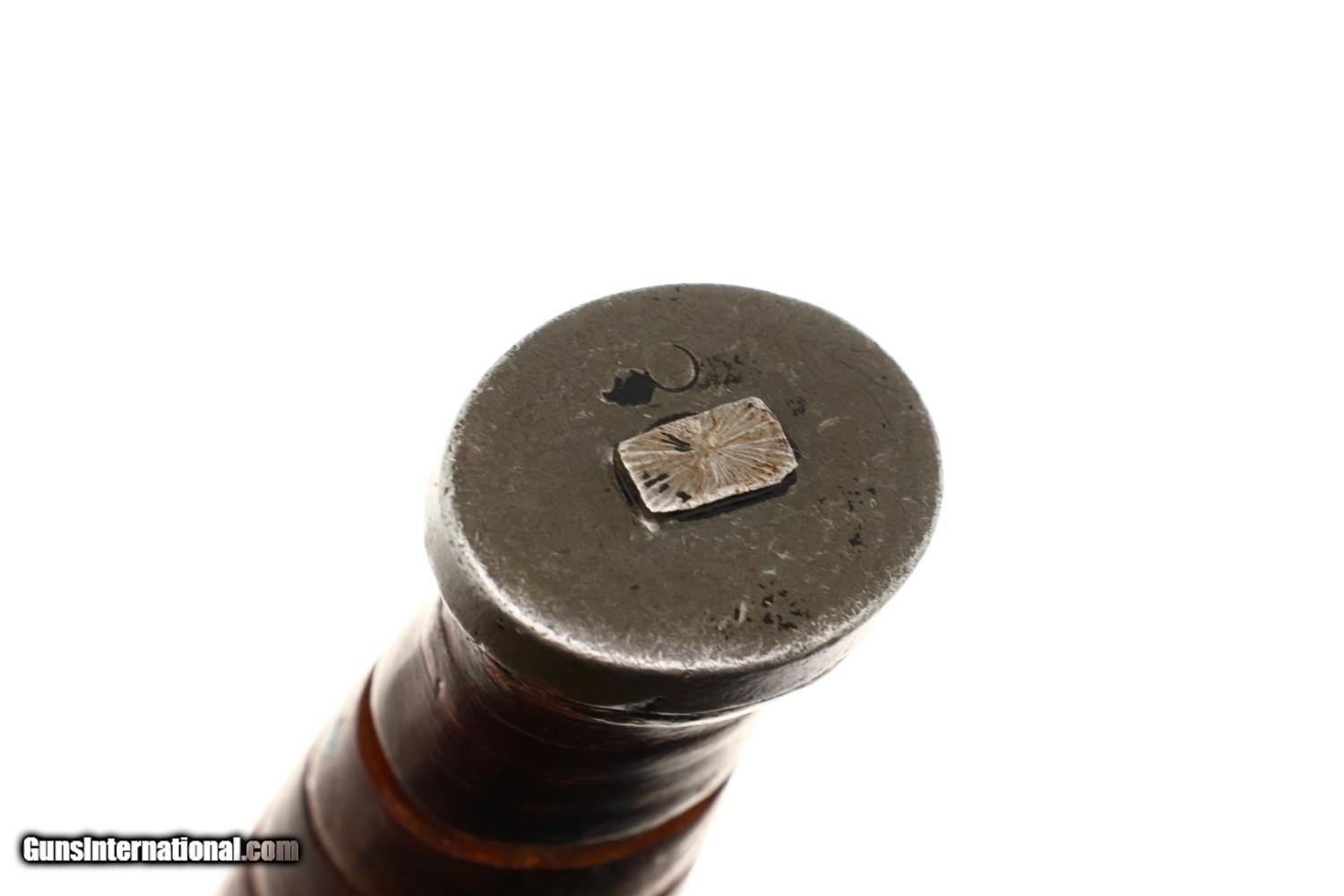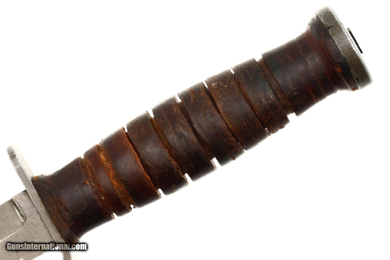 Description: Synopsis: Attractive and all-original M3 fighting knife made by Imperial with correct 1943 U.S. M6 sheath. The classic US military fighting knife from World War II, later replaced by the M4. A great Valentine's Day selection for that "special someone." Description: Standard configuration M3 fighting knife produced by Imperial from March 1943 to August 1944 with approximately 2,590,247 M3 manufactured, with 6.75" spear point blade with sharpened 3.5" secondary edge, steel cross guard with angular bend at one end to facilitate a thumb rest marked "US M3/IMPERIAL" and stacked leather washer handle shaped by turning on a lathe, then polished and lacquered. Flat oval pommel cap marked with ordnance flaming bomb proof. Complete with a brown leather sheath marked "U.S. M6 BARWOOD 1948" withbelt attachment, metal studs, and reinforced stitching along the edges secured with green cord binding at the base. The M3 was first issued to U.S. Army soldiers in March 1943 with priority given to elite units such as airborne troops and Army Rangers. In August 1944, the M3 was declared a limited standard ordnance item with supplies to be issued until exhausted, having been replaced by the M4 bayonet. Condition: VG all-original knife and sheath with fading, handling marks, and discolorations as might be expected from a U.S. military fighting knife that saw several years of actual service. SOLD Manufacturer: Imperial Model: M3 Military Fighting Knife |