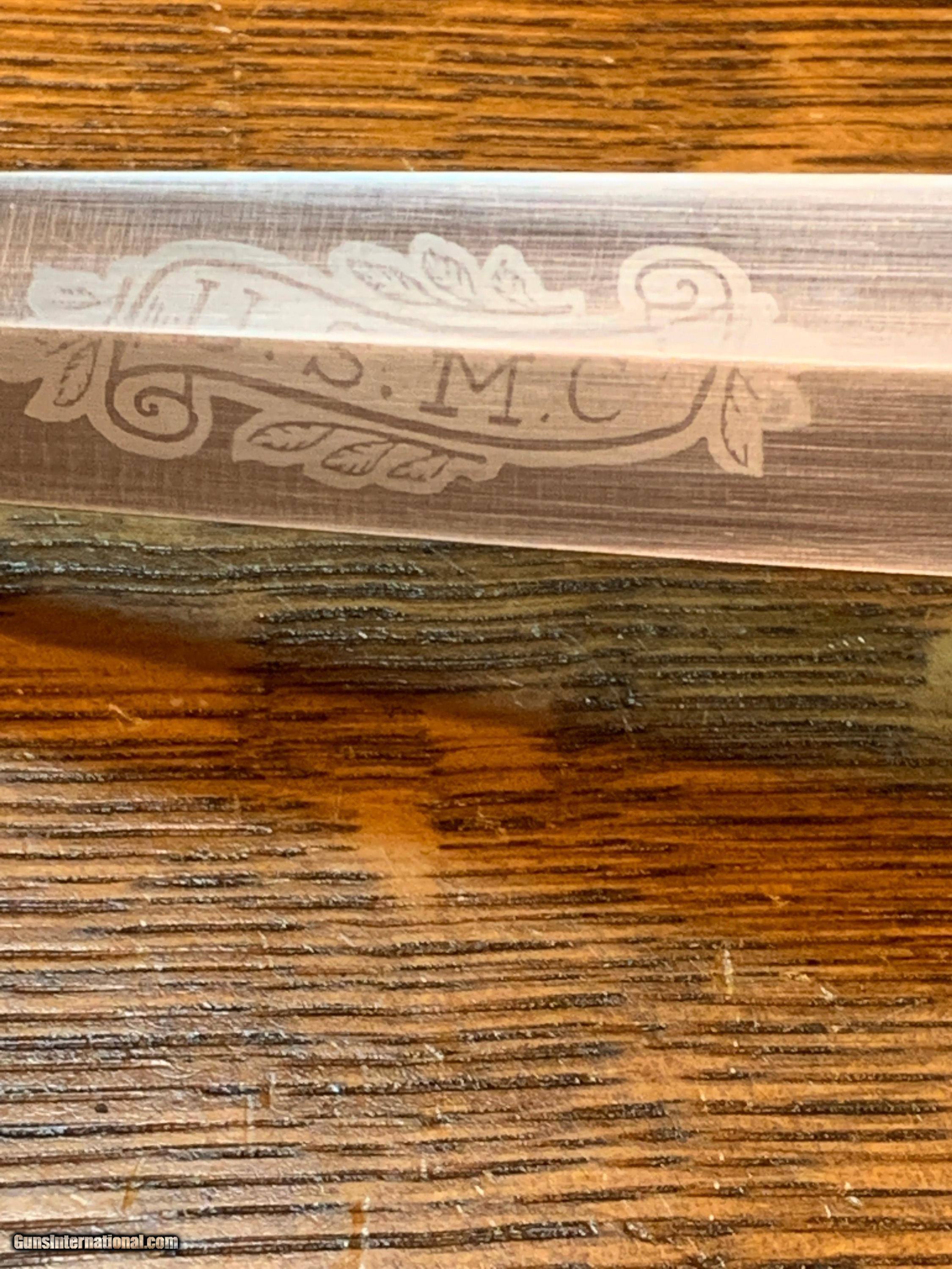Description: WWII USMC RAIDER STILETTO MADE BY CAMILLUS CUTLERY CO. IN CAMILLUS NY. MINTY!! ABOUT AS GOOD AS YOU COULD EVER FIND ONE FOR YOUR COLLECTION. NO USUAL DAMAGE TO THE ZINC HANDLE AS OFTEN SEEN. JUST A COUPLE OF DISCOLORATION MARKS AS SEEN IN PICS. BLADE IS PERFECT WITH ALL CROSS GRAINING AND GORGEOUS USMC AND MAKER MARKS. POINT OF BLADE AS PERFECT AND ORIGINAL. SHEATH IS EXCELLENT PLUS. WITH LEG TIE AS ORIGINAL. PLEASE CALL 973-214-3407 WITH QUESTIONS. THANKYOU SOLD |
