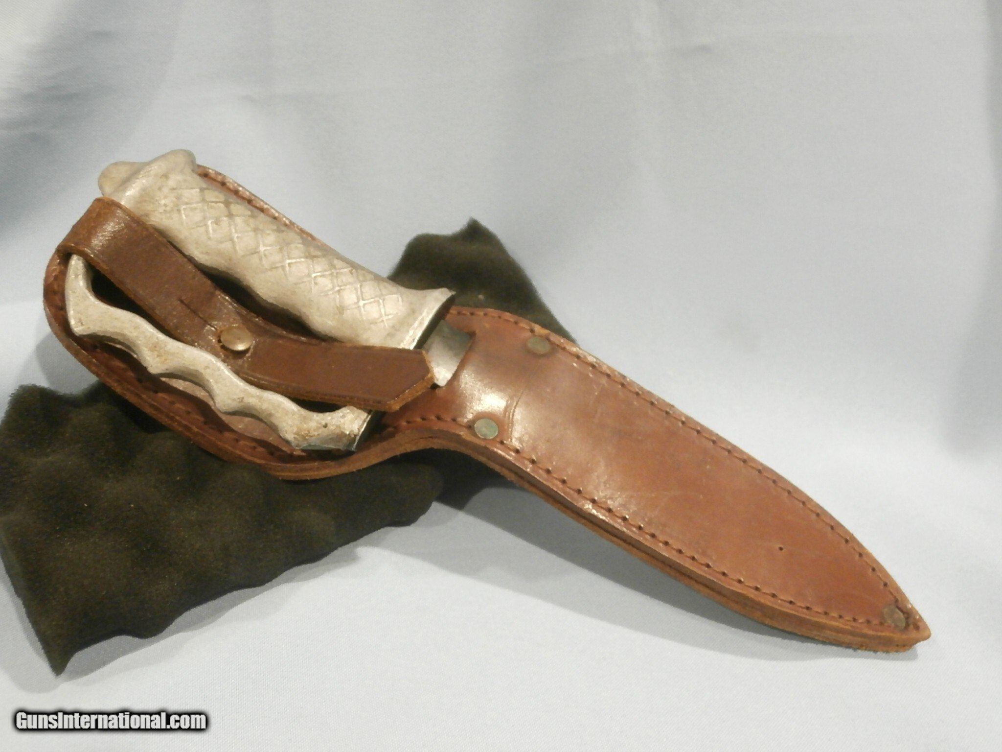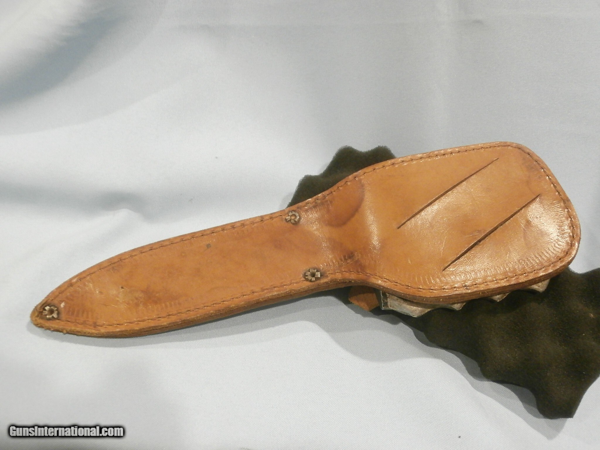 Description: WWII NEW ZEALAND KNUCKLE KNIFE ORIGINAL WWII NEW ZEALAND KNUCKLE FIGHTING KNIFE WWII US PACIFIC THEATER FIGHTING KNIFE SCARCE, DOUBLE-EDGE, BLADE!!...SEE PICS. 6 1/4" DOUBLE EDGED BLADE HAS APPROX. 80% ORIGINAL BLACK FINISH...SEE ALL PICS. BLADE REMAINS RAZOR SHARP!! THE GRIP IS IN VERY-GOOD-PLUS ORIGINAL CONDITION!!...SEE ALL PICS. THE ORIGINAL SCABBARD IS IN 98% MINT CONDITION!!!...SEE PICS. THE BLADE AND SCABBARD ARE BOTH UNMARKED AND STERILE, WHICH IS CORRECT. THIS IDENTICAL KNIFE AND SCABBARD ARE BOTH PICTURED AND DESCRIBED IN RON FLOOK'S BOOK ONE, ON PAGE 215, PLATE 521. THESE KNIVES ARE ALSO FEATURED IN MIKE SILVEY'S EXCELLENT BOOKS, COLES' BOOKS, GREG ALOISIO'S KNUCKLE KNIFE BOOKS AND MANY OTHER STANDARD REFERENCE BOOKS. THESE NEW ZEALAND FIGHTING KNIVES, IN MANY FORMS, WERE USED BY U.S. AND ALLIED FORCES THROUGHOUT THE PACIFIC THEATER DURING WWII!! Price: $799.95 Contact Seller |