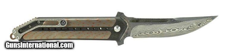 Description: "Begg “Kwaiken" Knife. Damasteel blade with jeweled liners, carbon fiber scales and super-conductor inlays. SOLD |