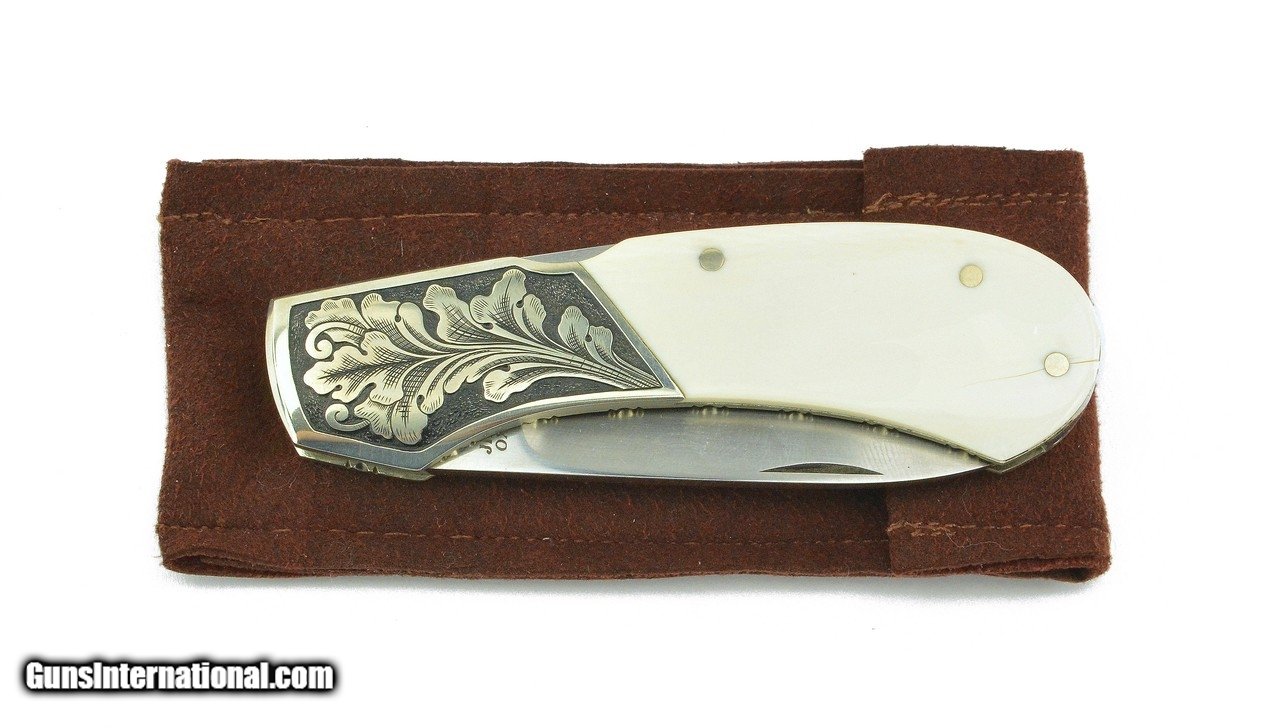 Description: "Jim Martin Lock Back Knife. Beautiful lock back knife with 2 ½" blade, engraved dovetail cut bolster, and bone handle. Grips are very good with minor cracks. Very good plus overall condition. A reasonably priced Jim Martin knife. SOLD |