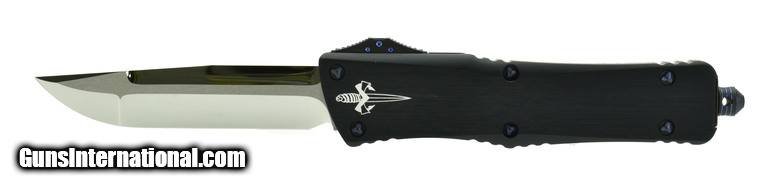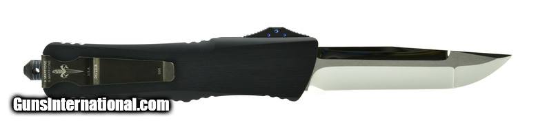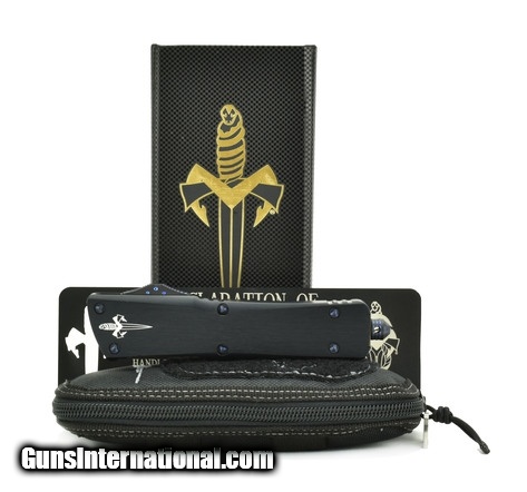 Description: "Marfione Custom Combat Troodon with star grind mirror polish blade. Anodized hefted alloy handle with blue ringed titanium hardwear. SOLD |