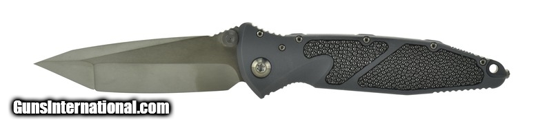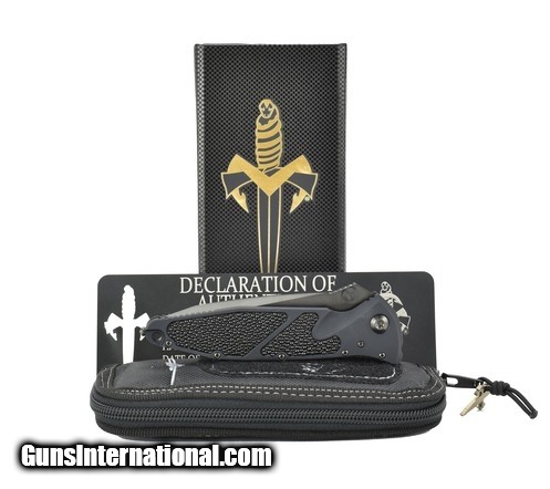 Description: "Marfione Socom Elite Flipper. Tanto chisel grind DLC two-tone apocalyptic finish blade, anodized alloy handle with stingray inlay and DLC two-tone hardware. SOLD |