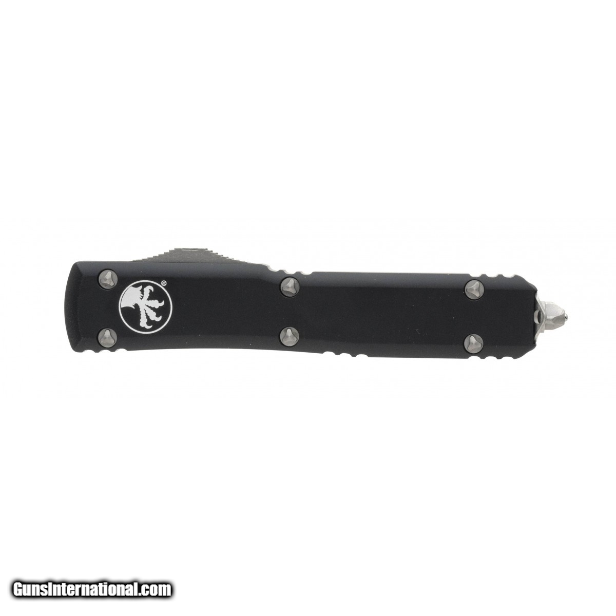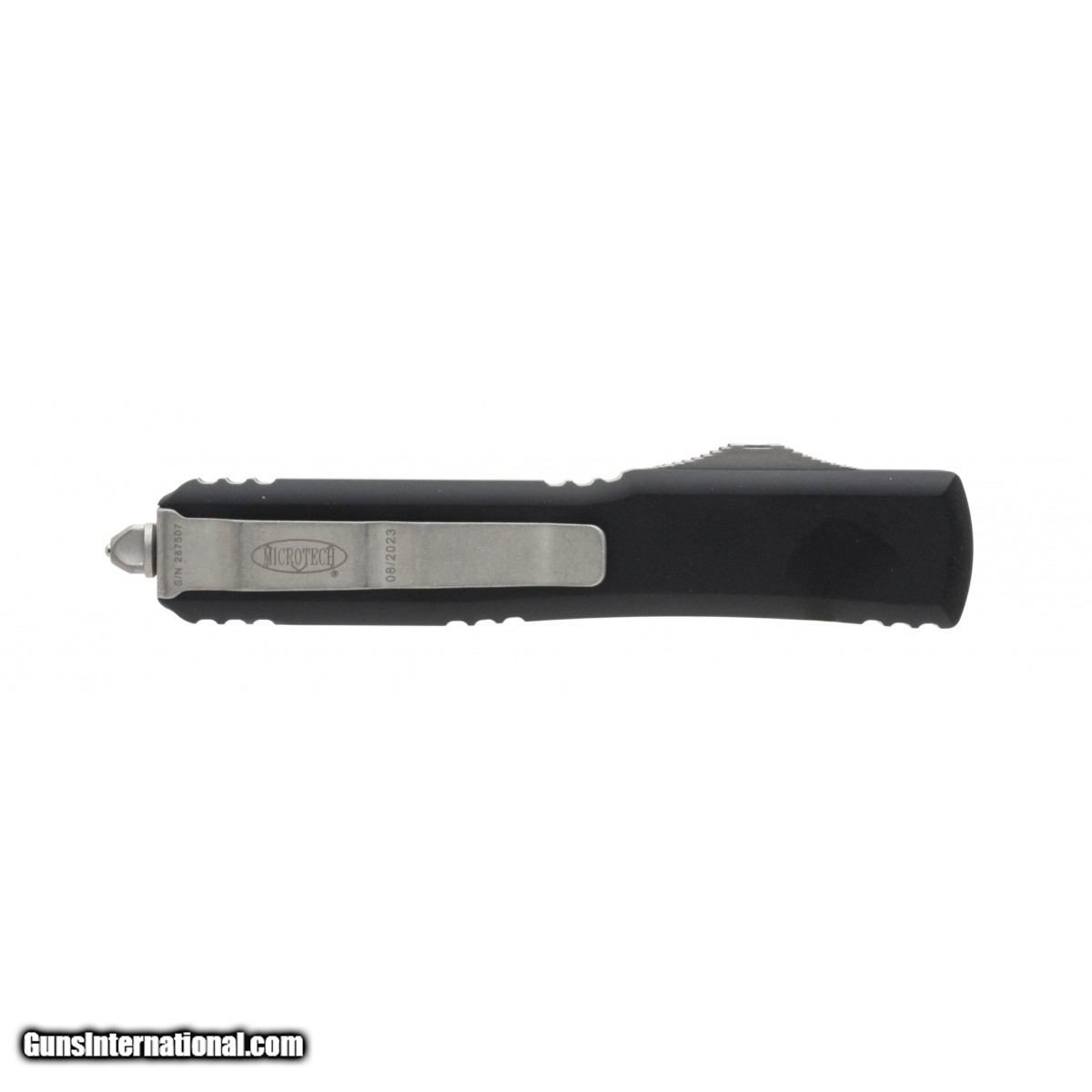 Microtech OTF knife with 3.35"" blade length and an overall length of 8.35"". Black aluminum handle with apocalyptic blade finish. NEW. SN:287501. UPC: 841768103554.