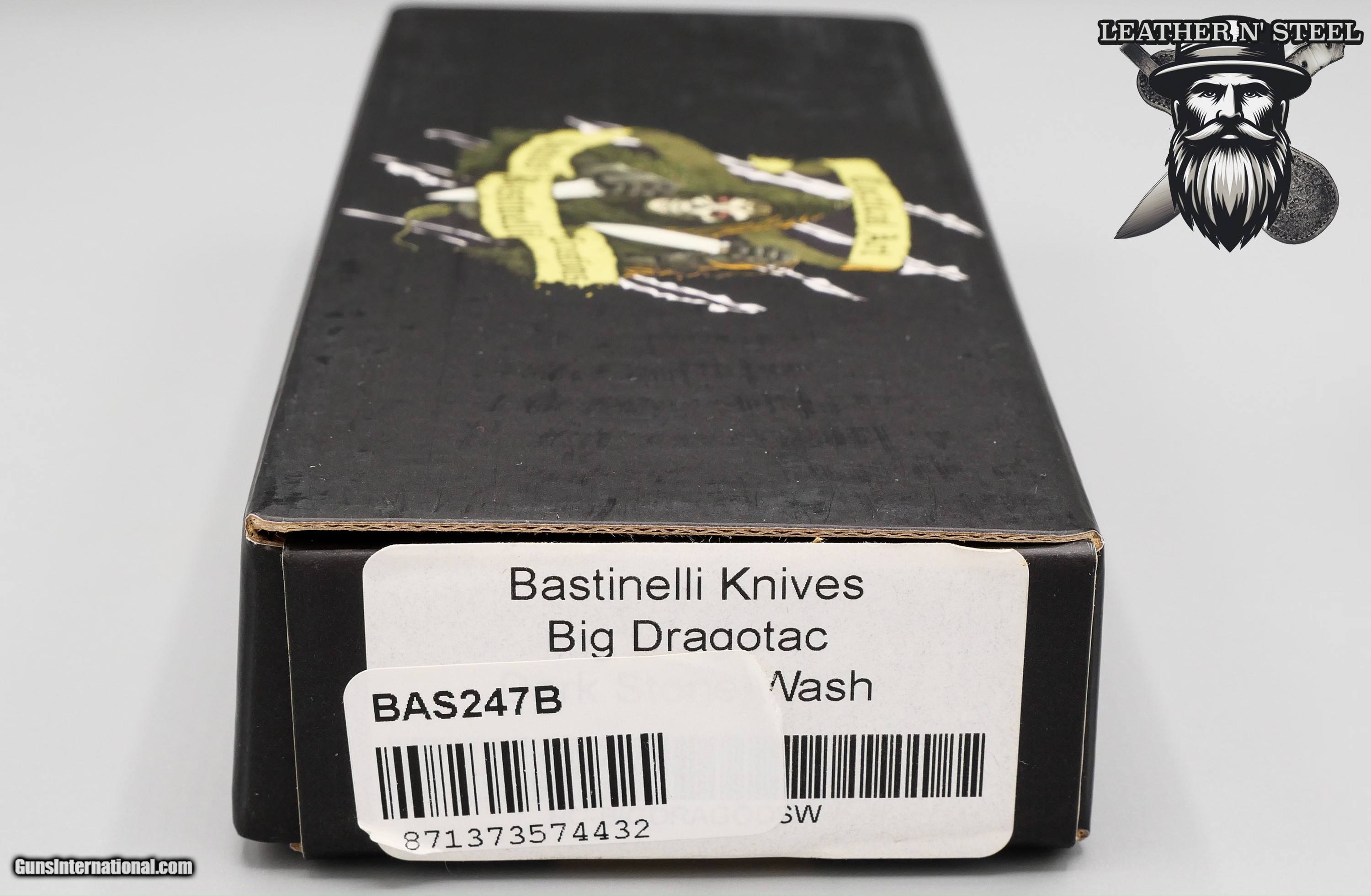 Model - BAS247B. Bastinelli Creations BIG Dragotac. BIG Dragotac folder with M390 dark stonewash blade. Plain edge. Black G10 handles. Made in Italy.