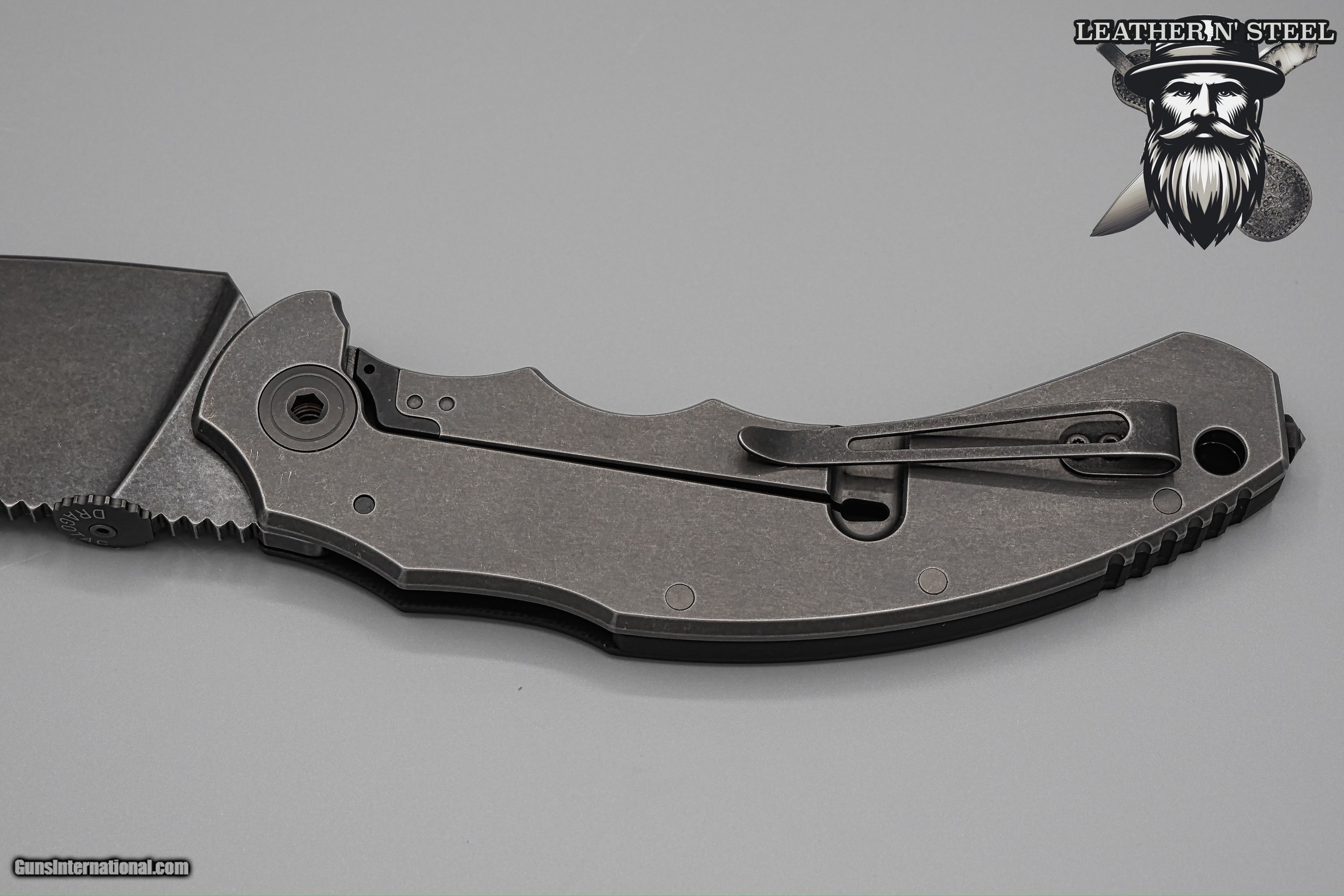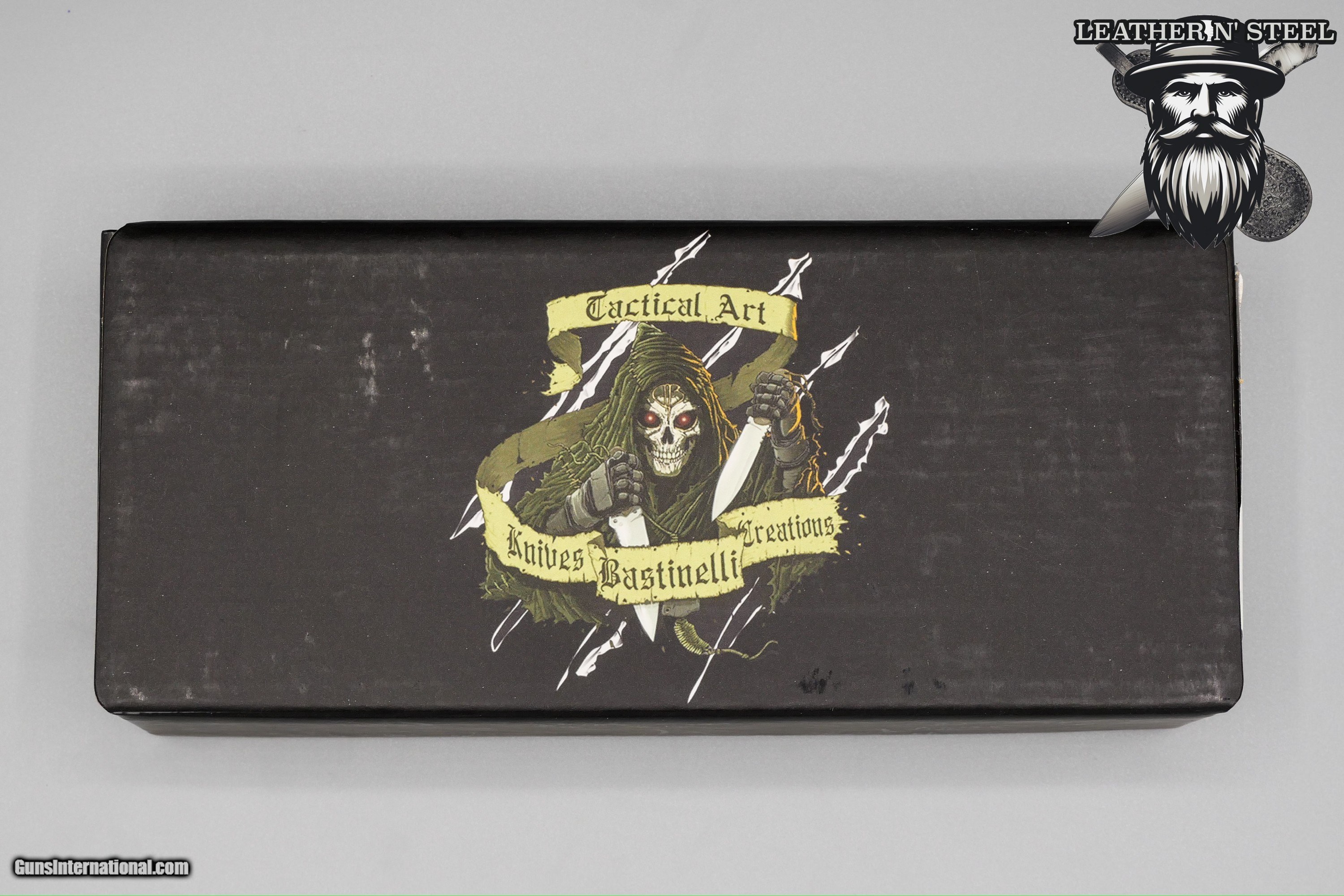 Description: This Bastinellei Creations is a solid, well-designed, large tactical frame lock folding knife. The wharncliffe blade is flat ground and is 4.625” long. This knife is new.