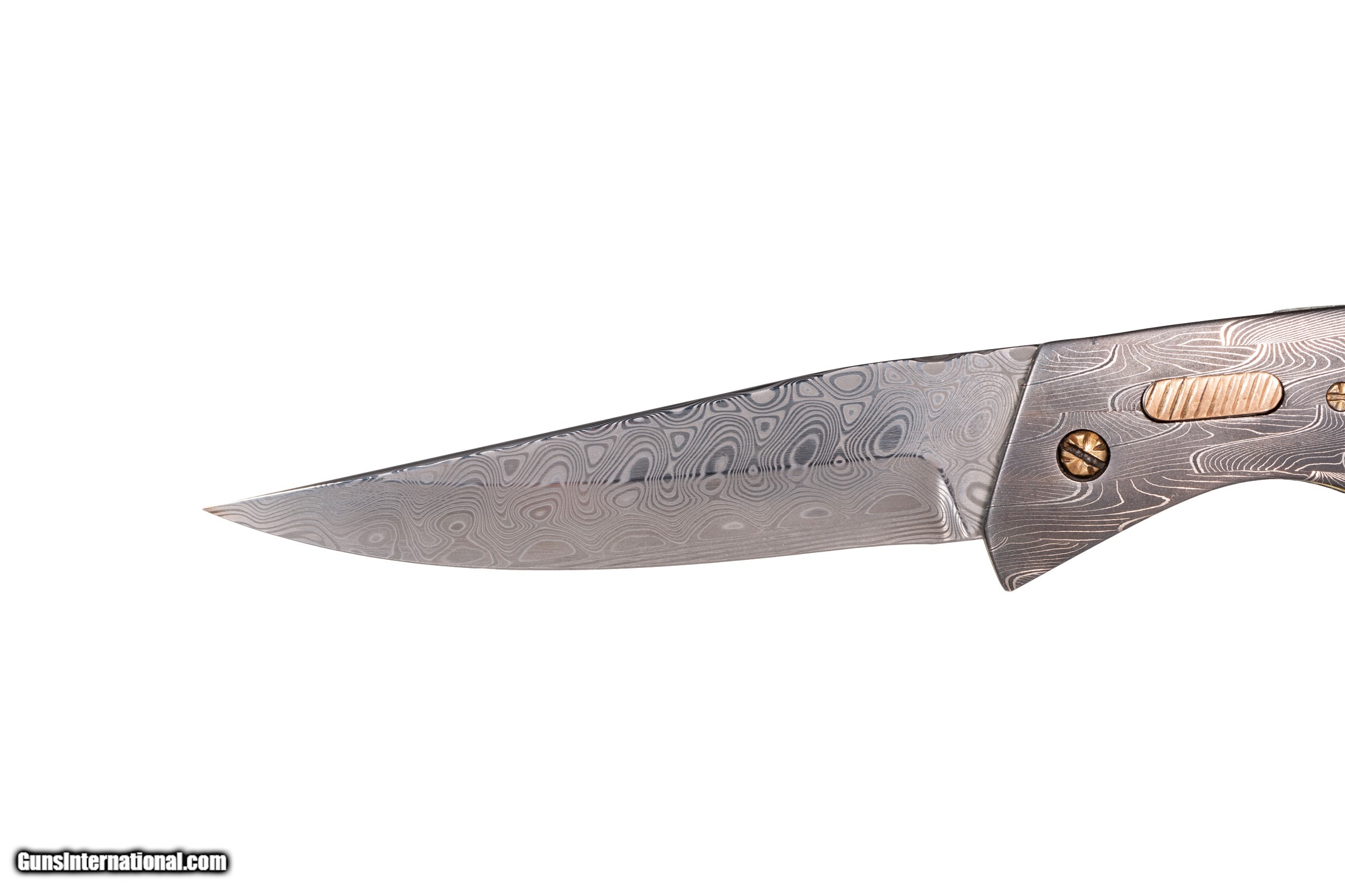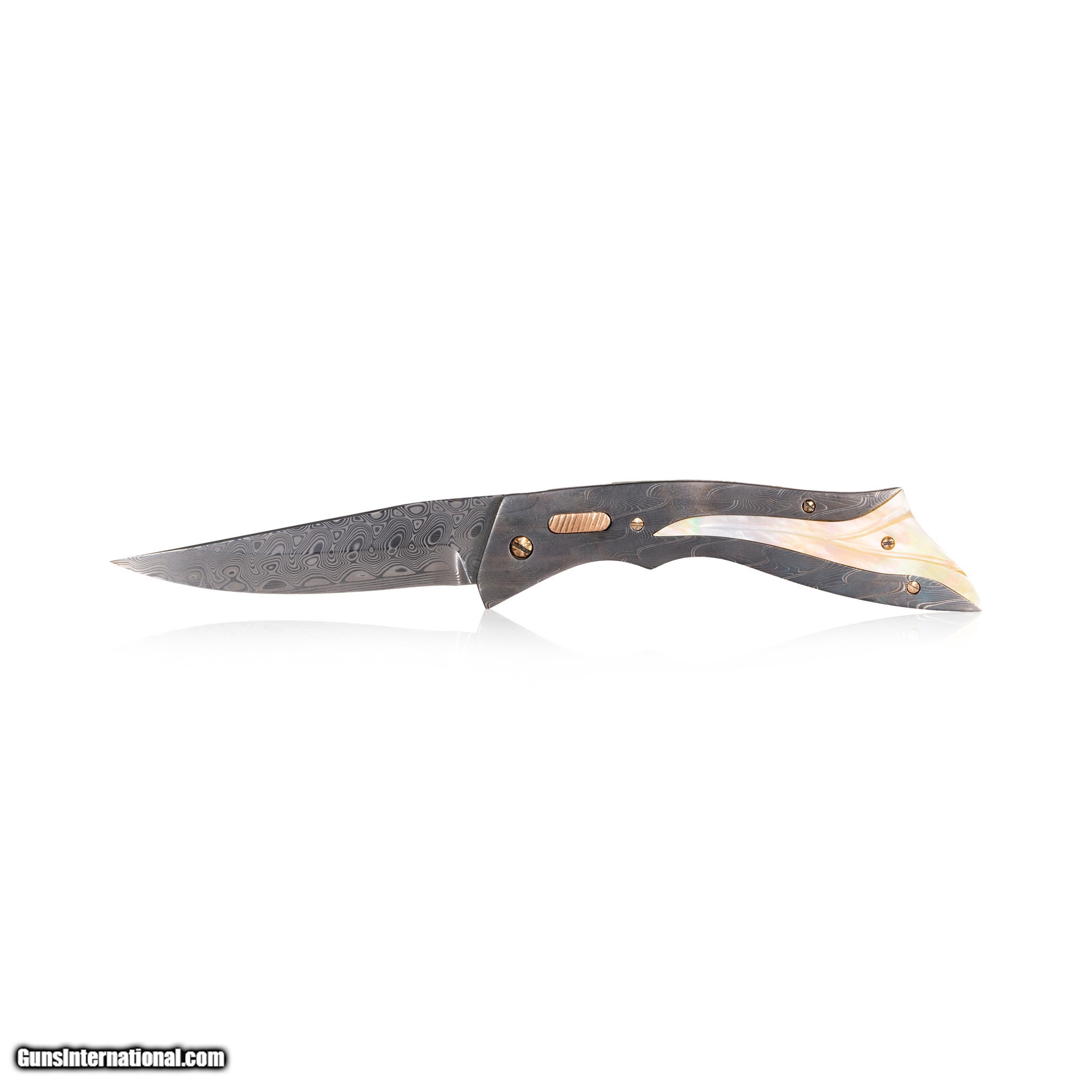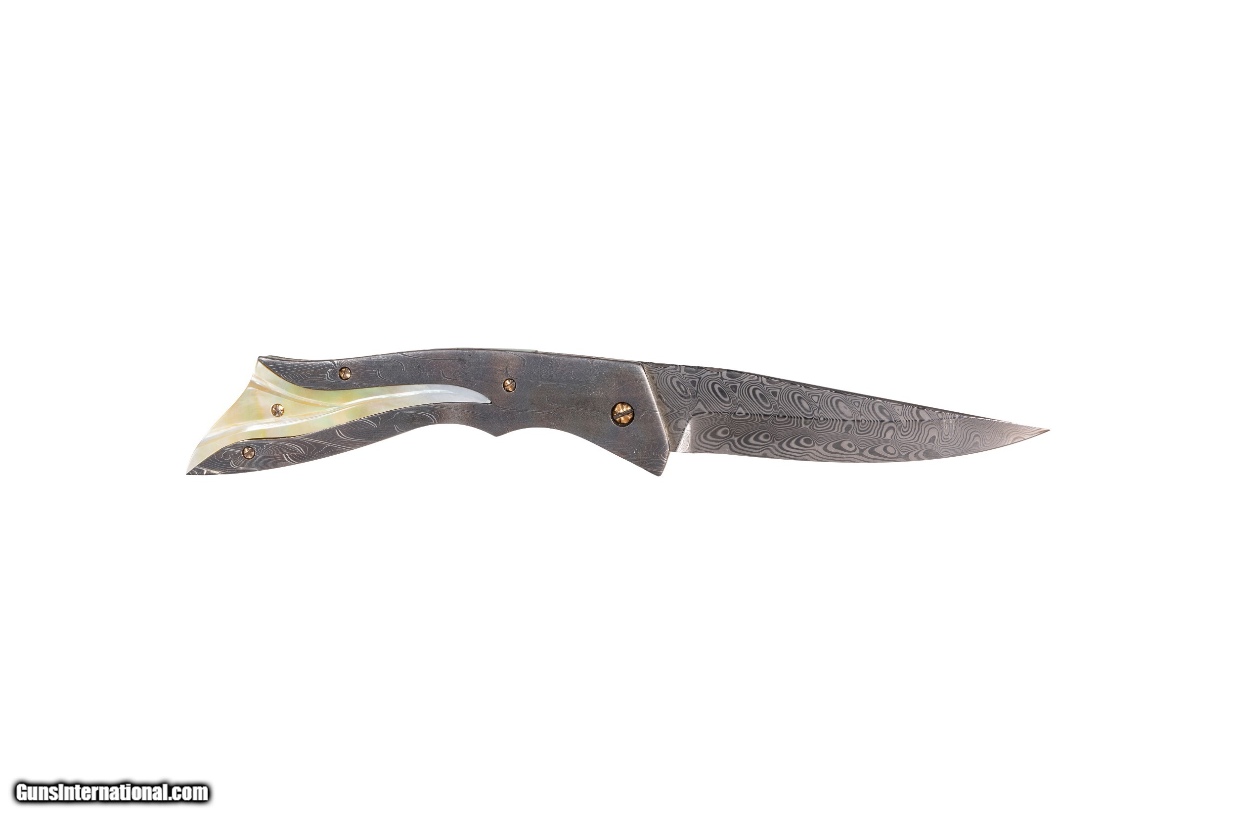 Description: Dale Reif Switchblade Stunning switchblade with damascus steel and mother of pearl. Custom-made by master craftsman Dale Reif. 4 7/8" closed, 8 1/2" open. SOLD |