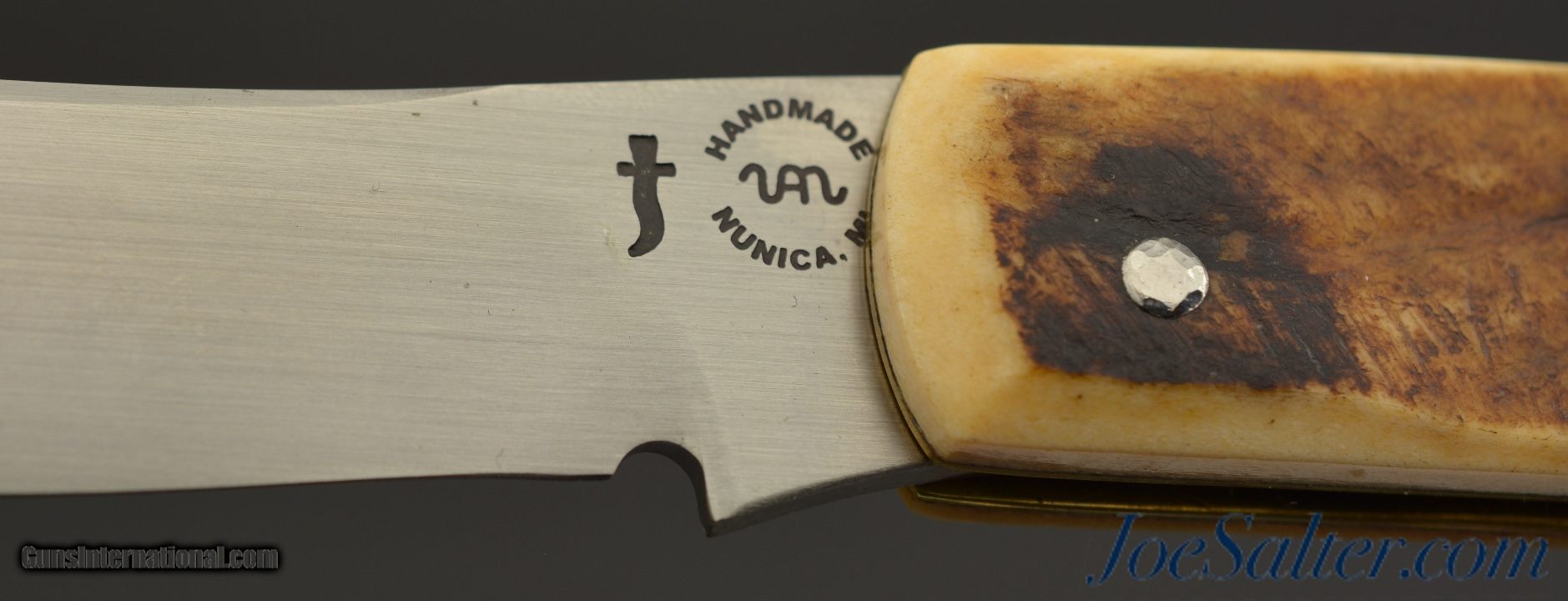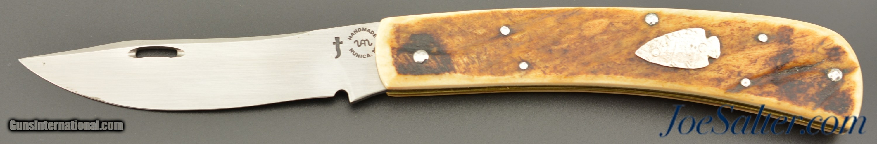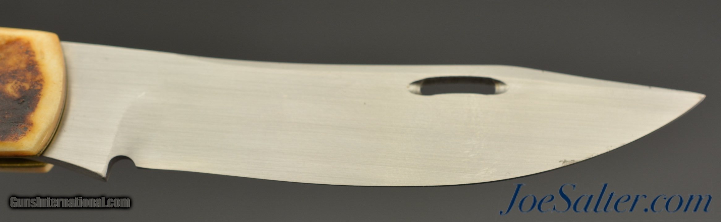 Description: This is a beautiful Hand Made Jerry Van Eizenga Numica MI.Folding Knife with stag handles, brass liners and silver arrow. This custom measures 5 3/4' with a 4' stainless steel blade equipped with a custom nail mark, 6 rivets, silver arrowhead and lanyard loop. The blade has the factory edge and has his makers mark on the top of the blade. The knife opens and closes with a firm click and snap. The knife shows as new with the exception of a tiny bit of staining at the forward edge. Outstanding quality and appeal. SOLD |