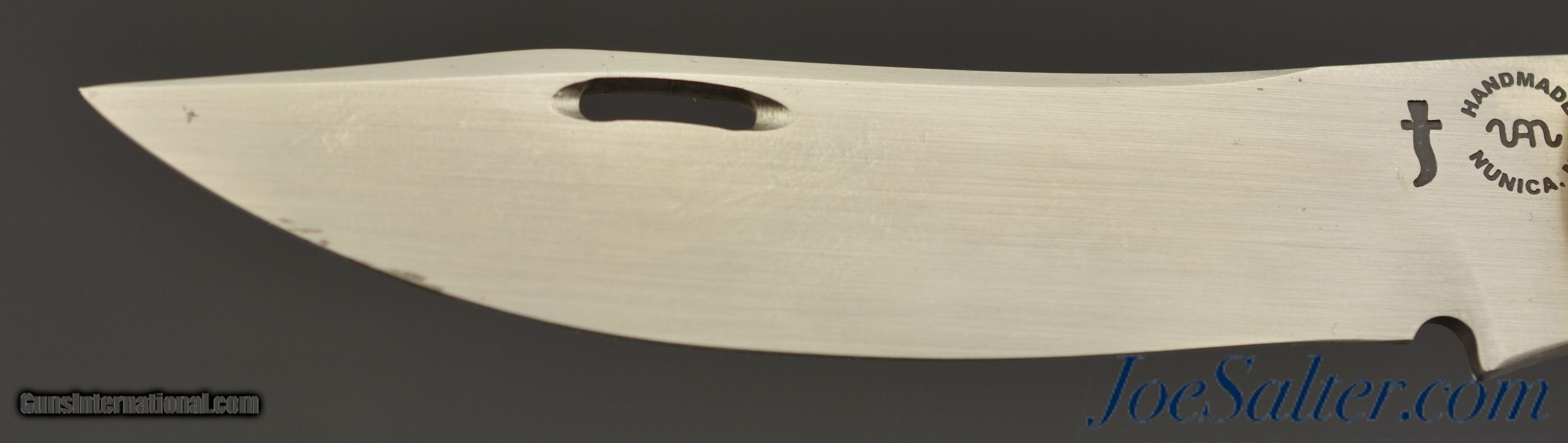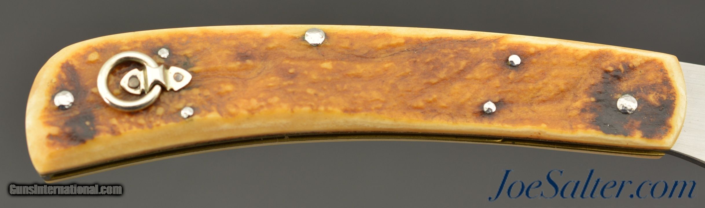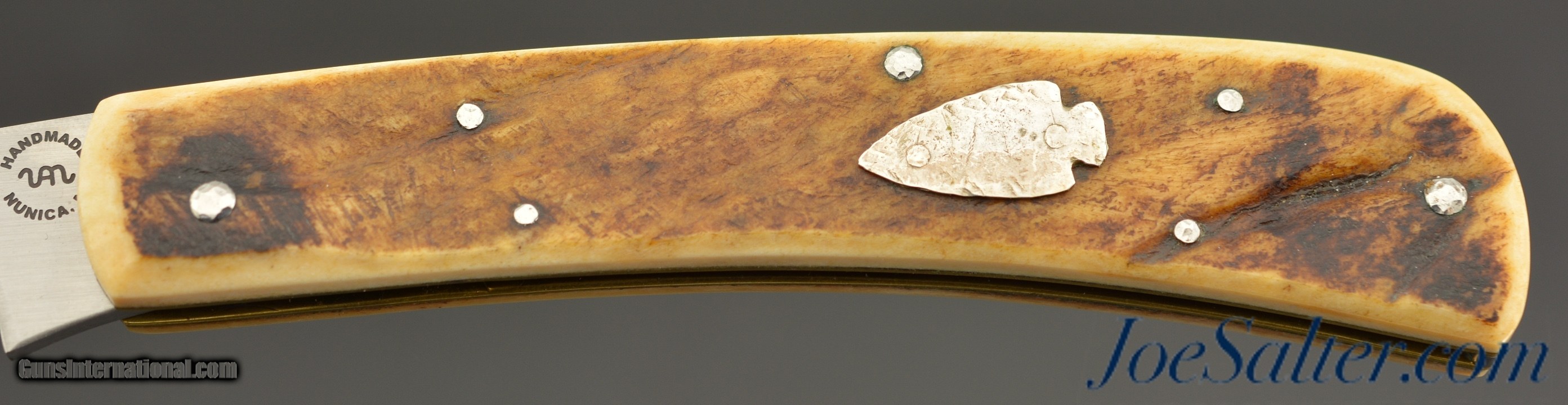 Description: This is a beautiful Hand Made Jerry Van Eizenga Numica MI.Folding Knife with stag handles, brass liners and silver arrow. This custom measures 5 3/4' with a 4' stainless steel blade equipped with a custom nail mark, 6 rivets, silver arrowhead and lanyard loop. The blade has the factory edge and has his makers mark on the top of the blade. The knife opens and closes with a firm click and snap. The knife shows as new with the exception of a tiny bit of staining at the forward edge. Outstanding quality and appeal. SOLD |