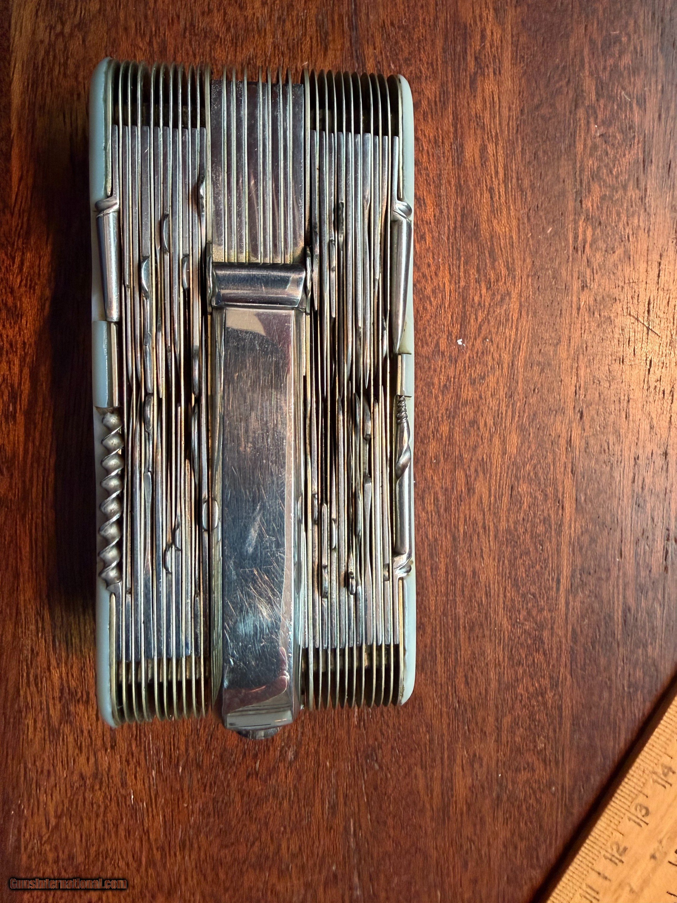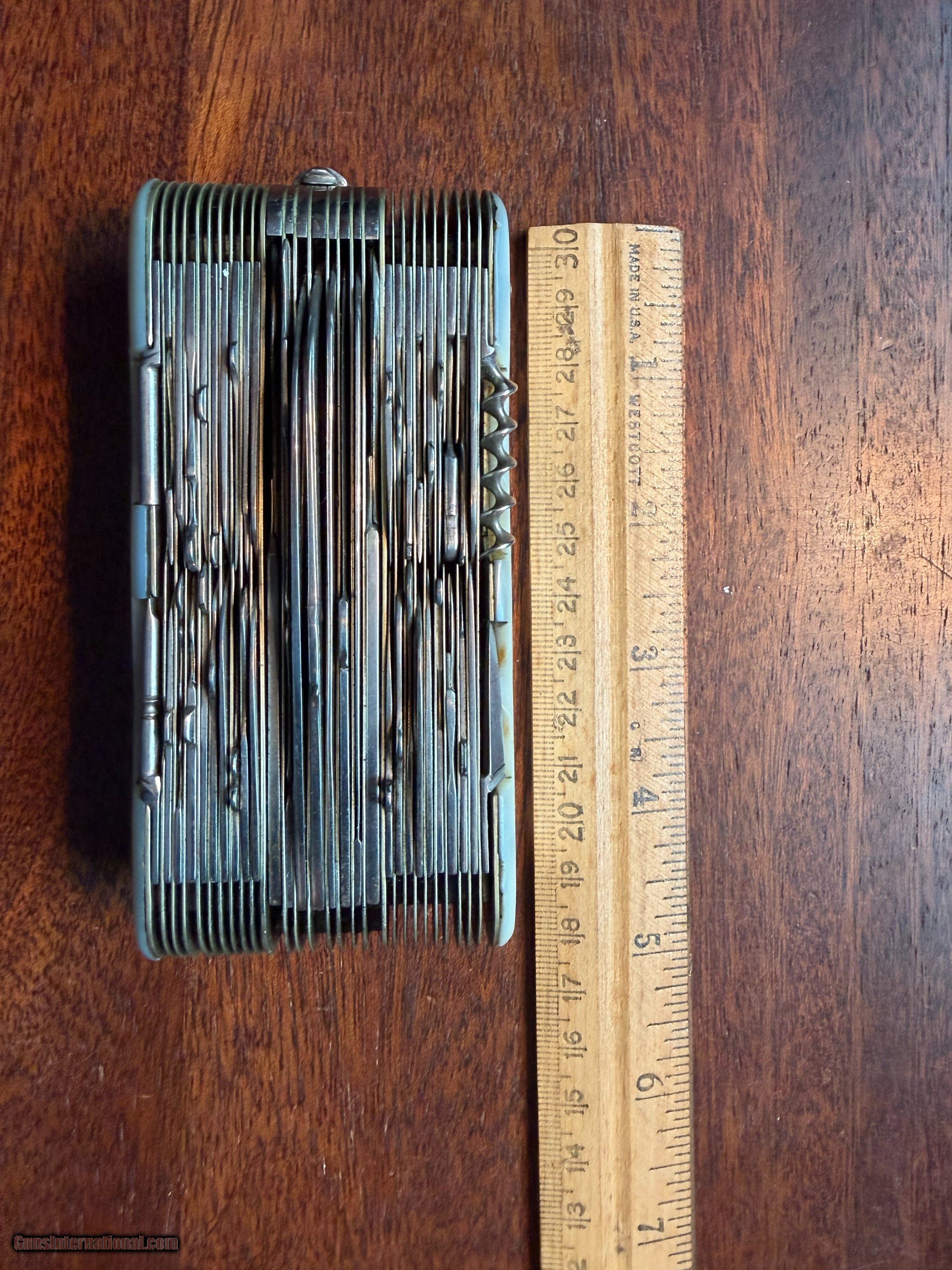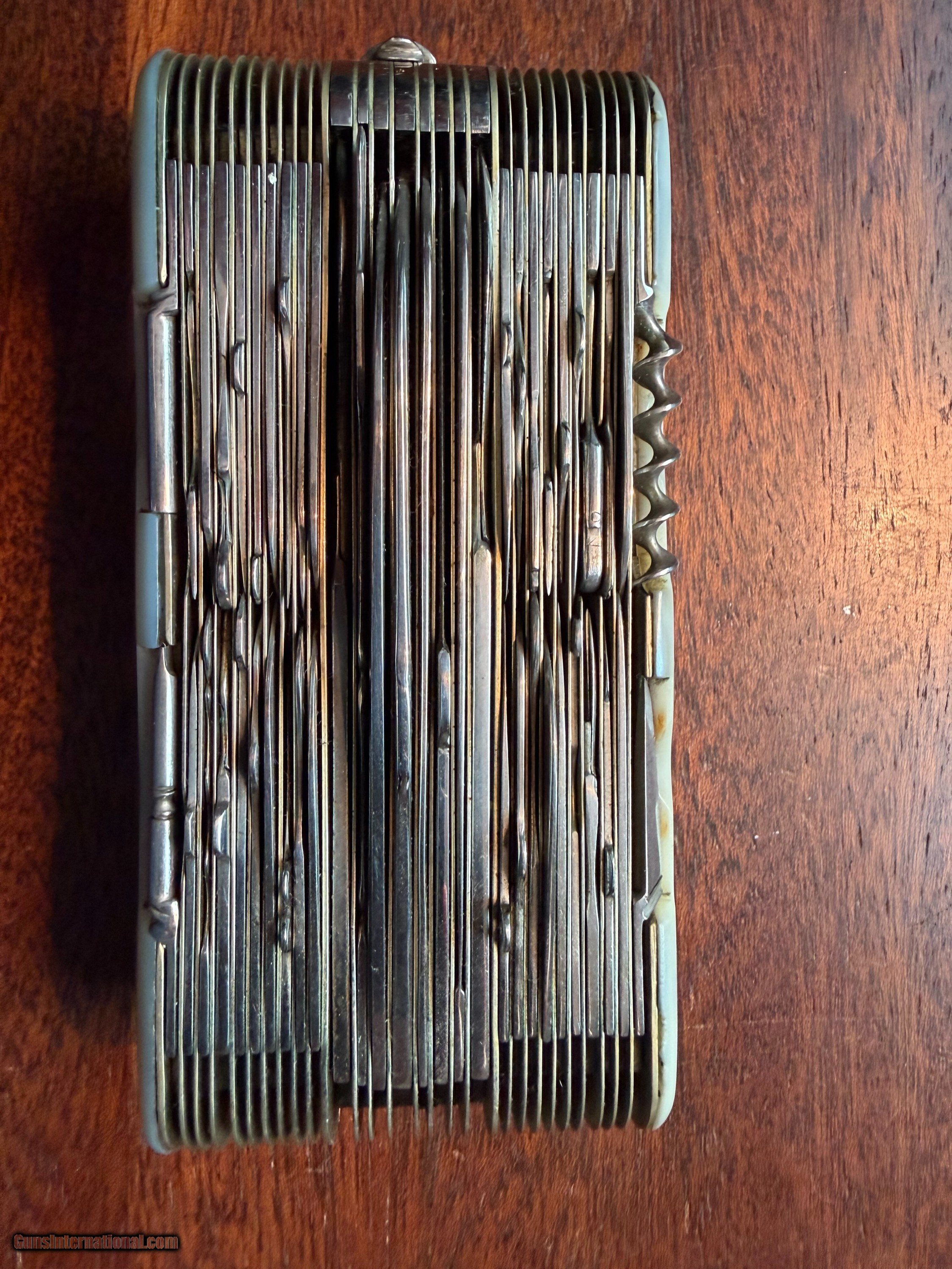 Description: PIUS LANG 100-BLADE FOLDING KNIFE, MOTHER OF PEARL GRIPS, EVERY TYPE OF BLADE IMAGINABLE, EXCELLENT CONDITION, NEVER USED OR CARRIED, CRACK IN ONE GRIP/SOLID, MISSING ONE SMALL TOOL. $9000 OBO, CHUCK 954 850 8396 Price: $9,000.00 Contact Seller |