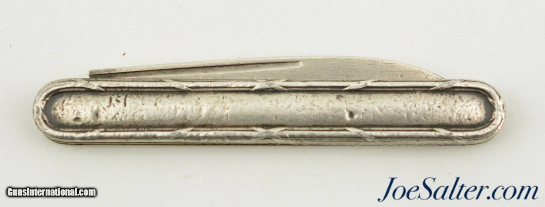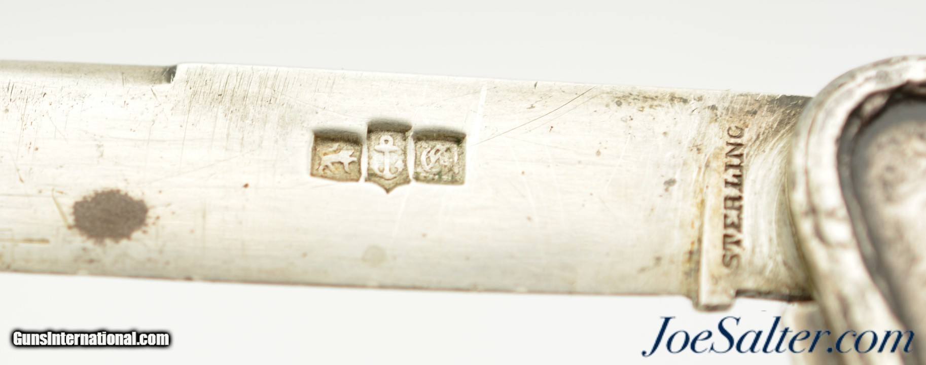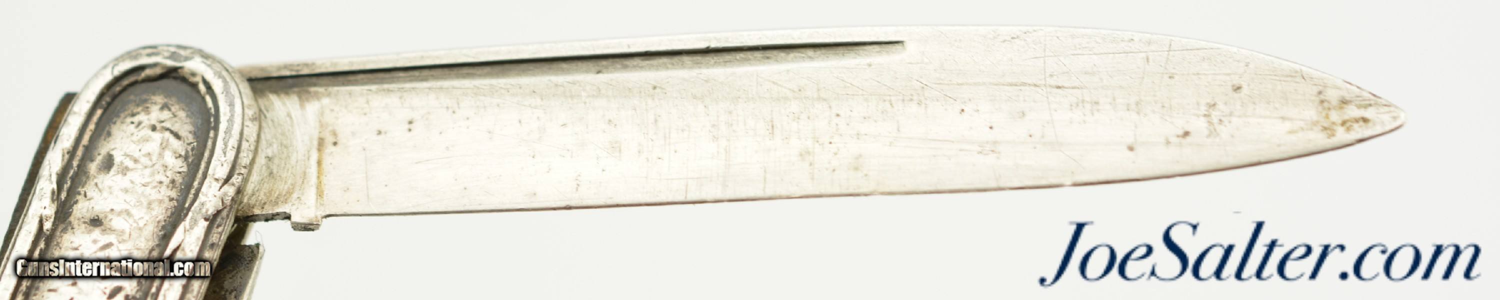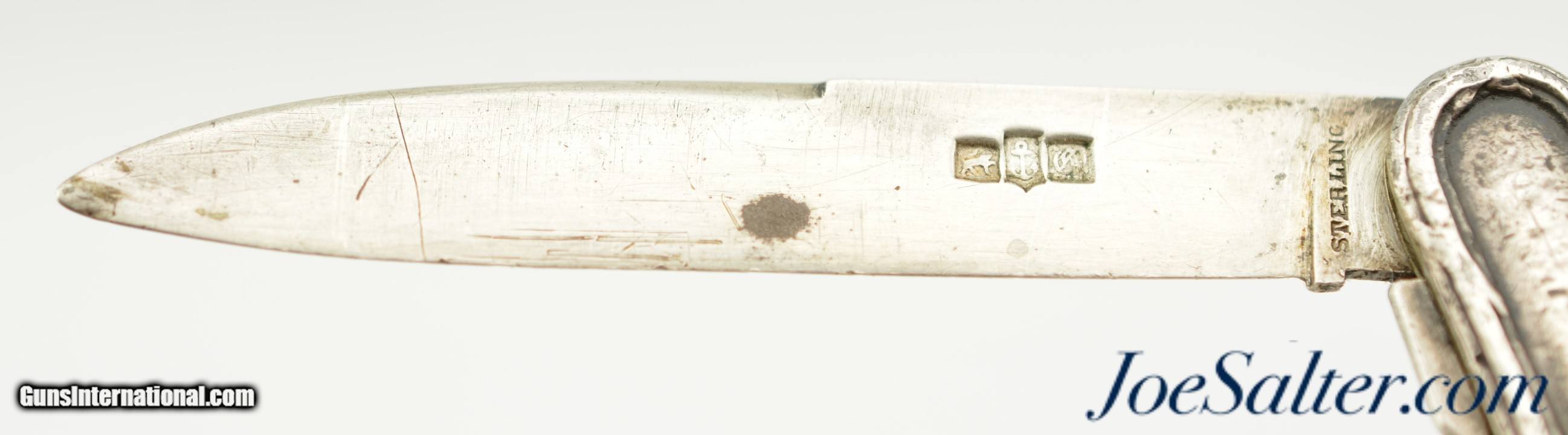 Description: This is a Sterling Silver Folding Fruit Knife with Nut Pick manufactured in Birmingham England. I have not identified the makers mark. The knife is in very good condition with plain scales bordered by a vine motif a long pull main blade marked with STERLING and proofs with a nut pick as the second blade. ; Price: $79.00 Contact Seller |