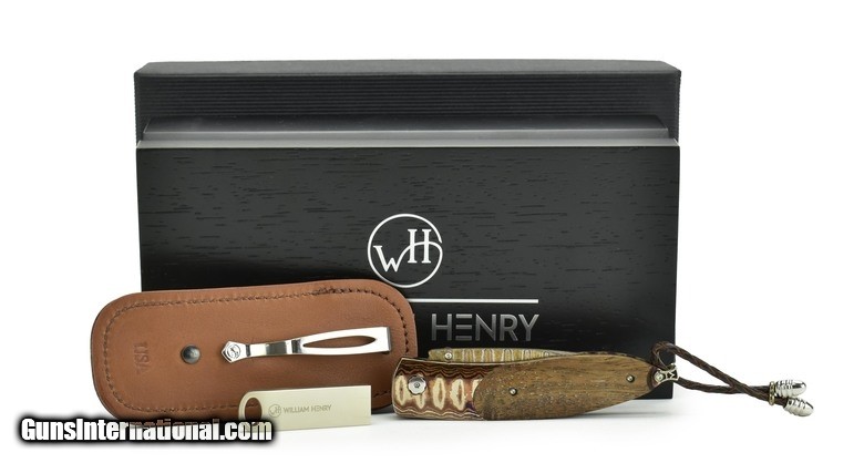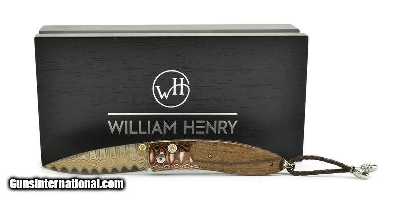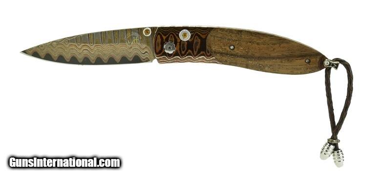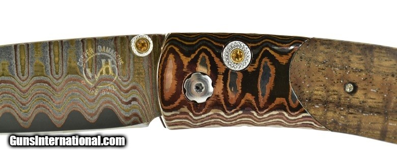 Description: William & Henry Custom Monarch Oahu Flipper. Features “wave” Mokume Gane handle, inlaid with curly KOA wood. Blade is “copper wave” Damascus steel with an extra strong core in VG-5. One-hand button lock and thumb stud are set with Spessartite. SOLD |