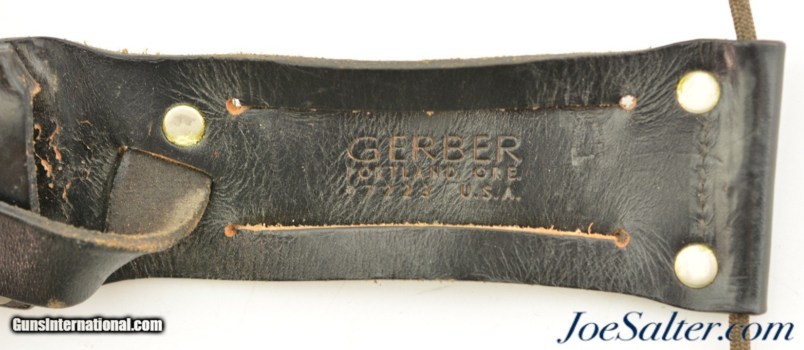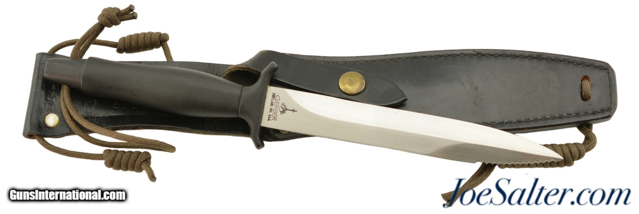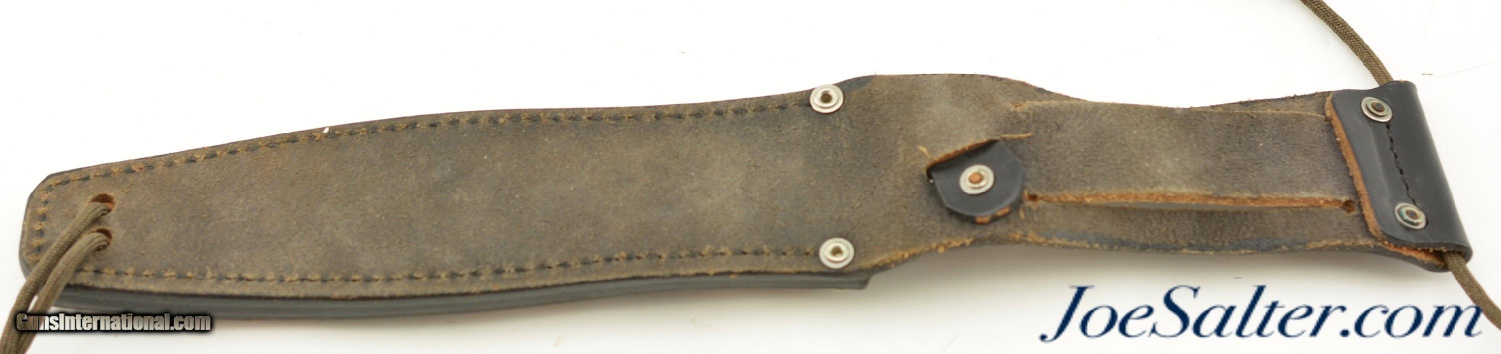 Description: This is a vintage Gerber Command II Combat Knife #A3541S. These knives were built between 1979-1982. This Knife features straight blade, course teeth on the tip, most likely 440C SS and a black leather sheath with a square bottom. The approximate 6 1/2" single-edged blade is in very good condition with what appears to be a factory edge and nice serrations. The very tip has the slightest blunt. The aluminum handle is in excellence condition with all of it's finish. The square bottomed black leather sheath is in very good, used condition, tight stitching, clearly marked with tip strikes at the throat from inserting the knife. They produced approx. 22,700 Command II. The dating of the Command II ran approximately parallel with the Mark II. Please see photo's for fine details.; SOLD |