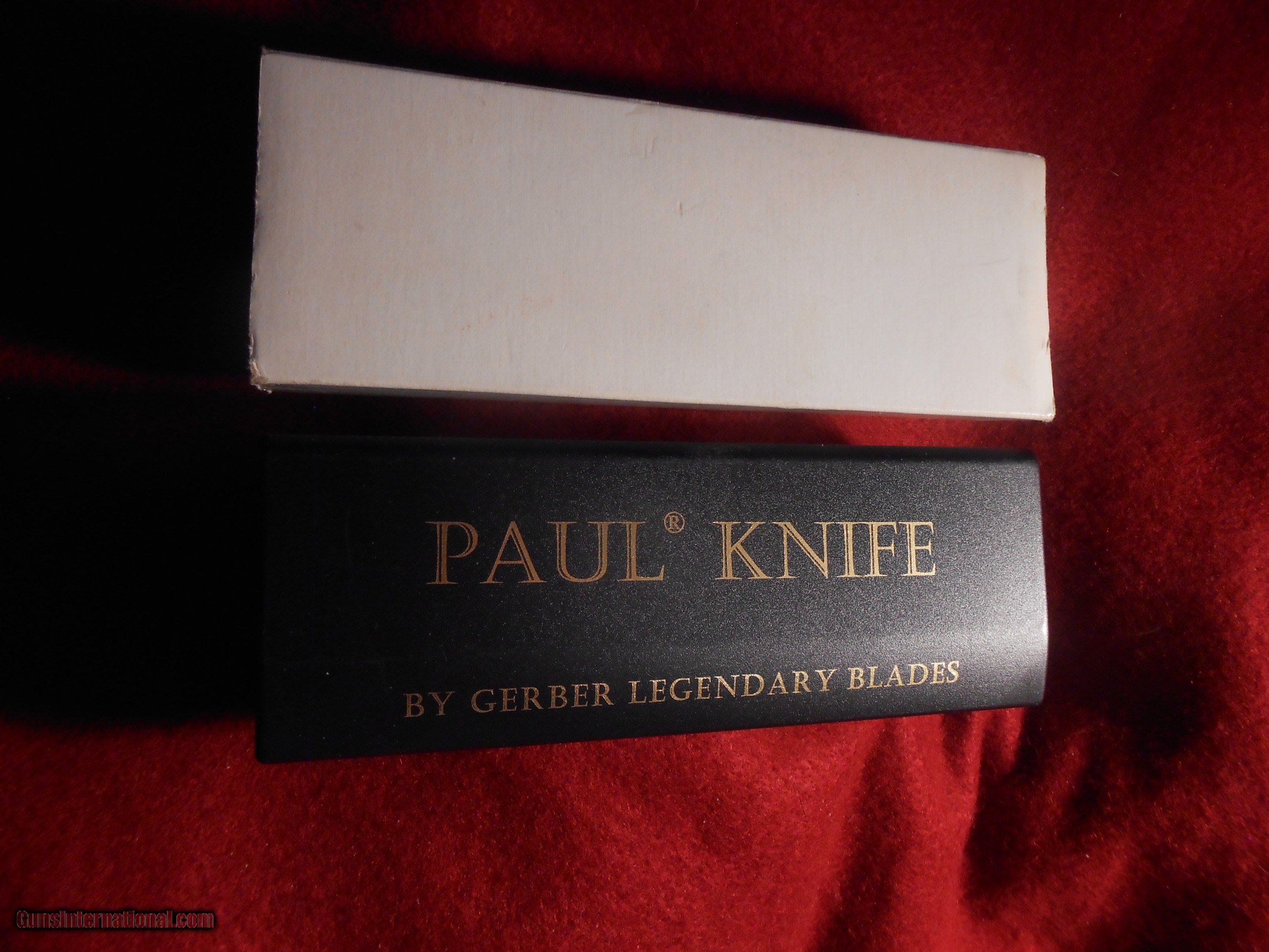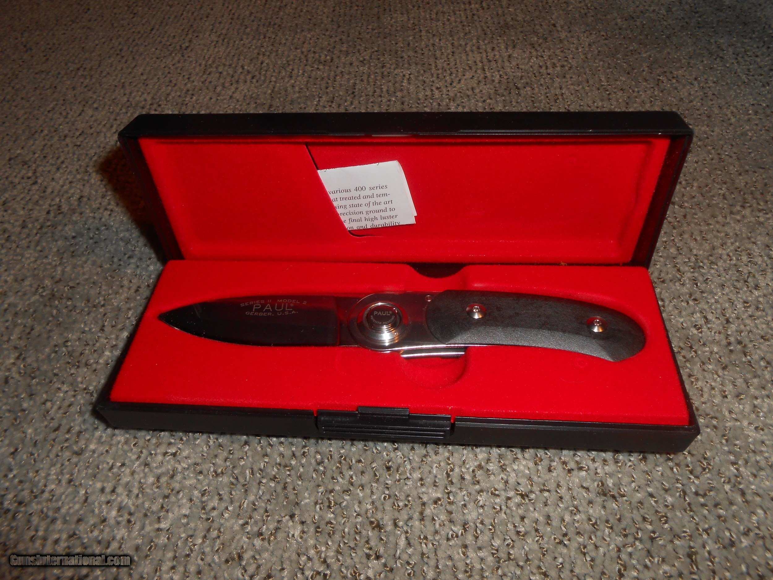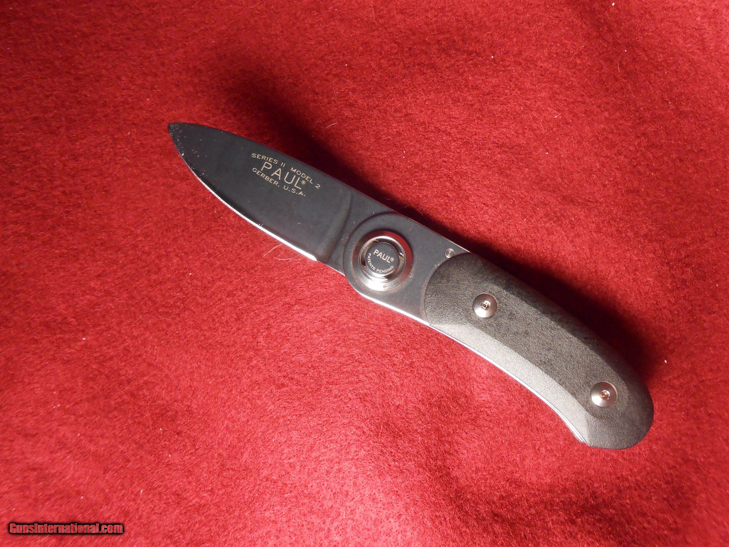 Description: Offered from my personal knife collection is a new, pristine, unused, unsharpened, absolutely mint, example of a unique Gerber Paul, Series II, Model 2 folding knife. It is from the first production run and is dated 1996. This knife uses the Paul W. Poehlmann, push button, axial locking mechanism and is of very high quality. It is still in the original case and cardboard sleeve with all original paper documents. This knife has never been used or sharpened. It would be a great addition to a collection or a very useable, compact field knife. SOLD |