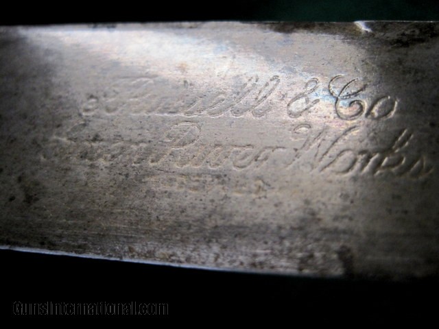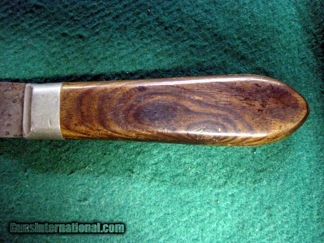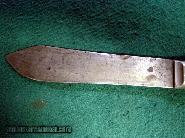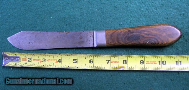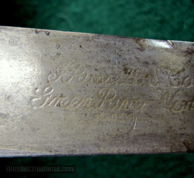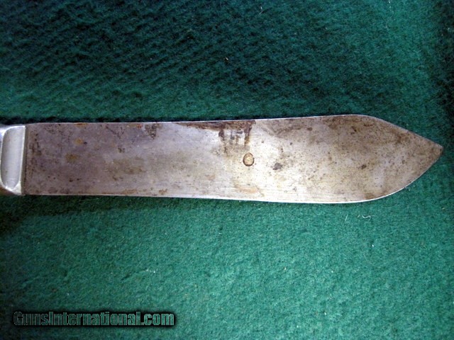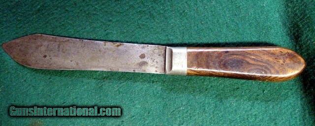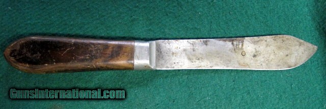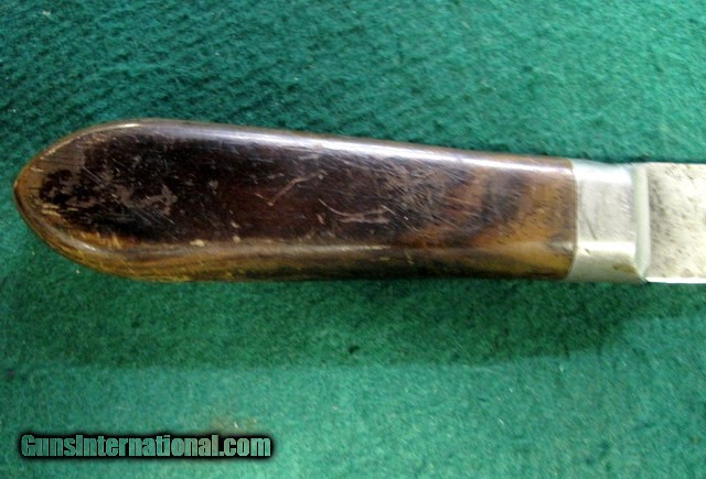 Description: Antique FIXED BLADE, PEWTER BOLSTERED (no visible pins, rivets or tang edges), CARBON STEEL KNIFE by "J. RUSSELL & CO., GREEN RIVER WORKS" (etched at blade in script logo) of Green River, Mass., circa the late 19th -to- early 20th century (best guess), as seen in the pictures/as described in the title. Being offered for sale AS-FOUND, uncleaned. May require a thorough detailing to bring to its full potential. Good/VG vintage condition with minor to moderate overall wear throughout. Structurally rigid & strong. Sold as parts with no returns .Ships only to lower 48 states. Shipping is $4. This will be added to the purchase price. No add on fees for credit cards . SOLD |