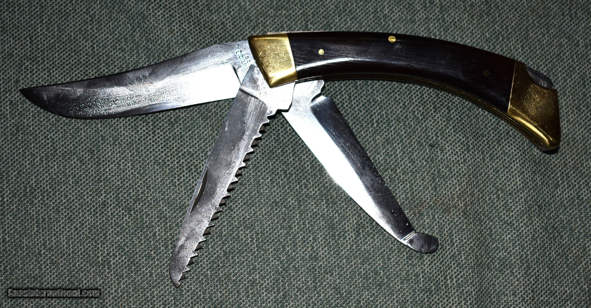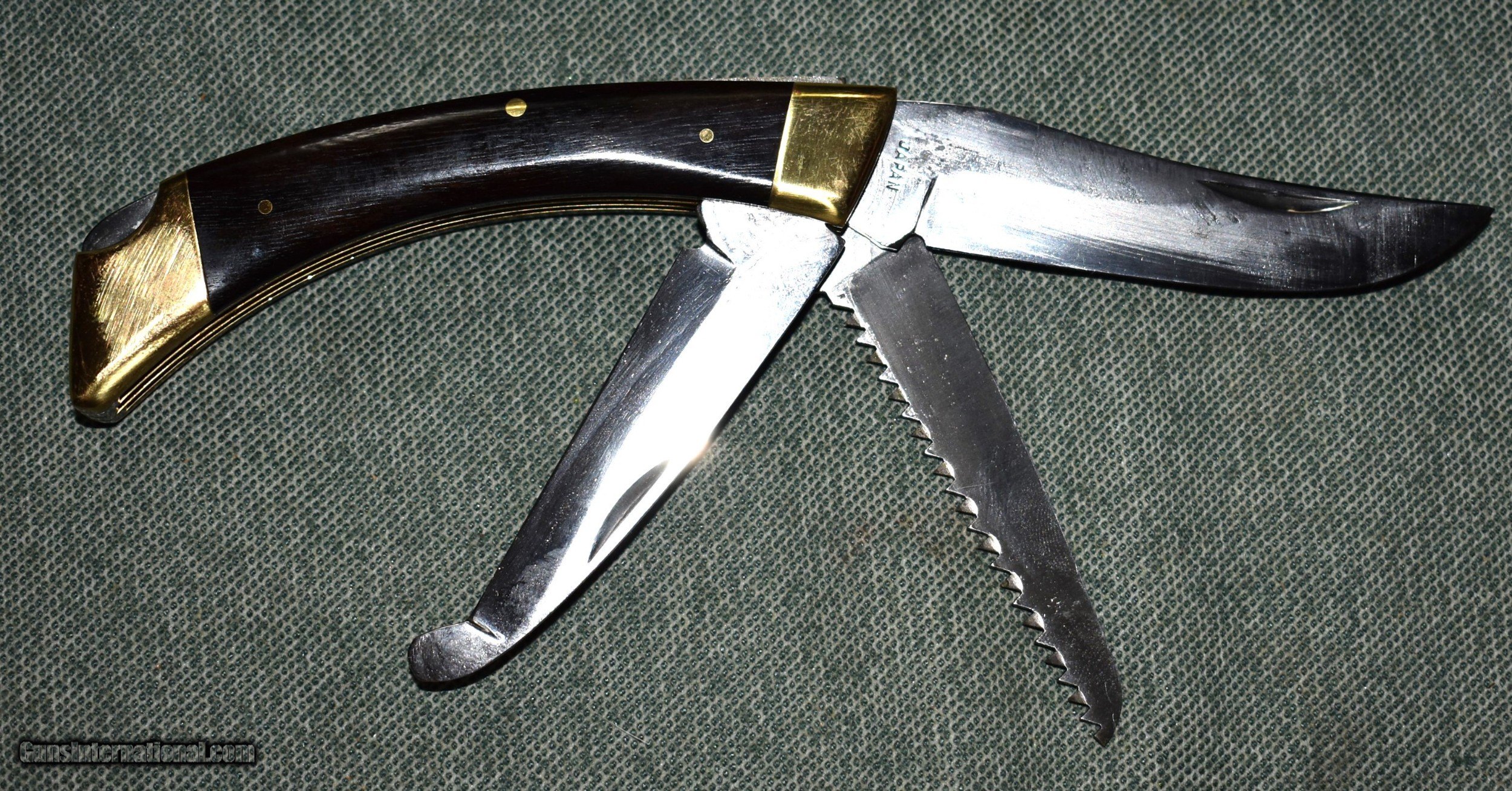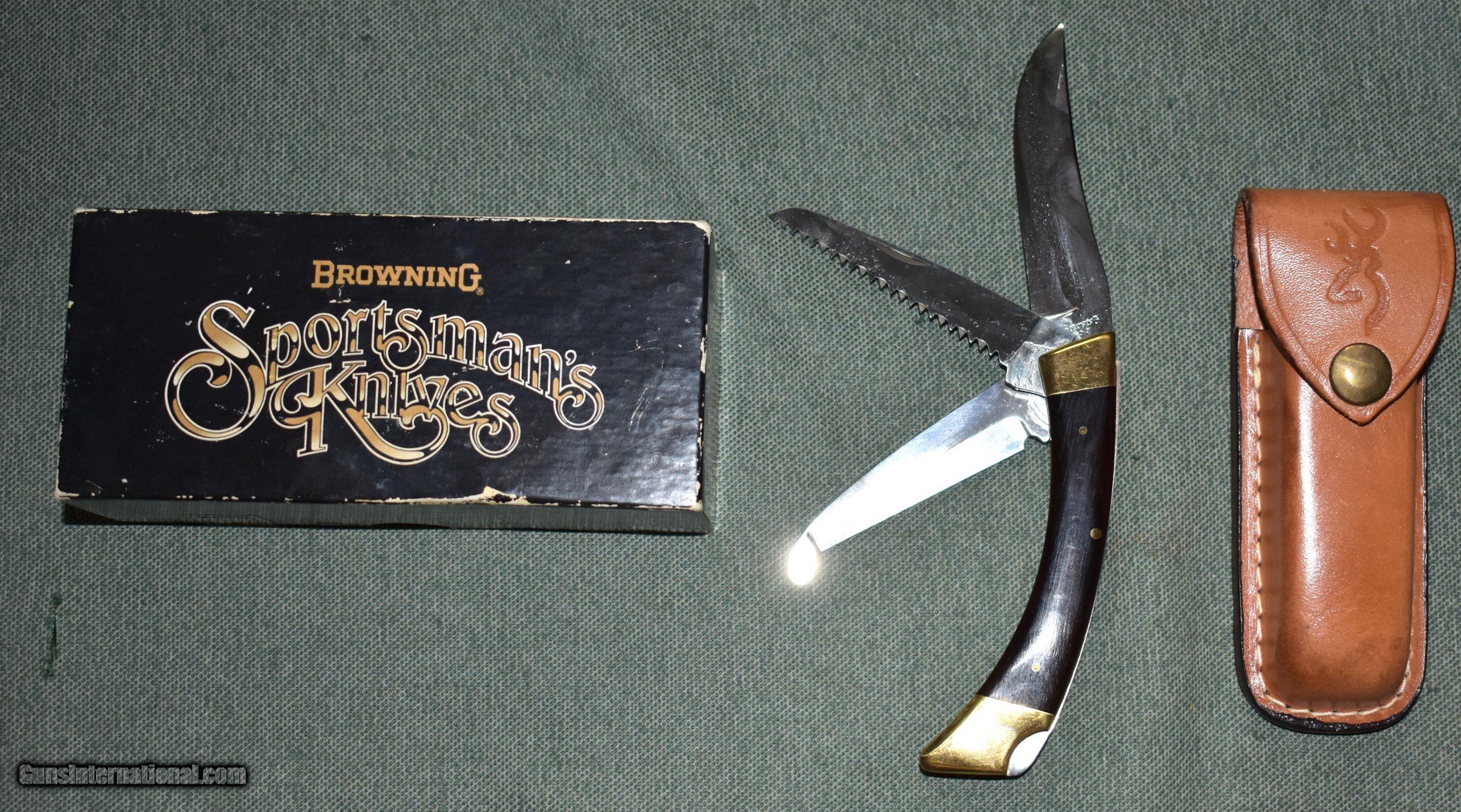 Description: Browning Sportsman 3 blade folder. This knife has a 31/2" skinning blade,a 31/2" saw, and a 31/2" gutting blade. This knife is new and unused in the original box with the original leather sheath. The grips are wood. I have used one of these for years and have found it to be the best all around hunting knife I have found. The steel is excellent and holds an edge. i have completely field dressed,quartered,and boned 3 deer at one time with mine without losing the sharpness. A great easy to carry and easy to use hunting knife. SOLD |