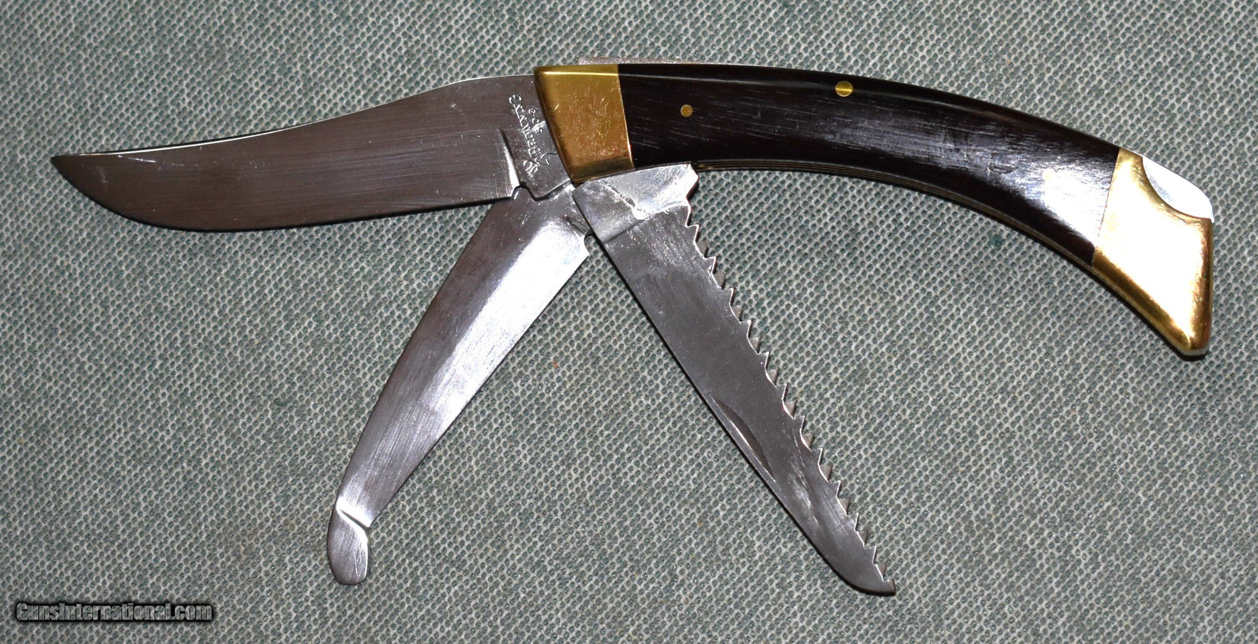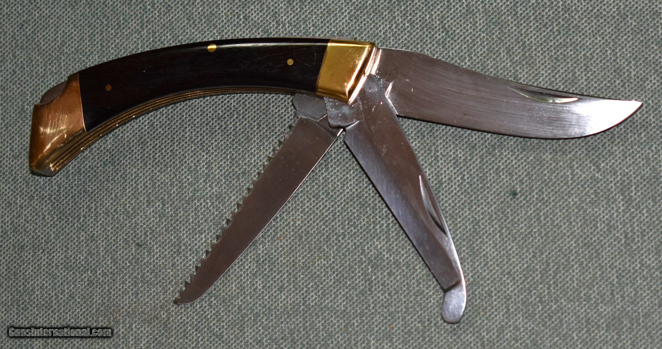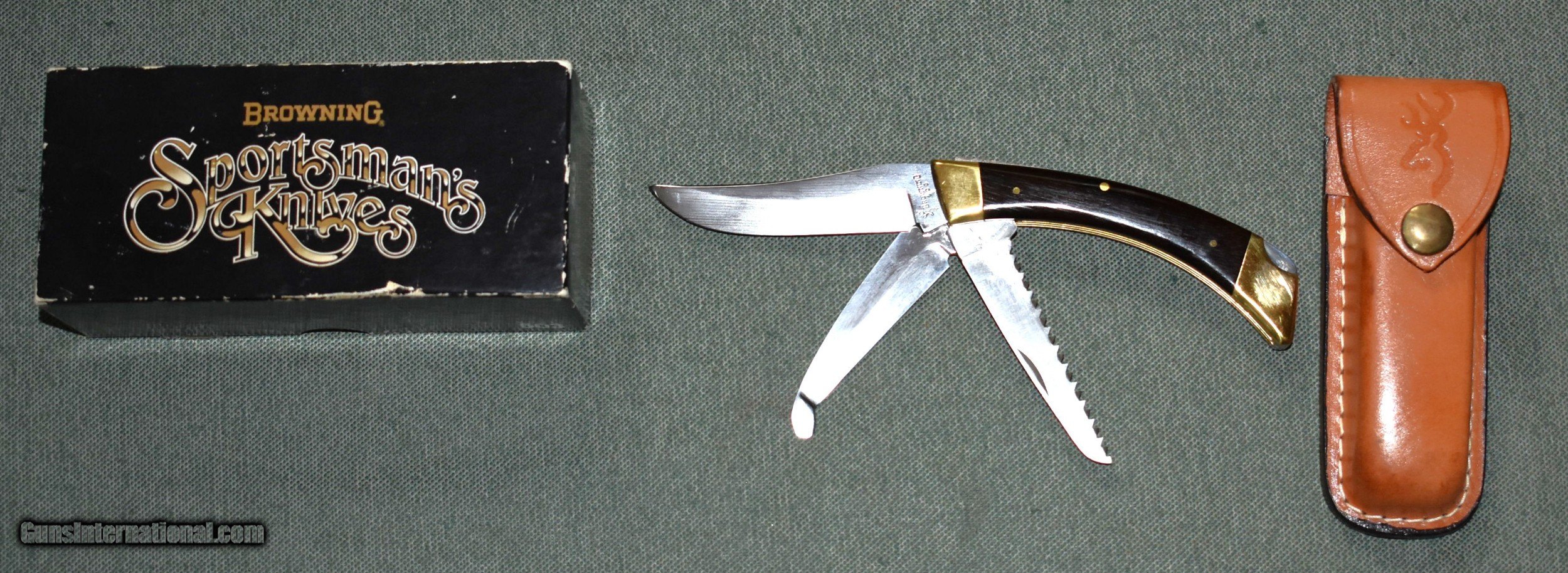Description: Browning Sportsman 3 blade folder new in the box with sheath. This knife has a lock back 31/2" skinning blade,a 31/2" gutting blade,and a 31/2" saw blade. I have used one of these for years. It is great for processing game from big game to birds. Great steel. Really holds an edge. SOLD |