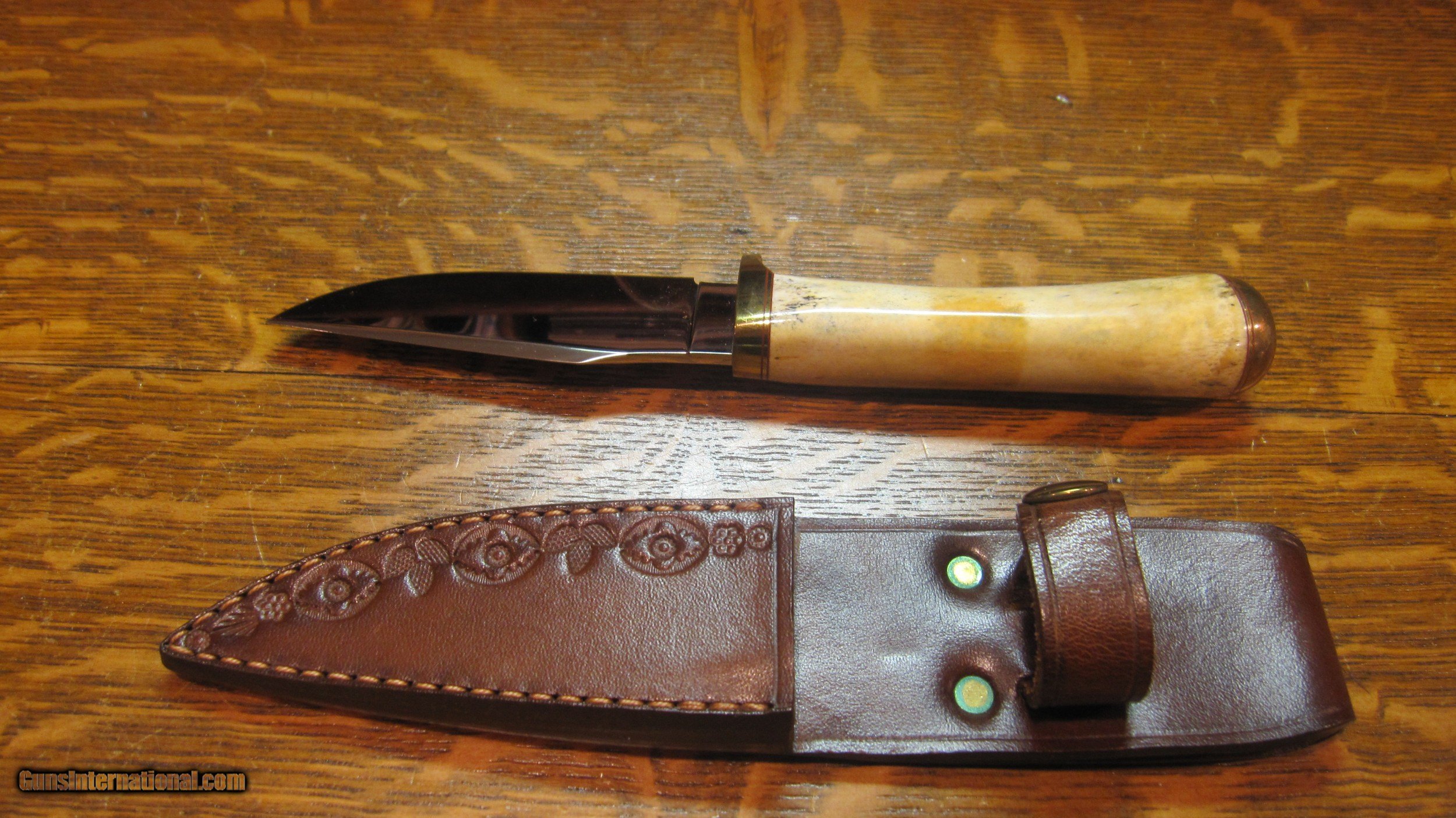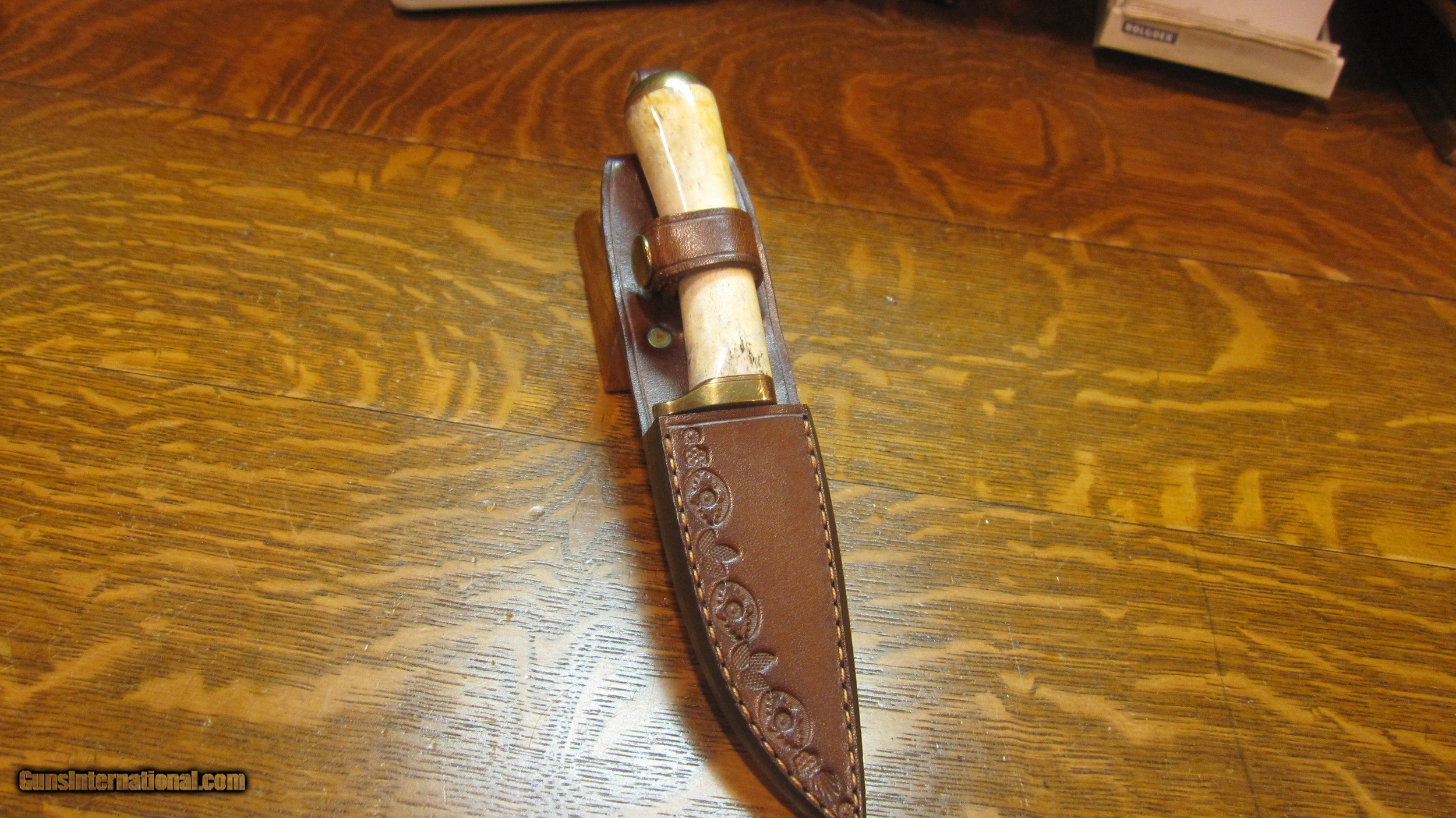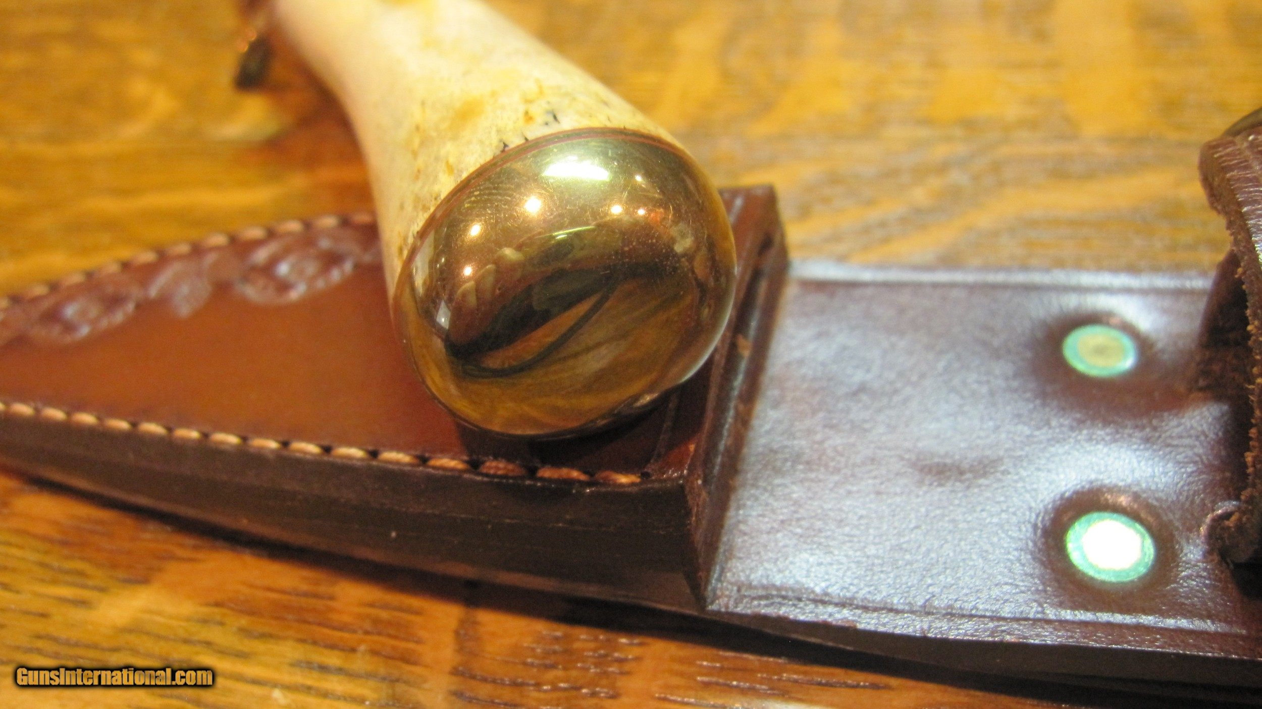 Description: This is a custom make hunting knife made by Canadian Master knife maker Roy Schiller in Saskatchewan. Made in 1999 for me personally. I'd buy a knife every year I went up to Carrot River hunting. He lives in Carrot River. This knife was never used. Brand new. 4" semi- bowie blade . Oosik bone from a walrus used for handle. His Mom made all of his sheaths for him. She her self an artist. Sheath is like a rock. Brass guard and pommel. Total length is 8 7/8". Please call 973-214-3407 with questions SOLD |