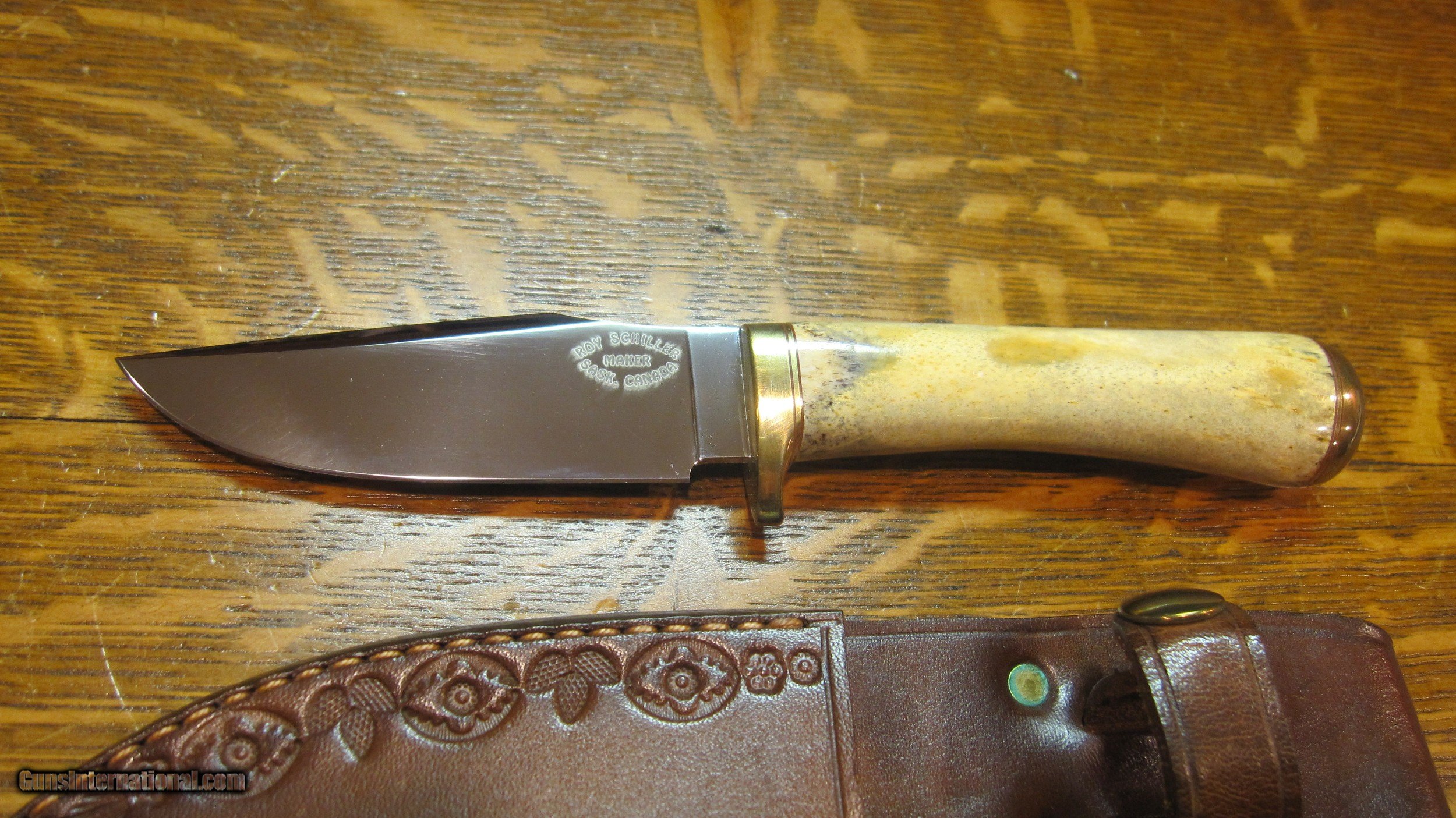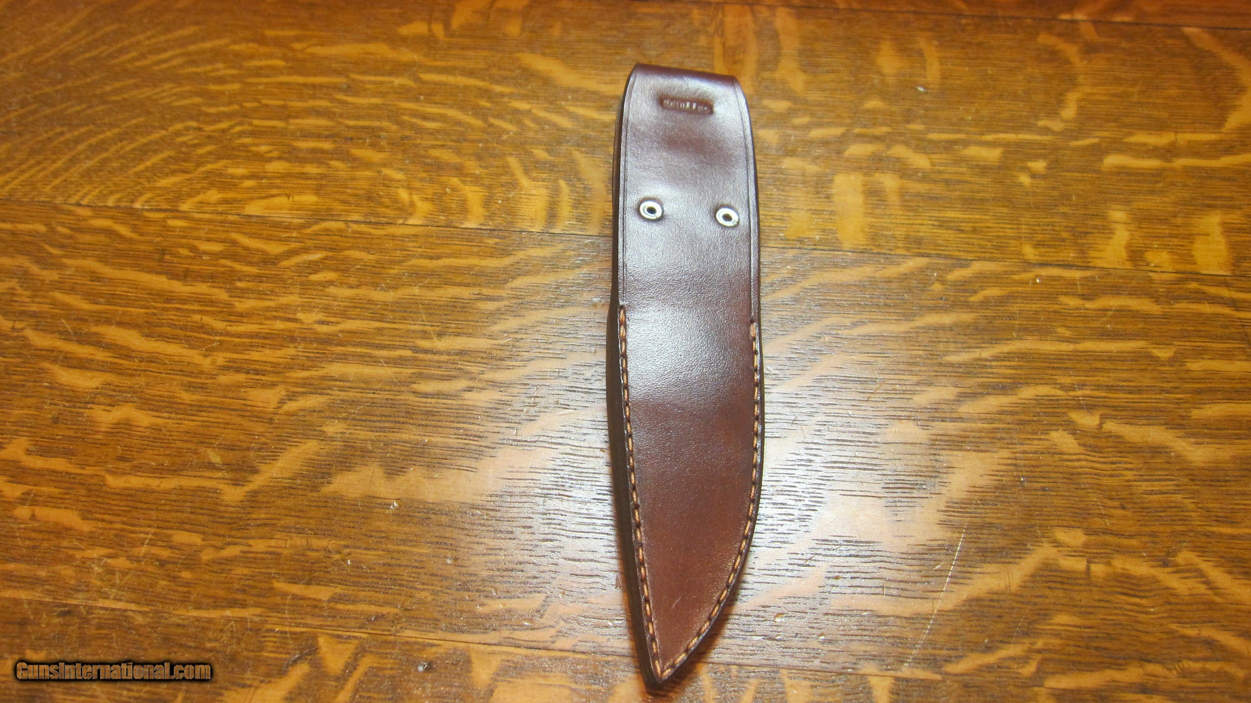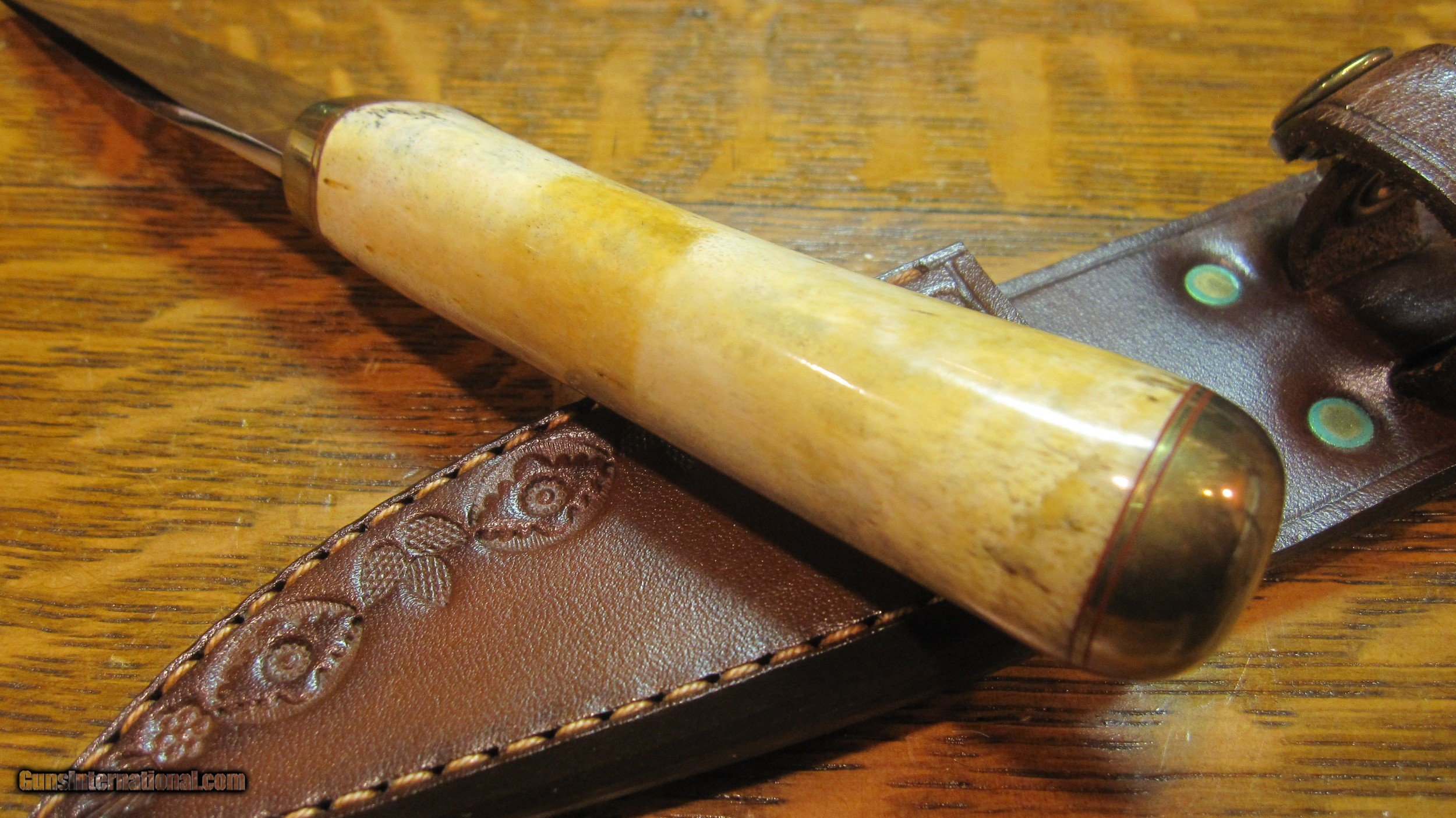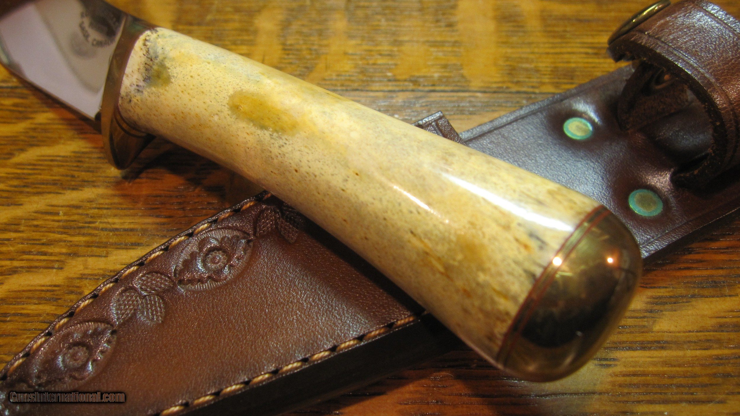 Description: This is a custom make hunting knife made by Canadian Master knife maker Roy Schiller in Saskatchewan. Made in 1999 for me personally. I'd buy a knife every year I went up to Carrot River hunting. He lives in Carrot River. This knife was never used. Brand new. 4" semi- bowie blade . Oosik bone from a walrus used for handle. His Mom made all of his sheaths for him. She her self an artist. Sheath is like a rock. Brass guard and pommel. Total length is 8 7/8". Please call 973-214-3407 with questions SOLD |