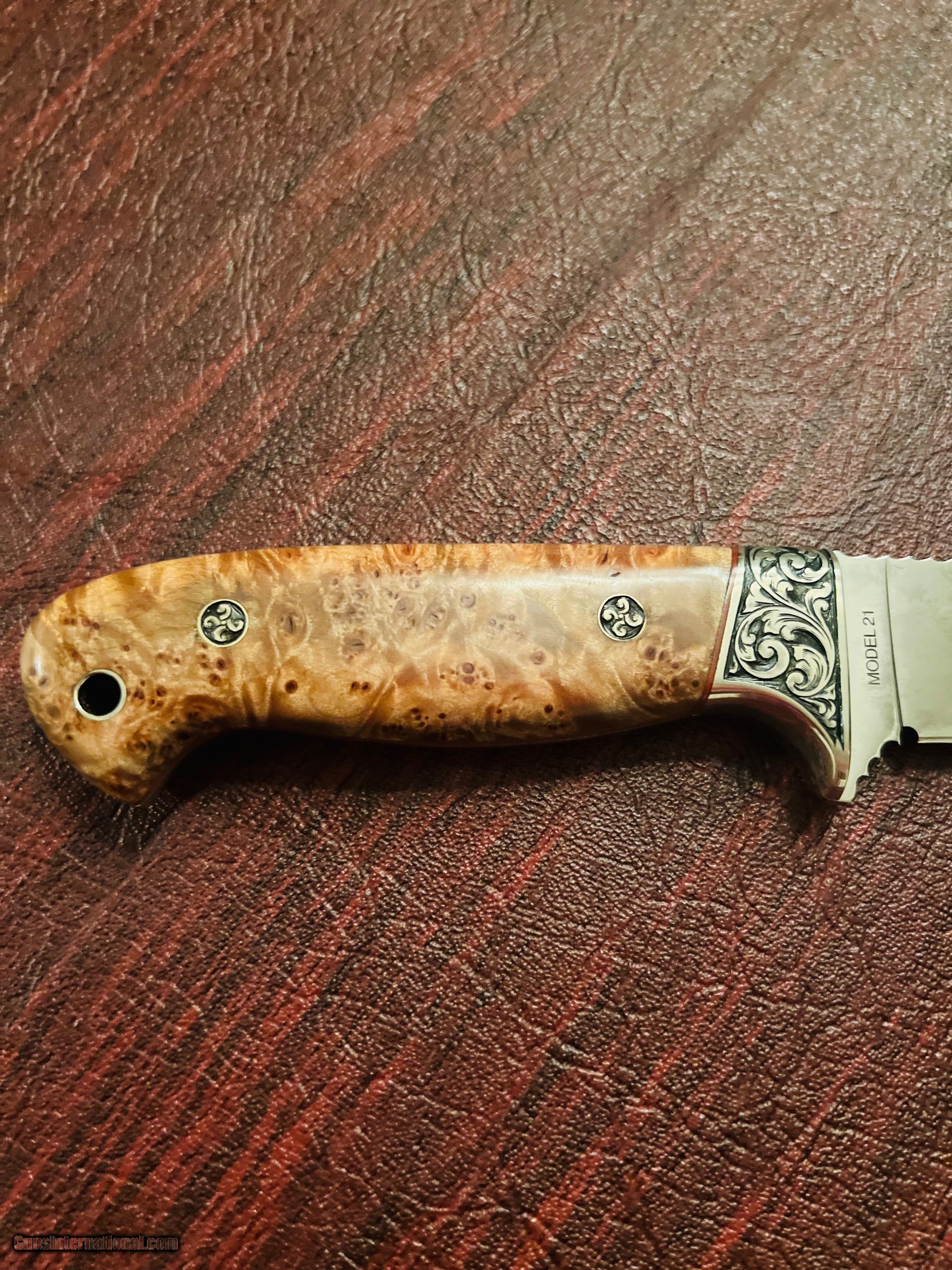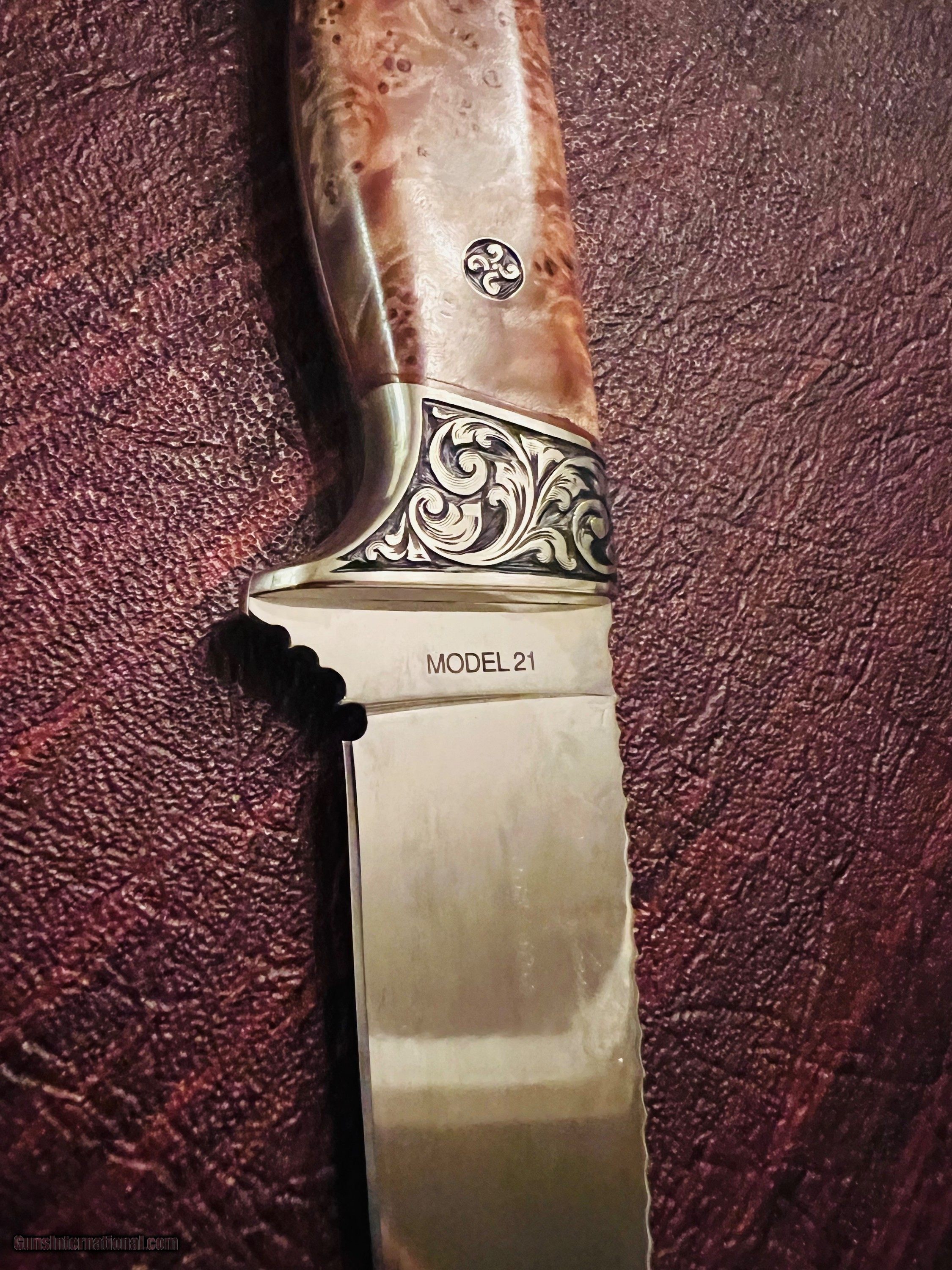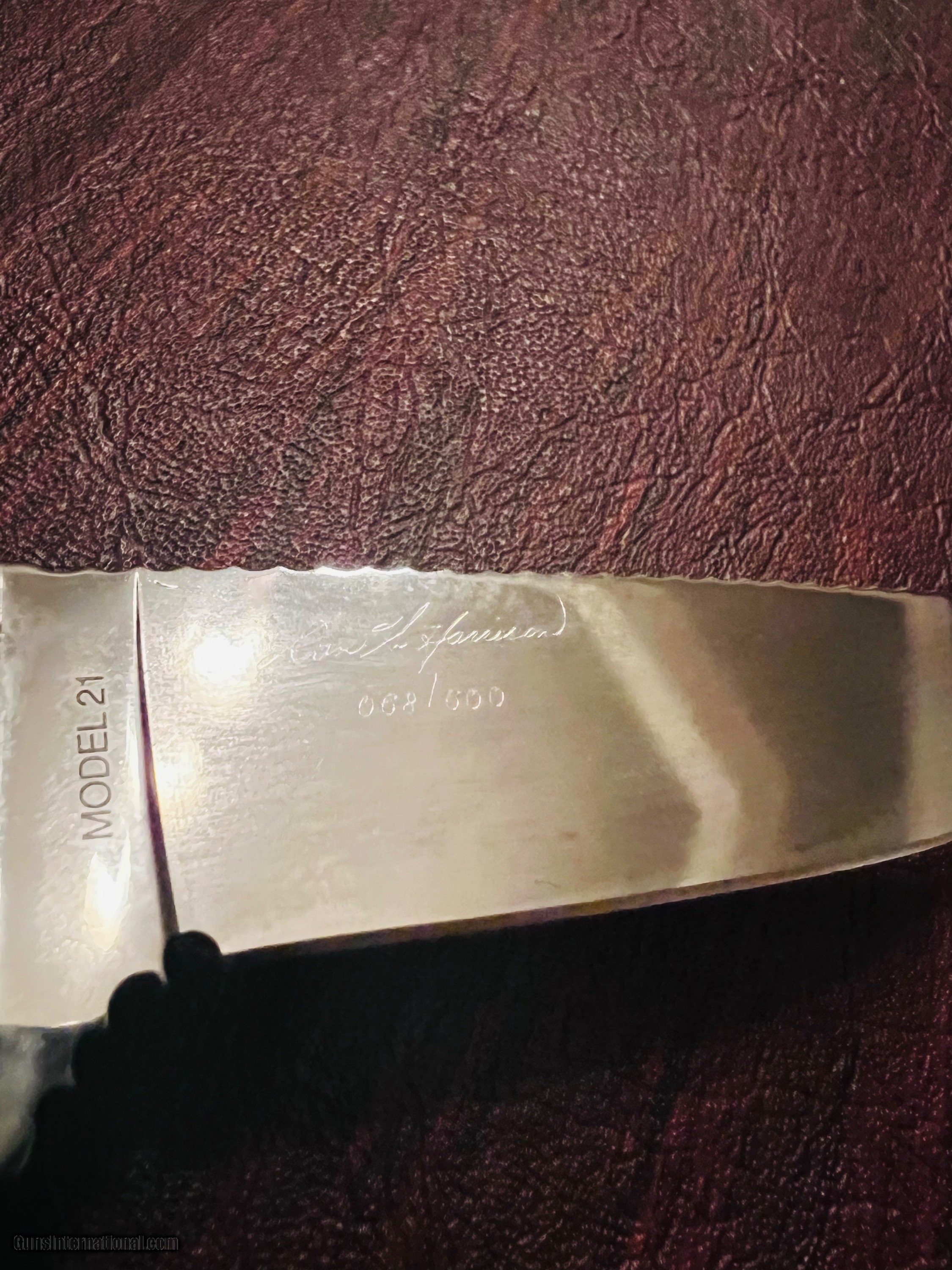Description: This is a beautiful piece! Out of 600 ever made, this is #68! Simply stated, the model 21 Handmad knife is pure artistry. Virtually every inch of this masterpiece is hand worked and painstakingly refined to give you one of the most beautiful knives ever produced. The file marks on the back of the blade provide a rugged contrast to the sleek lines found throughout the knife.The full-lenght tang is beautifully layered between an exotic maple burl wood handle, held by hand engraved nickel silver pins and capped with a hand engraved hilt. This knife has been in a case the entire time and is in MINT condition! Hand Made in USA by the famous Knife makers Dan Harrison and Bill Schiller. This knife sits in the original wood/ glass case. Very nice collectible. NO RETURN ****** Our policy in regard to No Inspection/ No Return is as follows: We now feel with the pictures we provide for each gun in our inventory ( in which you can expand something as small as a pin head to fit your entire screen) you can see of the gun in its complete entirety and get a very good view of the quality of the gun on the internet. When we first started dealing in guns years ago, you’d have to rely on our description over the phone, that’s now no longer the case. If there’s a major error that we missed, we’d of course take the gun back. But we do feel from the pictures and online descriptions that you should be able to determine from this information if you’d like to purchase the gun. SOLD |