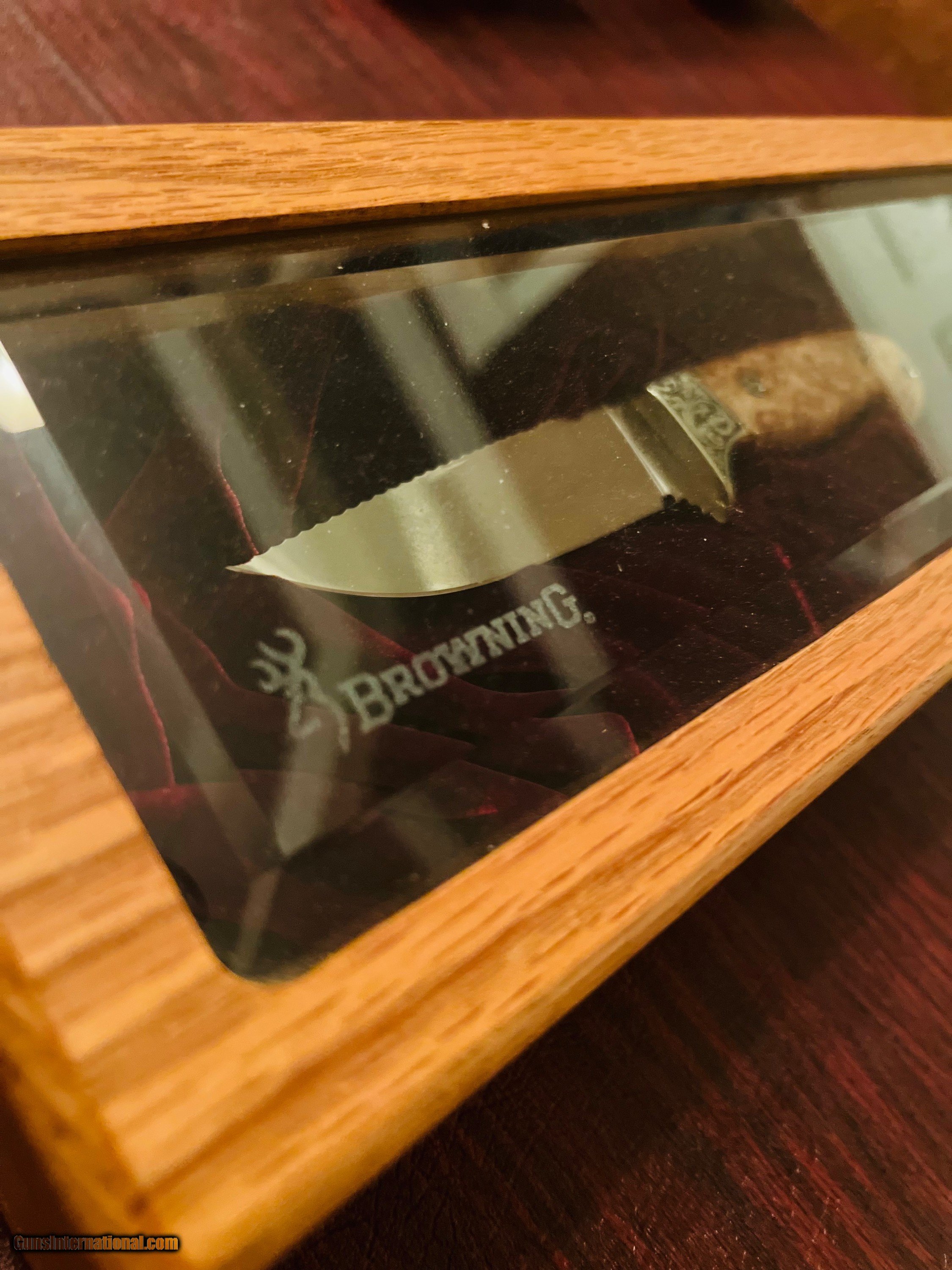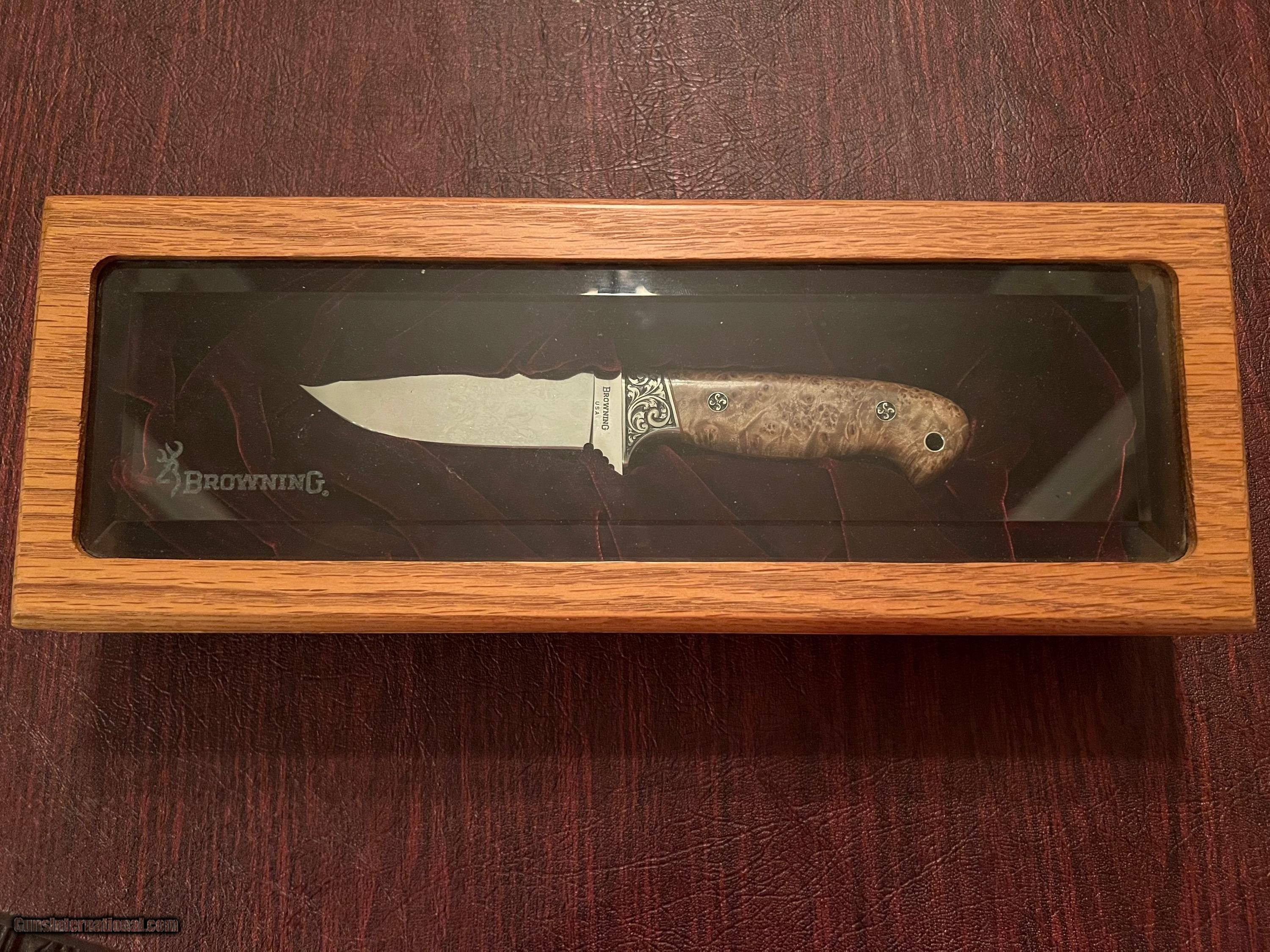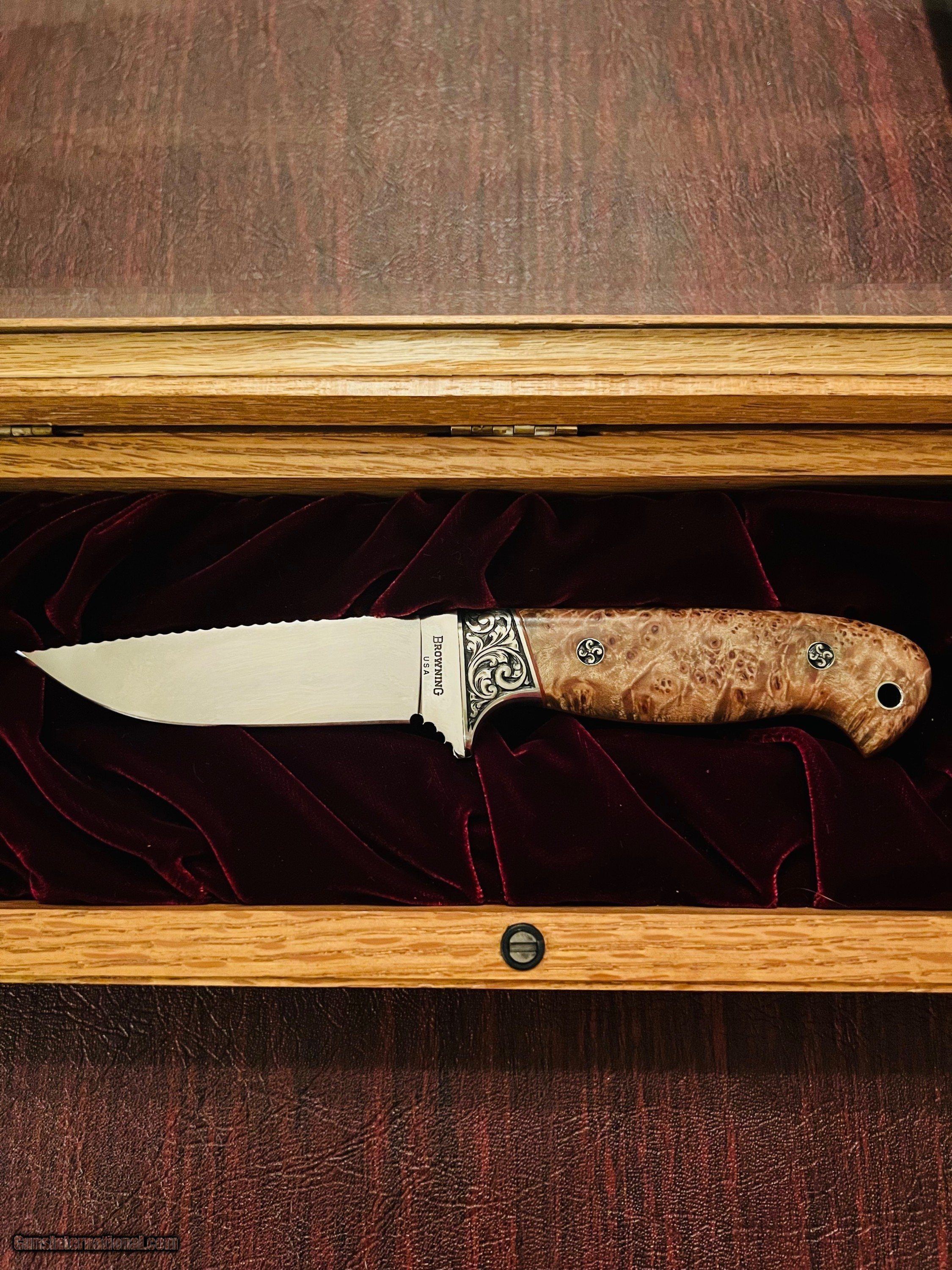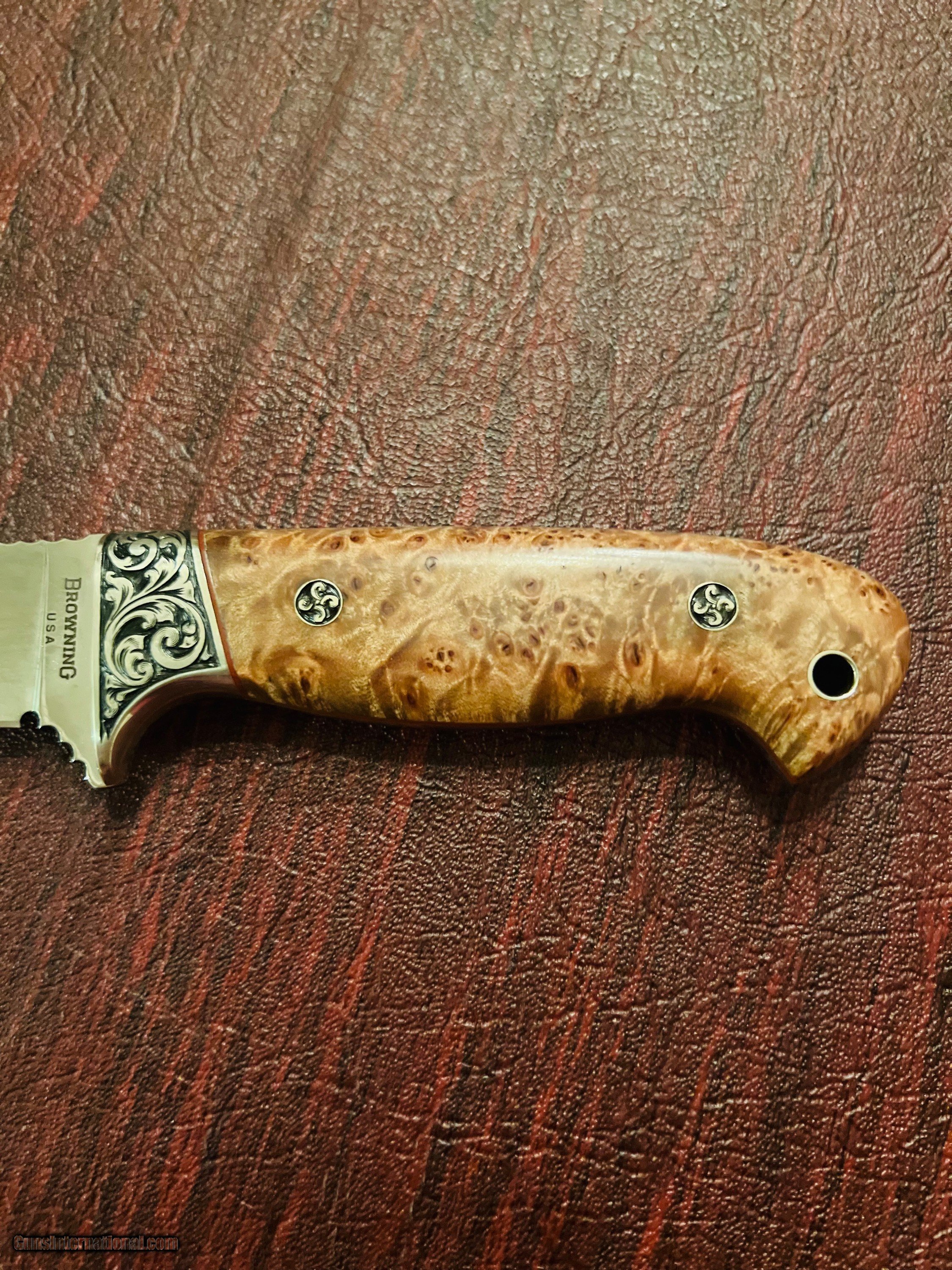 Description: This is a beautiful piece! Out of 600 ever made, this is #68! Simply stated, the model 21 Handmad knife is pure artistry. Virtually every inch of this masterpiece is hand worked and painstakingly refined to give you one of the most beautiful knives ever produced. The file marks on the back of the blade provide a rugged contrast to the sleek lines found throughout the knife.The full-lenght tang is beautifully layered between an exotic maple burl wood handle, held by hand engraved nickel silver pins and capped with a hand engraved hilt. This knife has been in a case the entire time and is in MINT condition! Hand Made in USA by the famous Knife makers Dan Harrison and Bill Schiller. This knife sits in the original wood/ glass case. Very nice collectible. NO RETURN ****** Our policy in regard to No Inspection/ No Return is as follows: We now feel with the pictures we provide for each gun in our inventory ( in which you can expand something as small as a pin head to fit your entire screen) you can see of the gun in its complete entirety and get a very good view of the quality of the gun on the internet. When we first started dealing in guns years ago, you’d have to rely on our description over the phone, that’s now no longer the case. If there’s a major error that we missed, we’d of course take the gun back. But we do feel from the pictures and online descriptions that you should be able to determine from this information if you’d like to purchase the gun. SOLD |