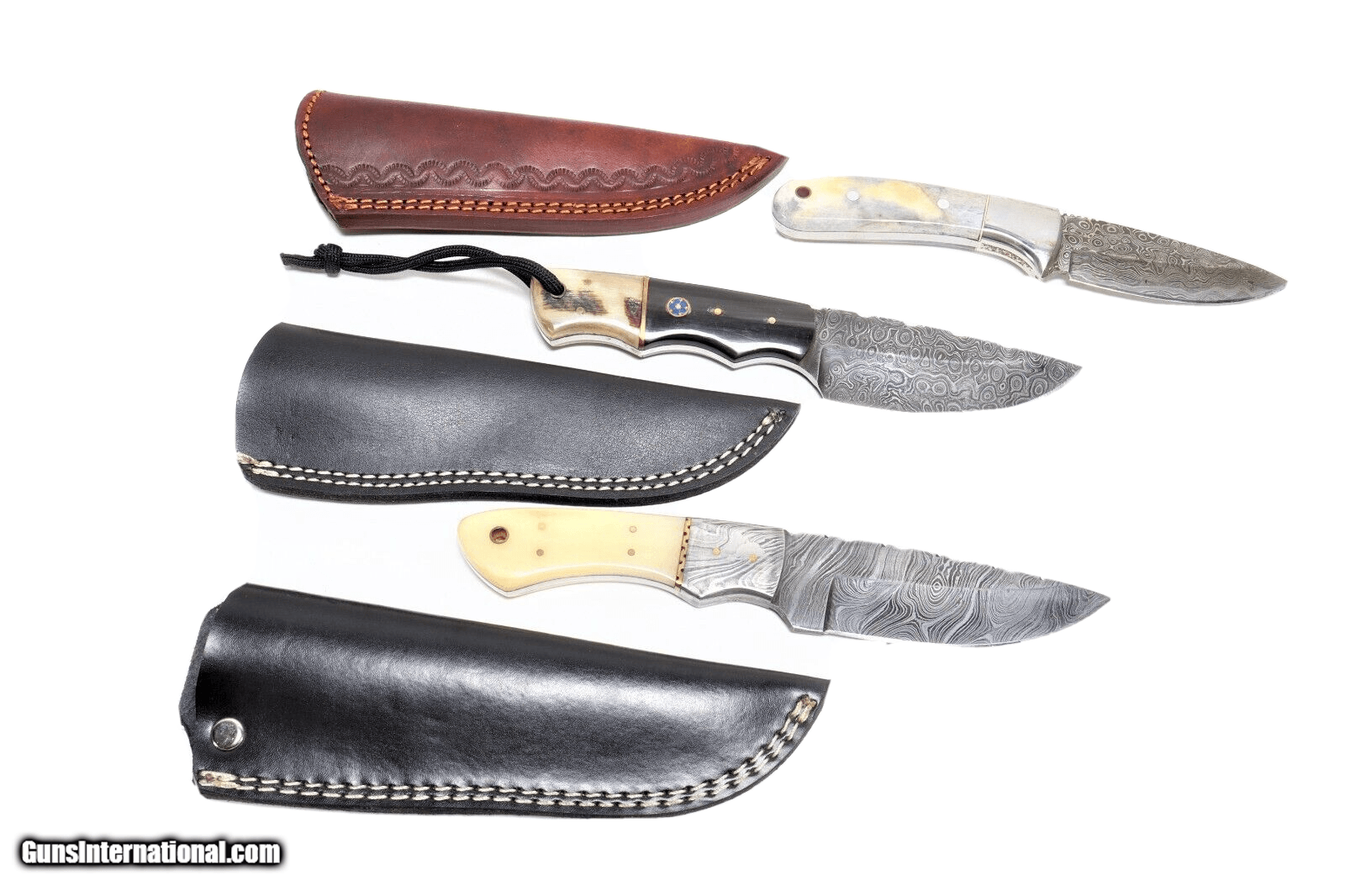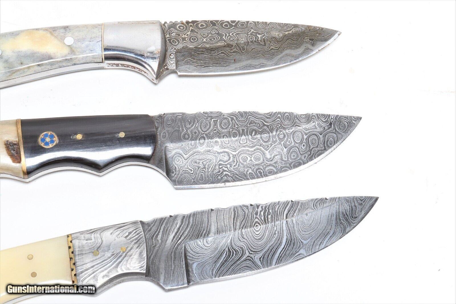 Description: Set of three Damascus steel knives. All with bone or faux bone handles, one with layered wood, brass, and fiber with decorative pins in handle. All with hole for cord at bottom, and all with decorative grip serrations on top. All drop point blades. Well made, but all likely Pakistan made knives. All unmarked. All with leather sheaths. Great additions to a hunting knife collection or for continued use in a hunting, camping, or outdoor sport gear kit. Size: Longest blade 4 1/4"L, shortest 3 3/4" Family Owned & Operated Cisco’s Gallery deals in the rare, exceptional, and one-of-a-kind pieces that define the history of America and the Old West. Our pieces range from American Indian to Cowboy Western and include original items of everyday life, commerce, art, and warfare that tamed America’s frontier. Our 14,000 square foot gallery opened in 1996 in beautiful Coeur d’Alene, Idaho. Personal Service Cisco’s operates on old fashioned values – honesty and integrity, and all of our items are backed by our money back guarantee. We appreciate the opportunity to earn your business. Whether you desire assistance with a jewelry purchase, choosing a gift, identification, or even selling – we hope to be your trusted source. SOLD |
