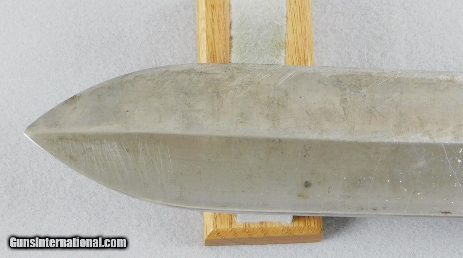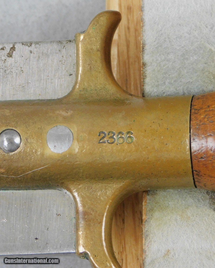 Description: This is a U.S. Springfield Model 1880 hunting knife with an original Watervaliet Arsenal hook scabbard. The knife is serial number 2366 and is in very fine condition. The wood is very nice with only a small nick on the pommel. The leather scabbard in very good condition but has two initials scratched on it. All stitching is very good. I would consider trades for pre 1899 ANTIQUE PISTOLS and rifles on any of my items.. WHAT DO YOU HAVE TO TRADE? Ask about our 30-90 day lay-away program. We accept Bank Check, Money order, Personal checks or wire transfer. SOLD |